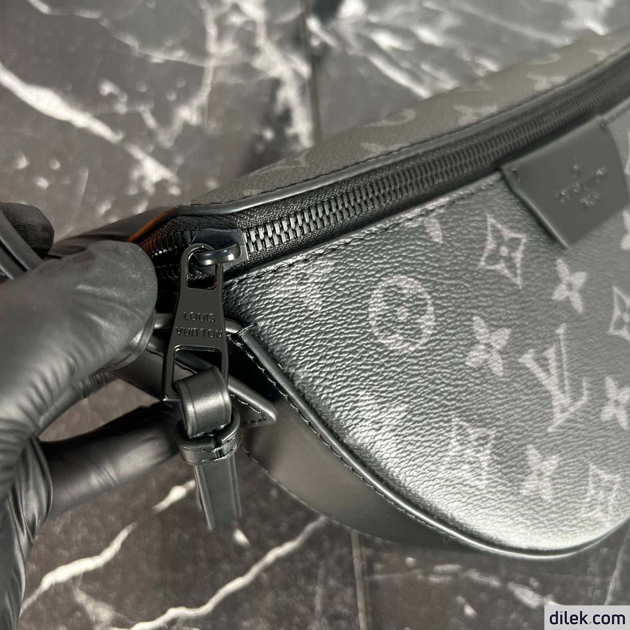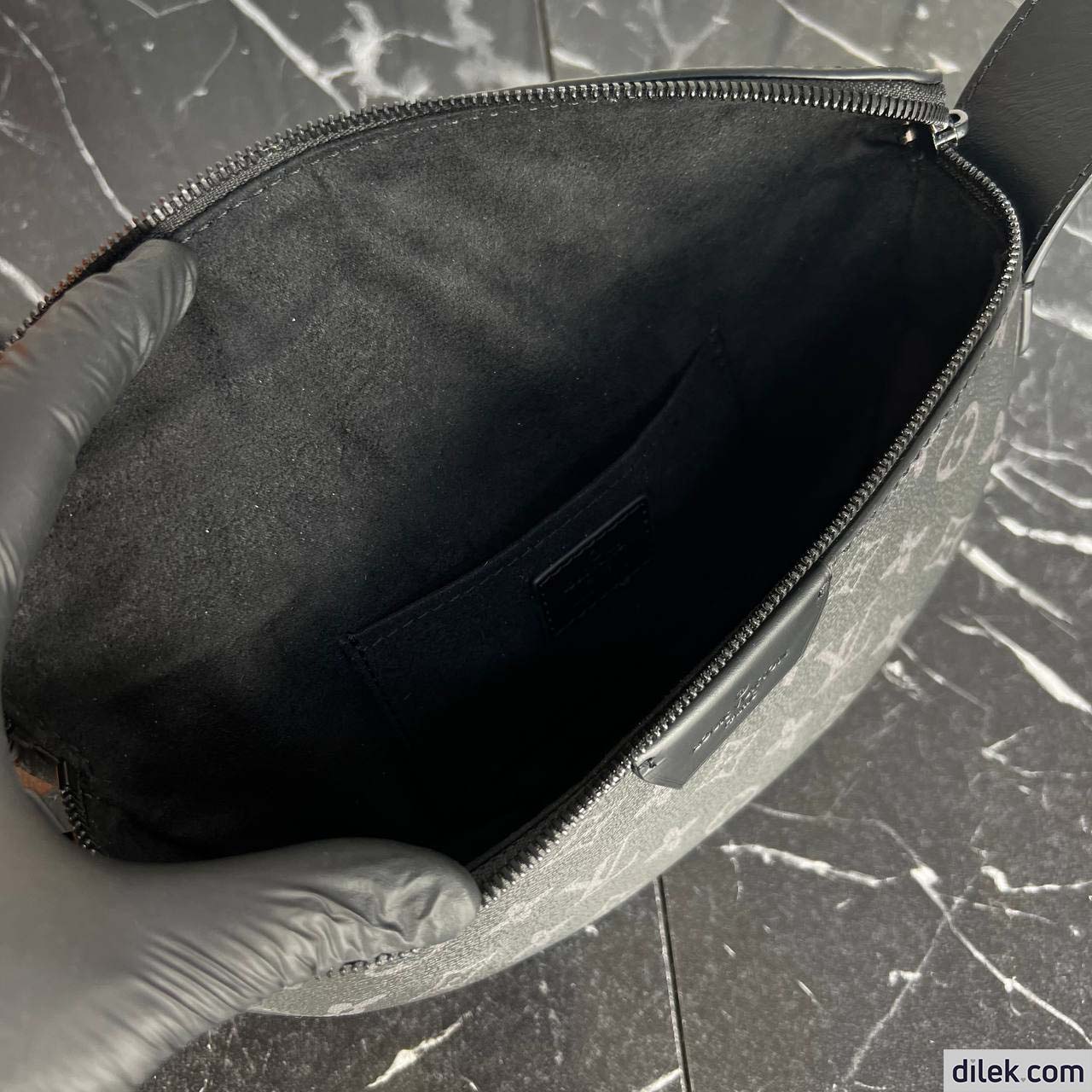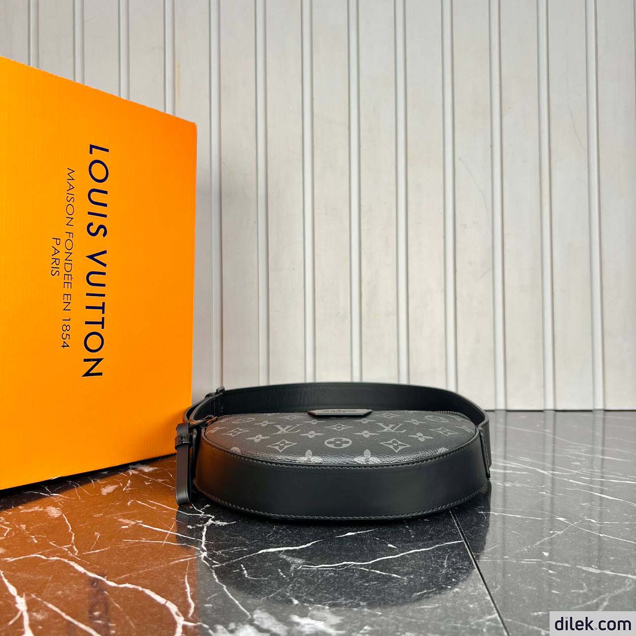 The LV Moon Crossbody bag is made from Monogram Eclipse coated canvas with black-leather trim and strap, giving it a masculine sophistication. The bag’s half-moon shape makes it comfortable to wear, whether across the front of the back of the body. It can easily fit a phone, small wallet, and earphones.
