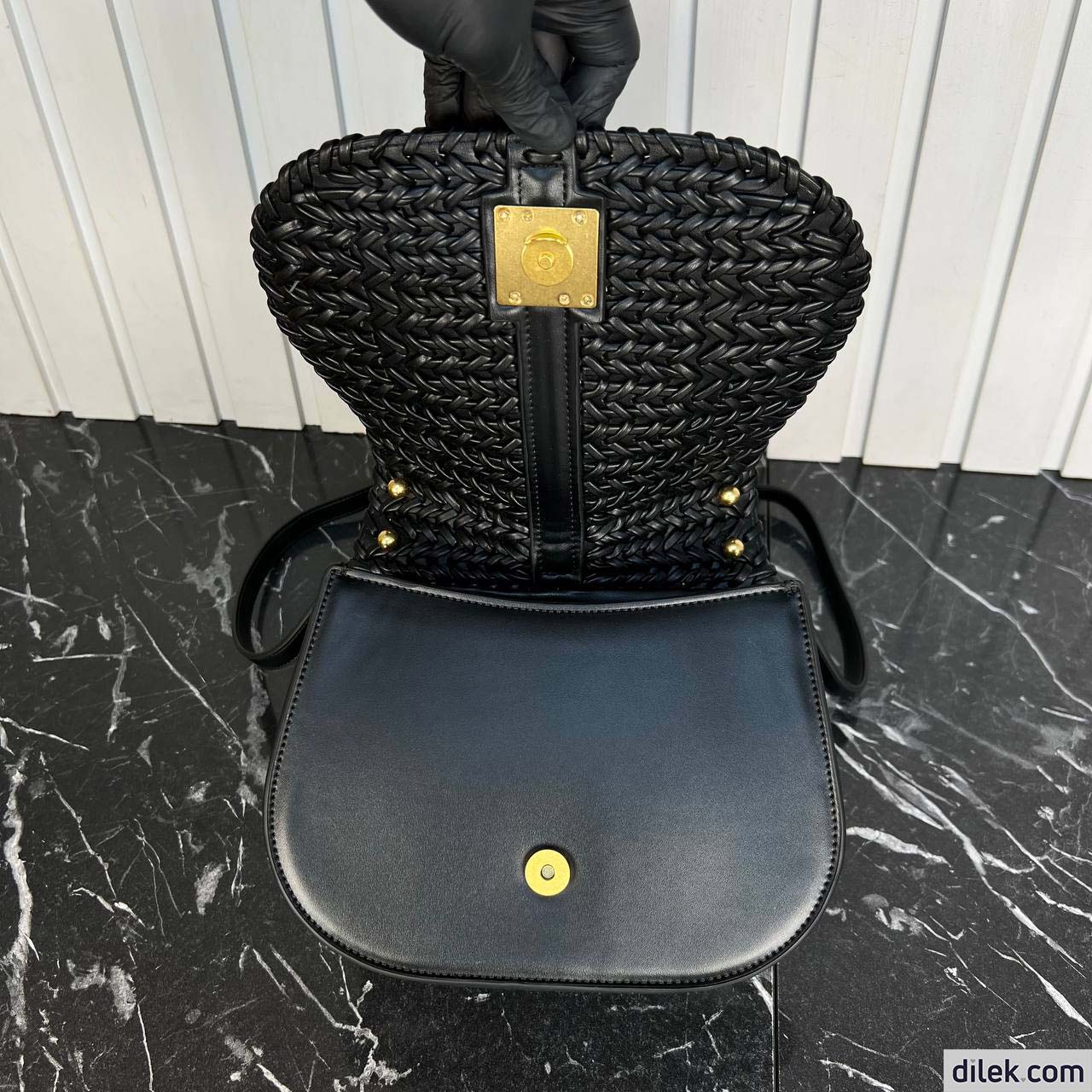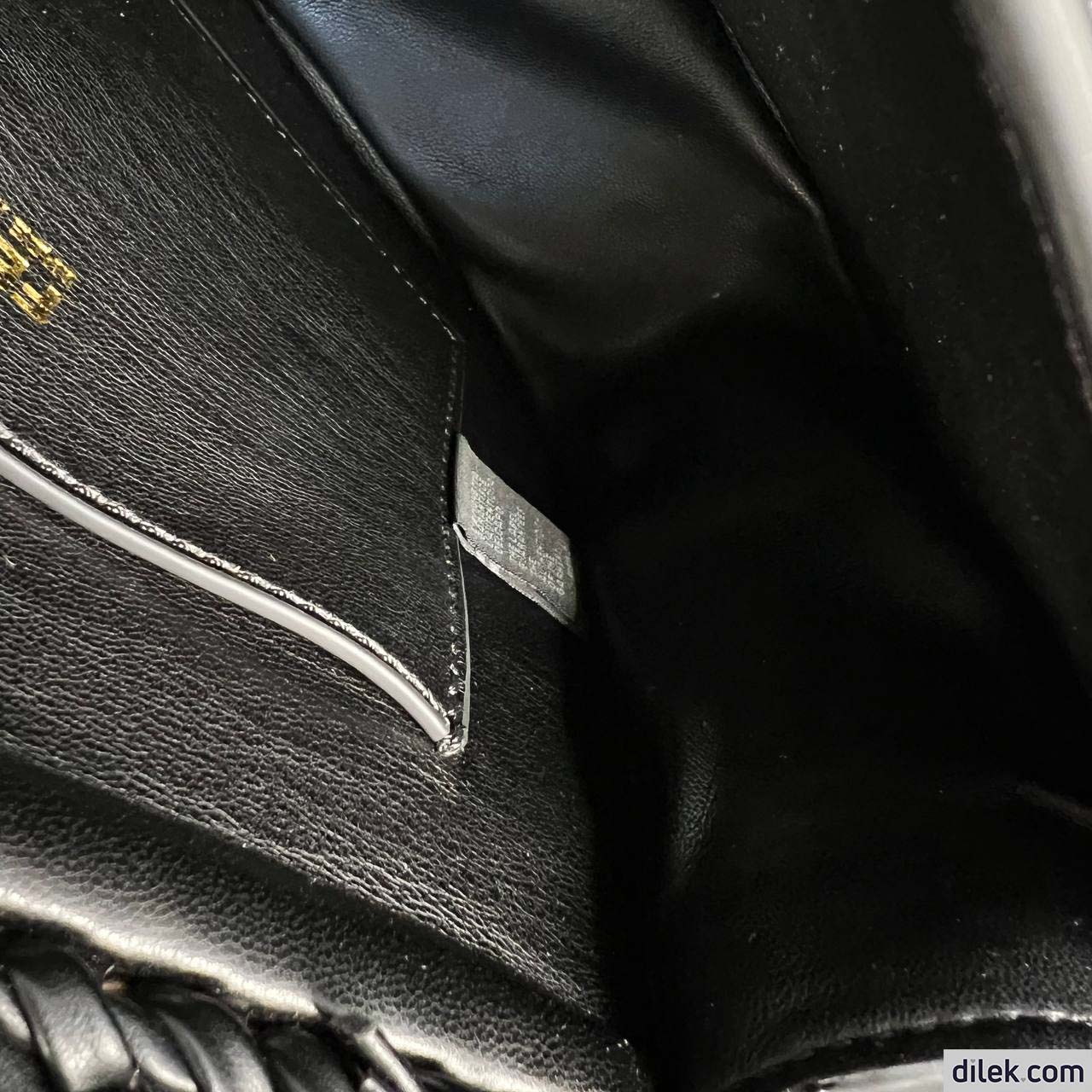 Small satchel bag with curved, feminine lines made of black leather. Embellished with embossed details and edges and an FF logo on the flap. Magnetic clasp. Flat pocket on back. Lined interior with flat pocket and vintage gold finish metalware. Features an adjustable and detachable shoulder strap. The shoulder strap hooks become an elegant accent with studs and an FF logo when the bag is open.
