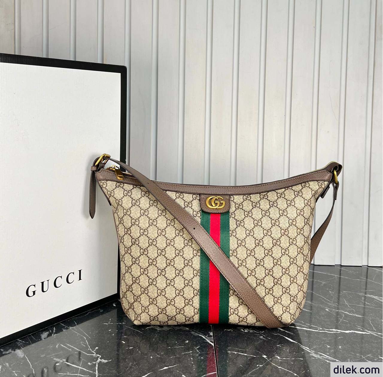 A classic combination of the House's most recognizable elements the GG motif and Web stripe the world of Ophidia continues to evolve, incorporating new shapes and silhouettes. The half-moon design mixes emblematic references with the unique charms of the crossbody bag, a popular Gucci model since the late '50s. Crafted in GG Supreme canvas, it's trimmed with textured leather and topped with Double G hardware.
