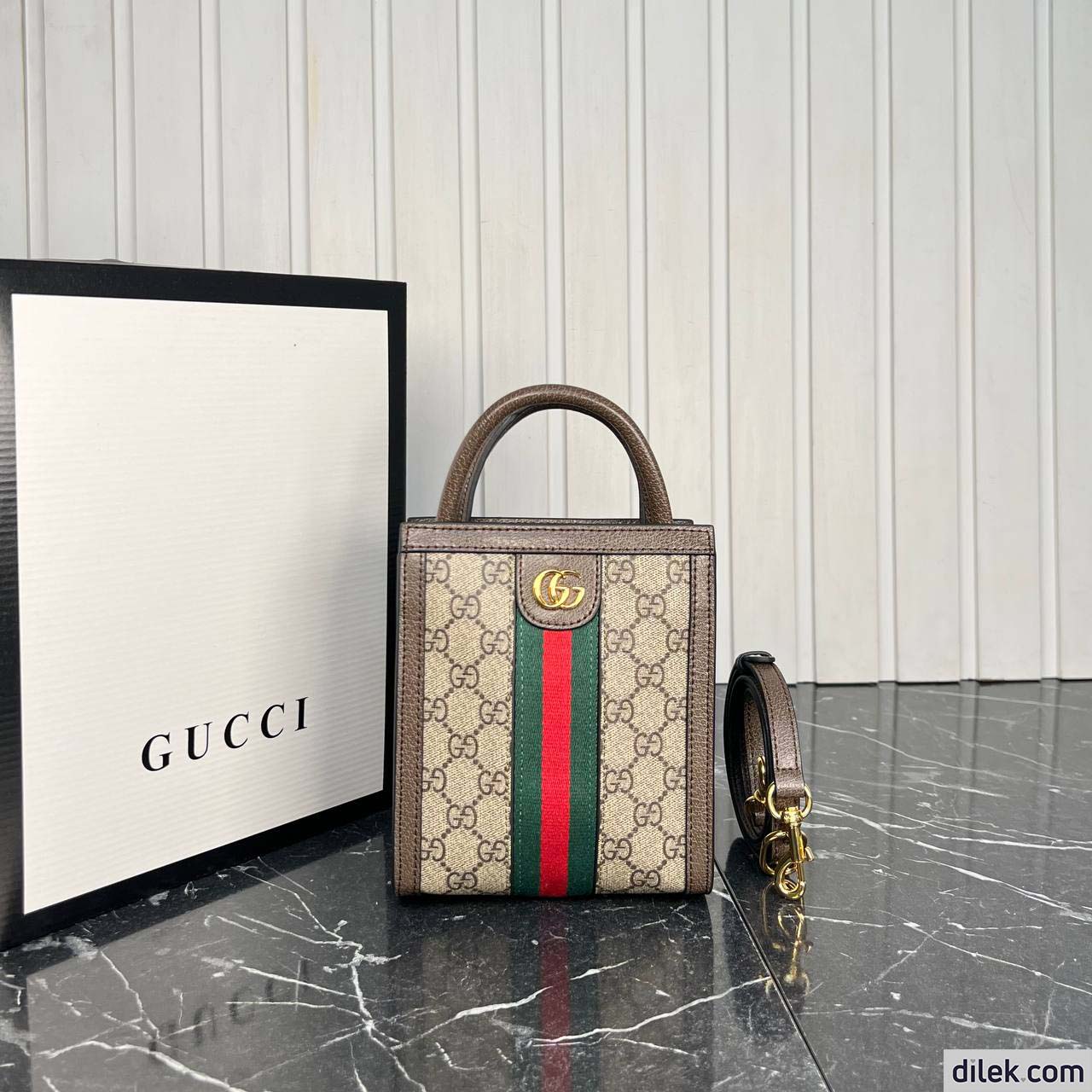 The Ophidia line is further elevated through new sizes and styles including a square-shaped version with single top handle and a domed silhouette with double handle. This super mini bag appears as part of the line with an elongated shape, complete with well-known features such as the Web and Double G.