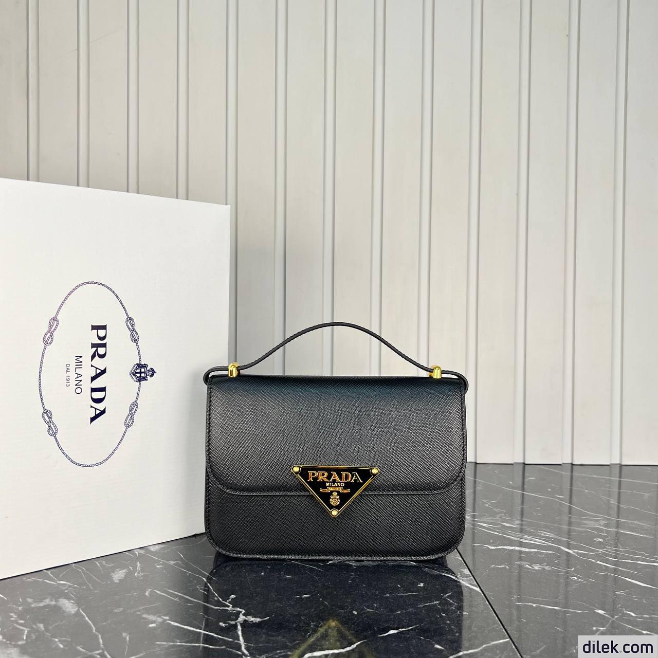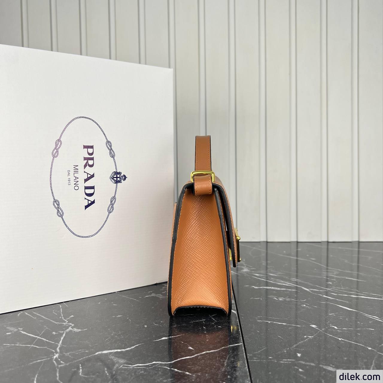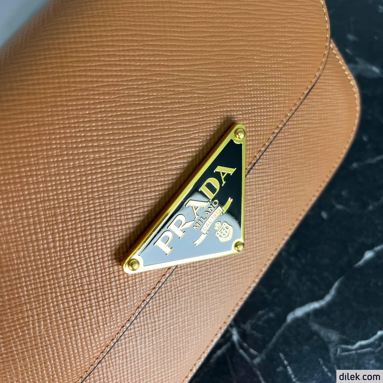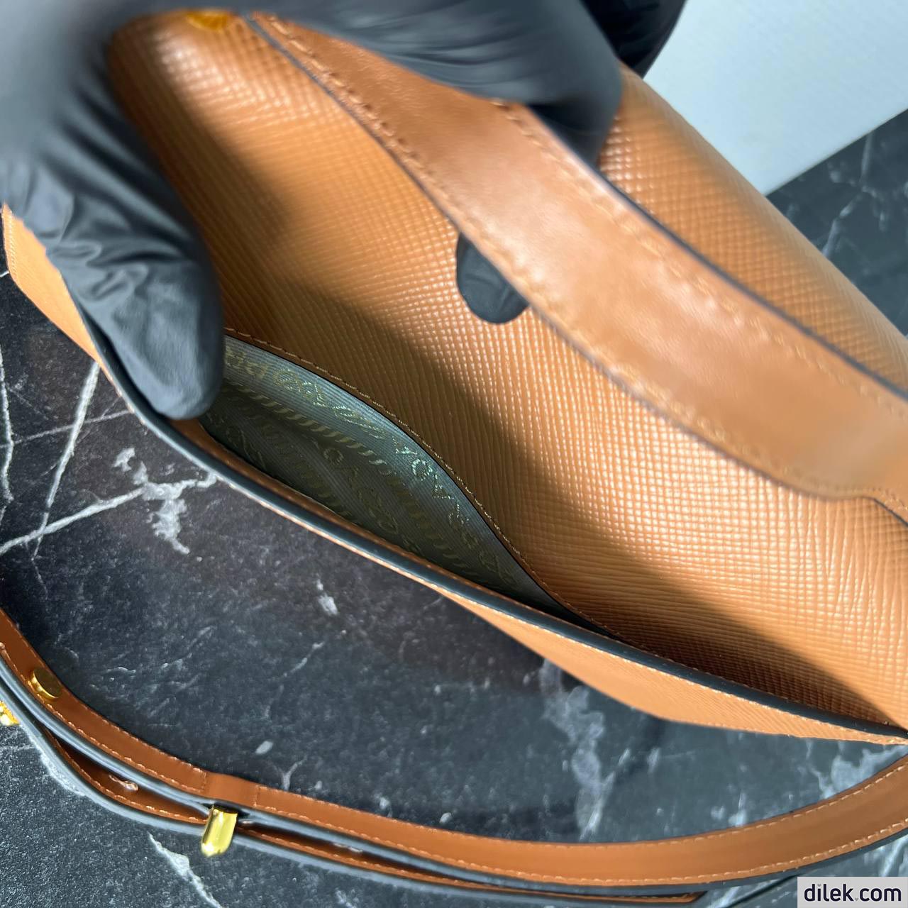 This shoulder bag with a structured, classic design is made of Saffiano leather, an iconic material of the brand distinguished by its crosshatch texture and waxed finish. The triangle logo, first introduced on trunks designed by Mario Prada, decorates the front. The accessory provided with a handle with an original design is completed by an adjustable shoulder strap for versatile wear.