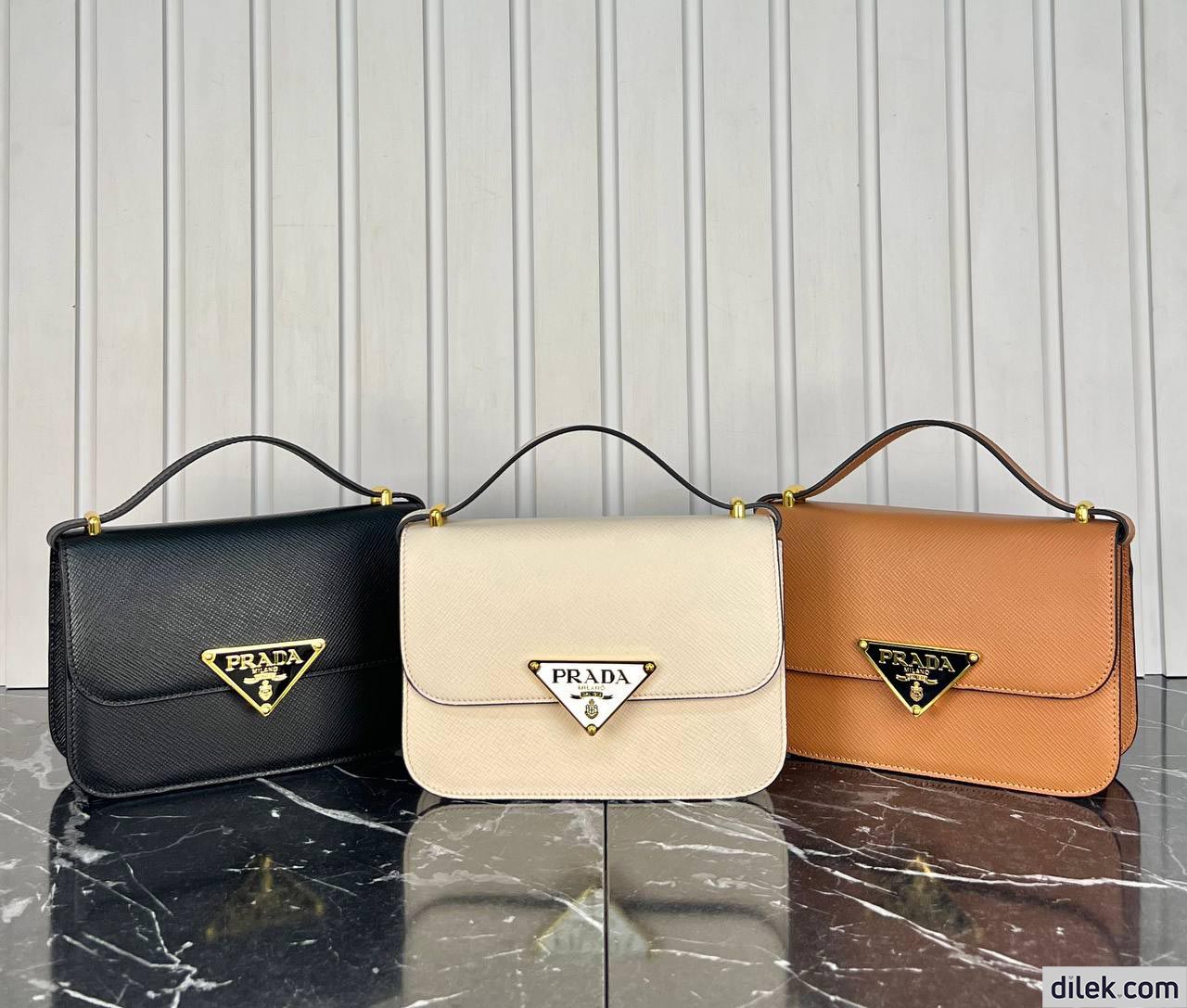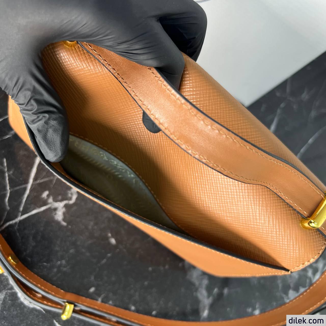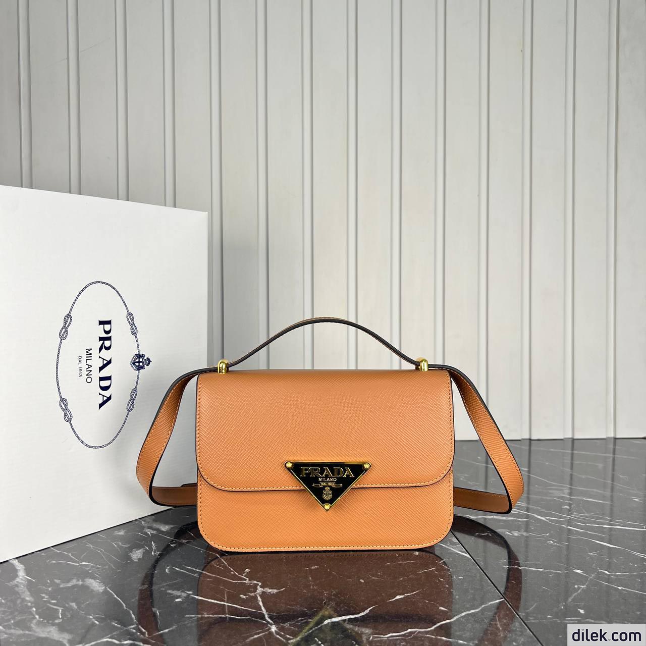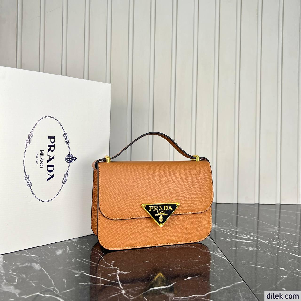 This shoulder bag with a structured, classic design is made of Saffiano leather, an iconic material of the brand distinguished by its crosshatch texture and waxed finish. The triangle logo, first introduced on trunks designed by Mario Prada, decorates the front. The accessory provided with a handle with an original design is completed by an adjustable shoulder strap for versatile wear.