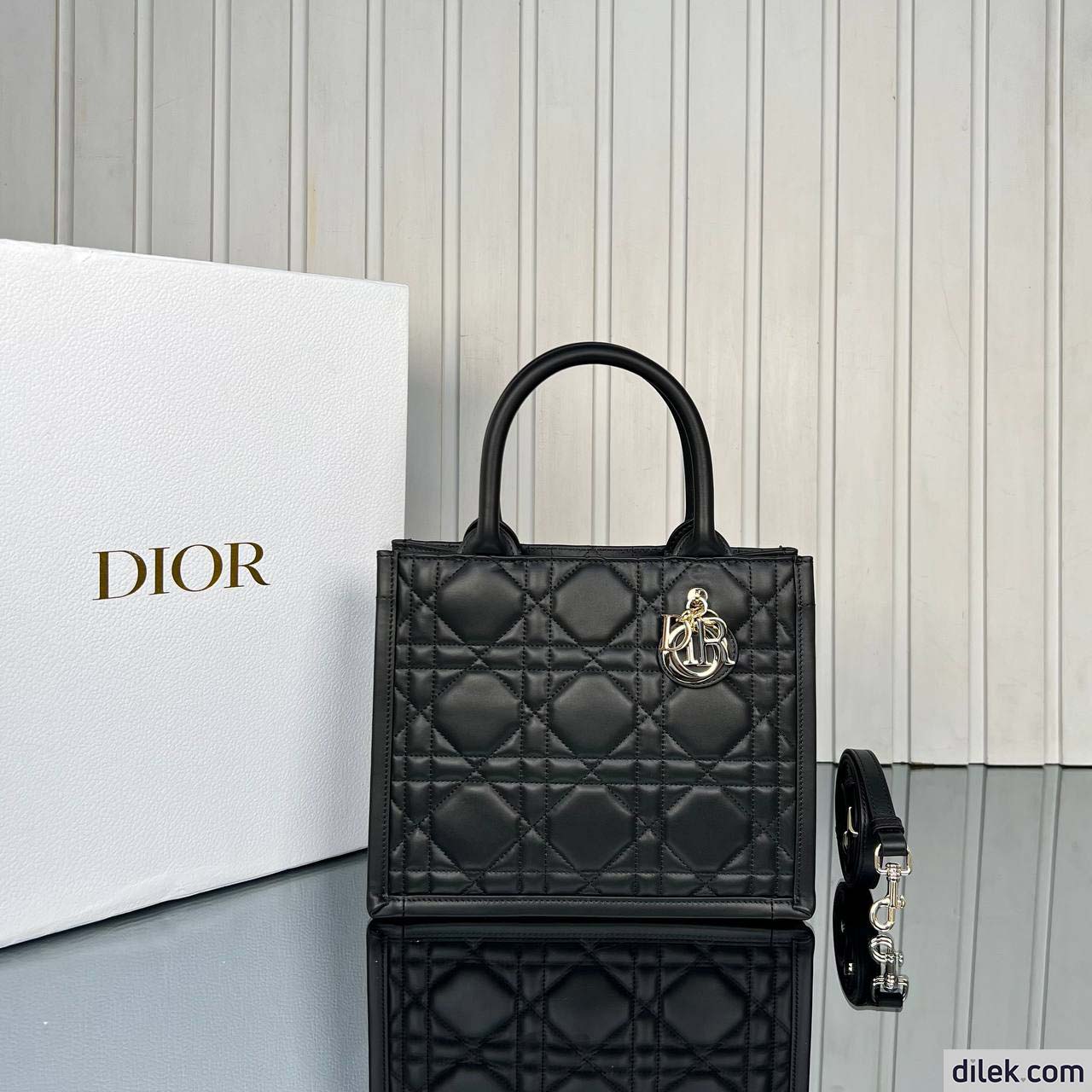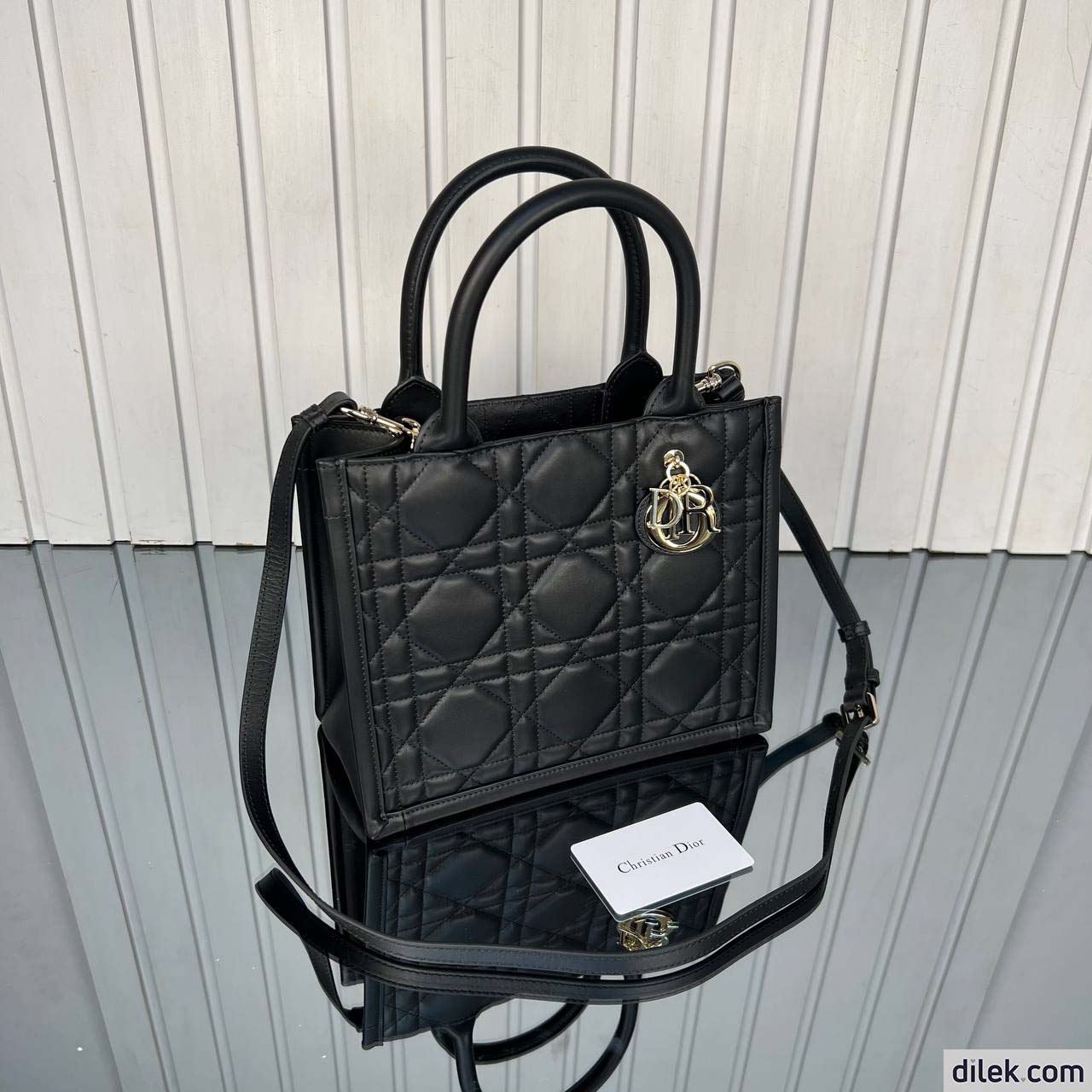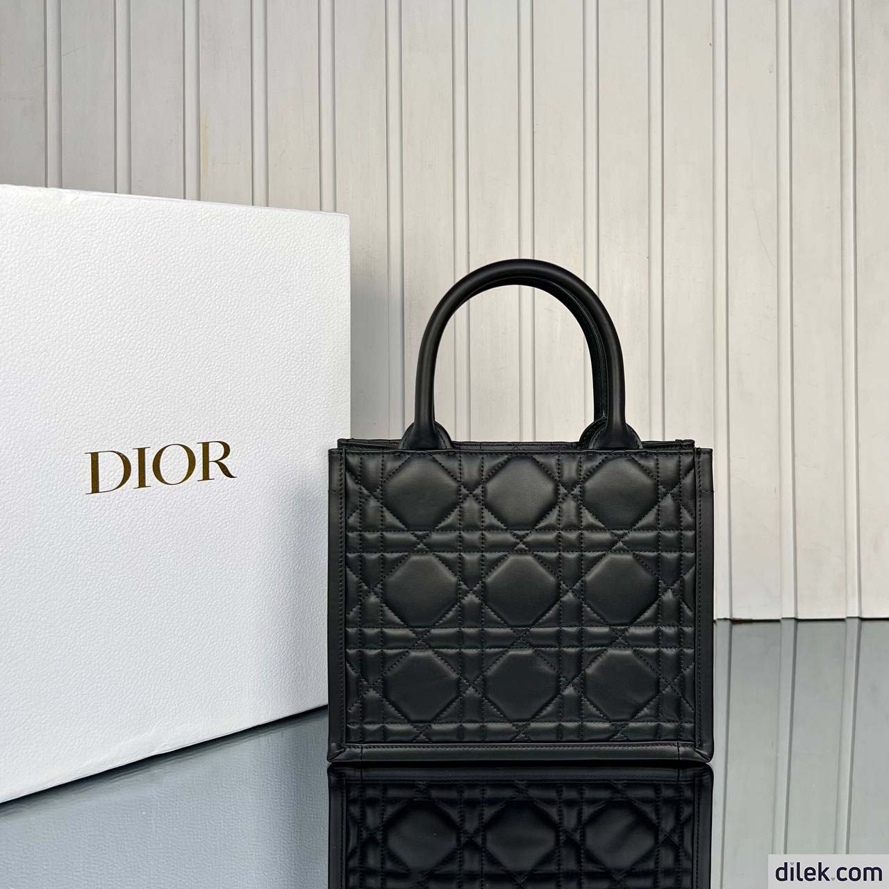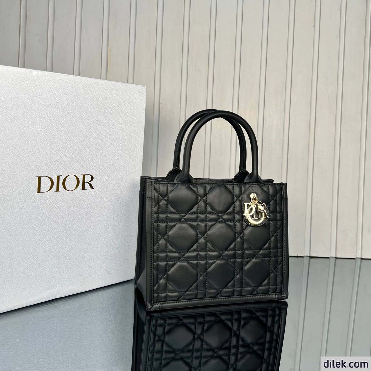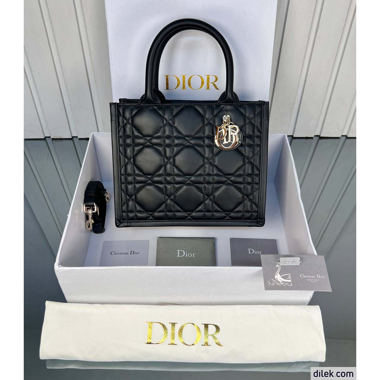 Maria Grazia Chiuri's hallmark Dior Book Tote offers an original take on elegance. Crafted in black calfskin, the design showcases the Macrocannage motif and is embellished with pale gold-finish metal D.I.O.R charms on one of the handles. The cashmere leather interior reveals a zip pocket and patch pockets, ideal for organizing all the daily essentials. Featuring an adjustable and removable strap, the lightweight and practical small tote is a prime example of Dior savoir-faire and may be carried by hand or worn over the shoulder.