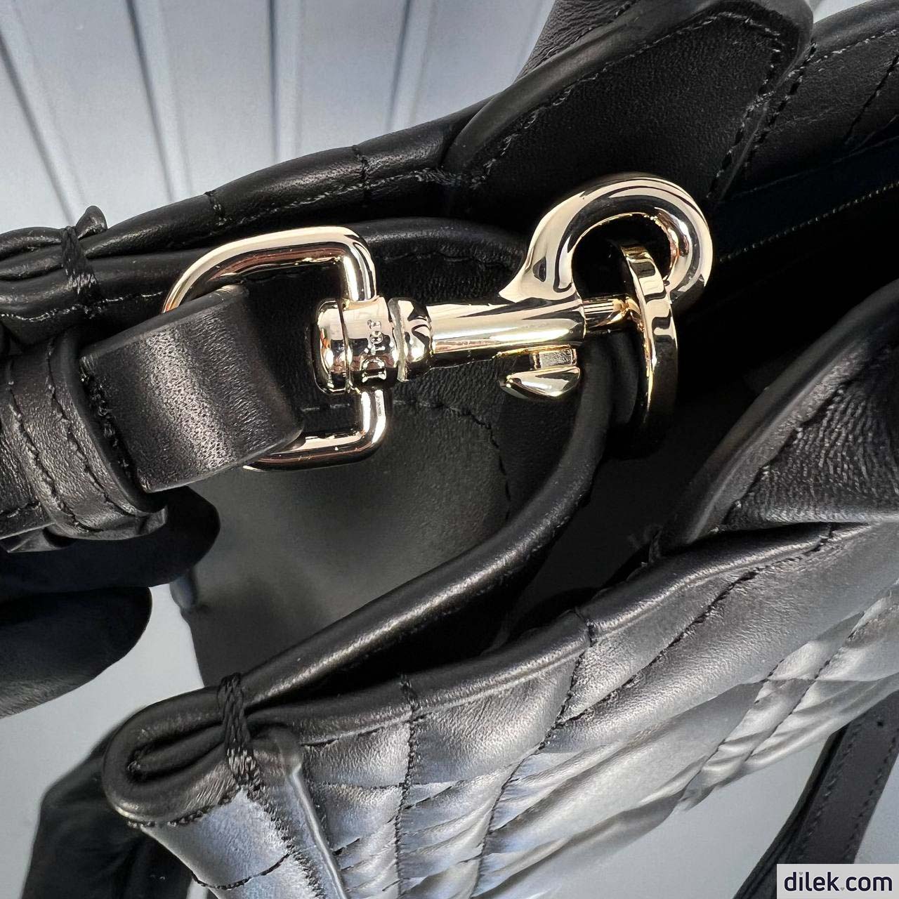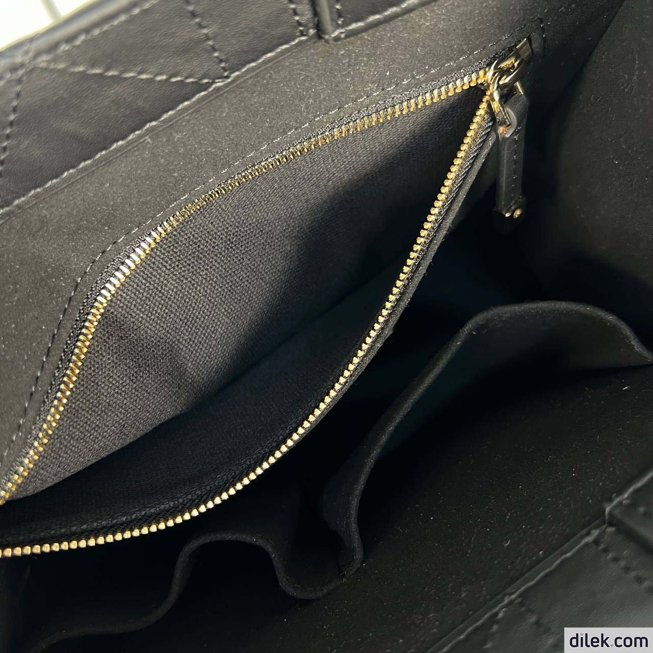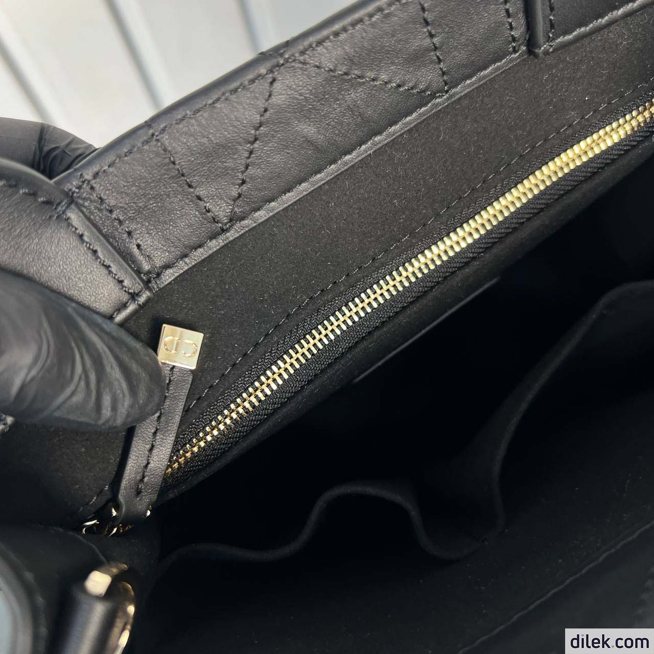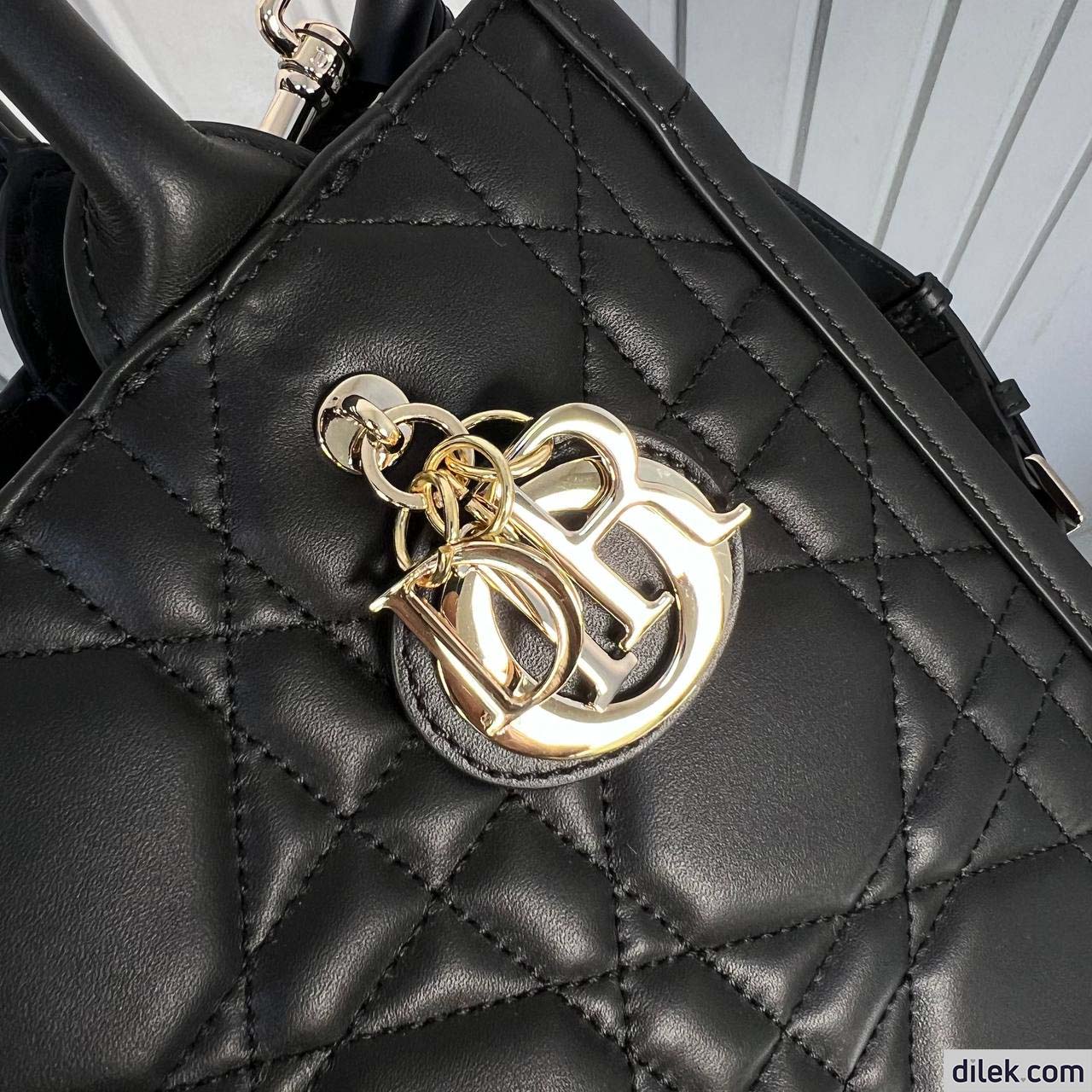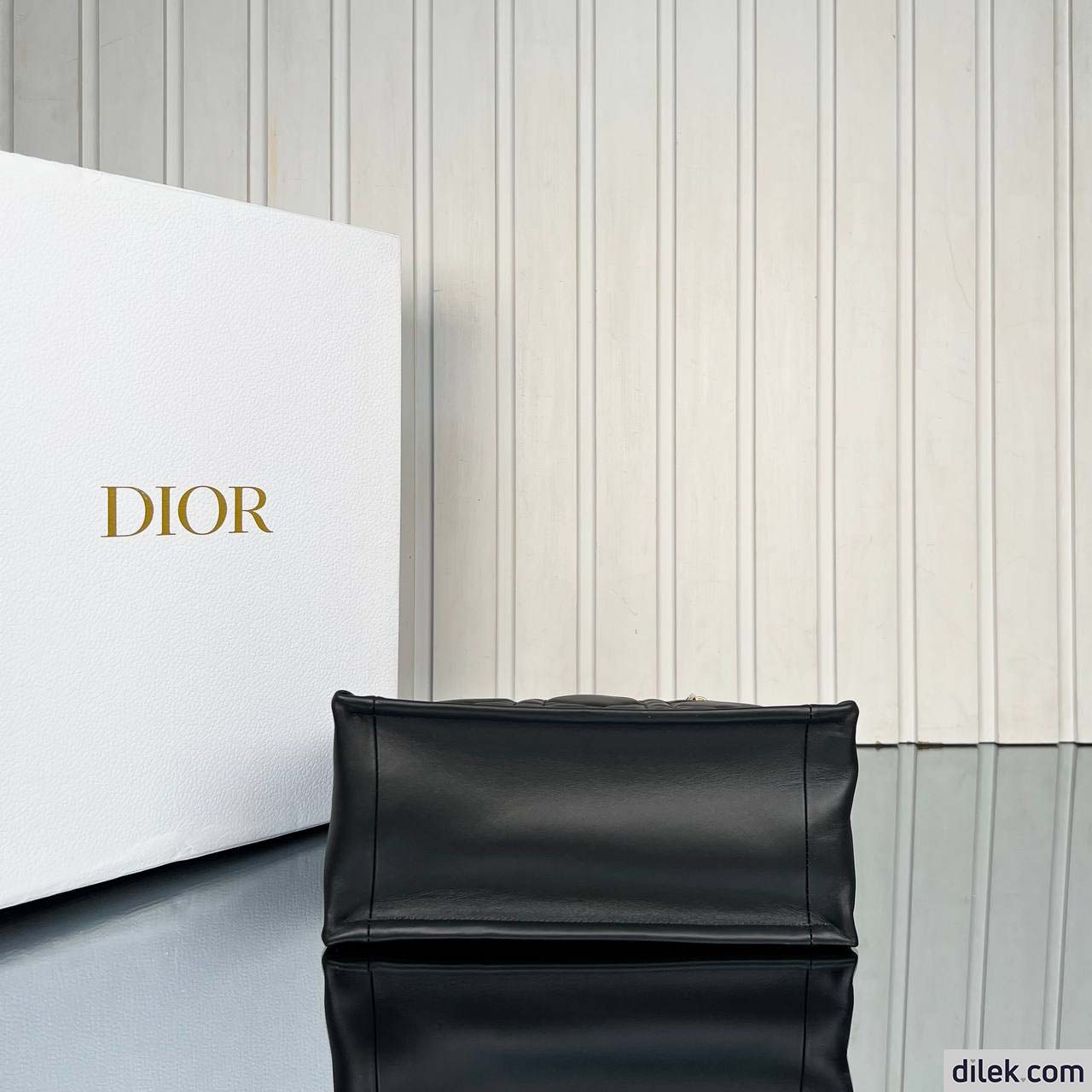 Maria Grazia Chiuri's hallmark Dior Book Tote offers an original take on elegance. Crafted in black calfskin, the design showcases the Macrocannage motif and is embellished with pale gold-finish metal D.I.O.R charms on one of the handles. The cashmere leather interior reveals a zip pocket and patch pockets, ideal for organizing all the daily essentials. Featuring an adjustable and removable strap, the lightweight and practical small tote is a prime example of Dior savoir-faire and may be carried by hand or worn over the shoulder.