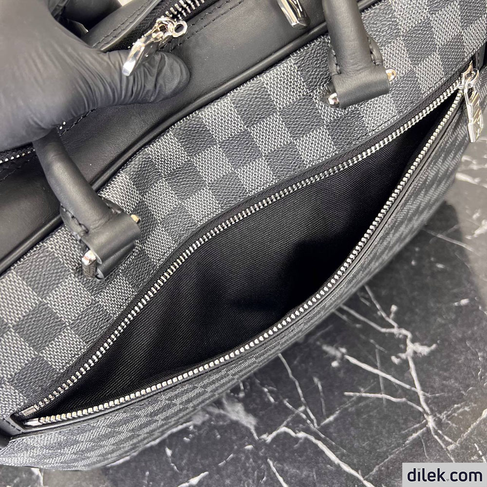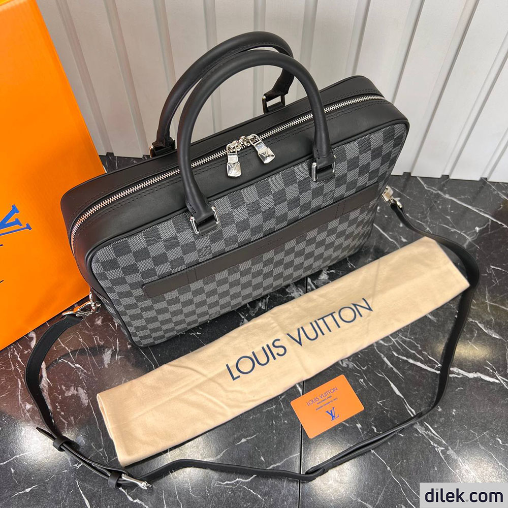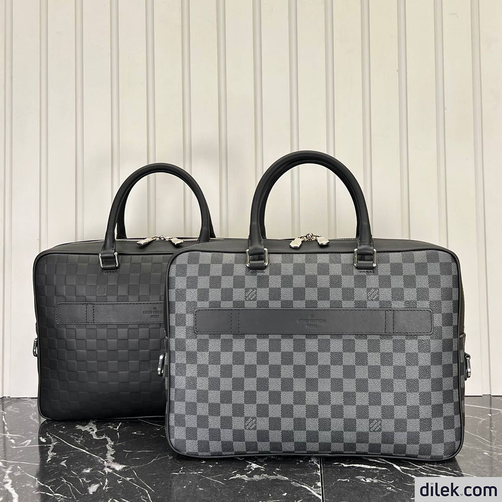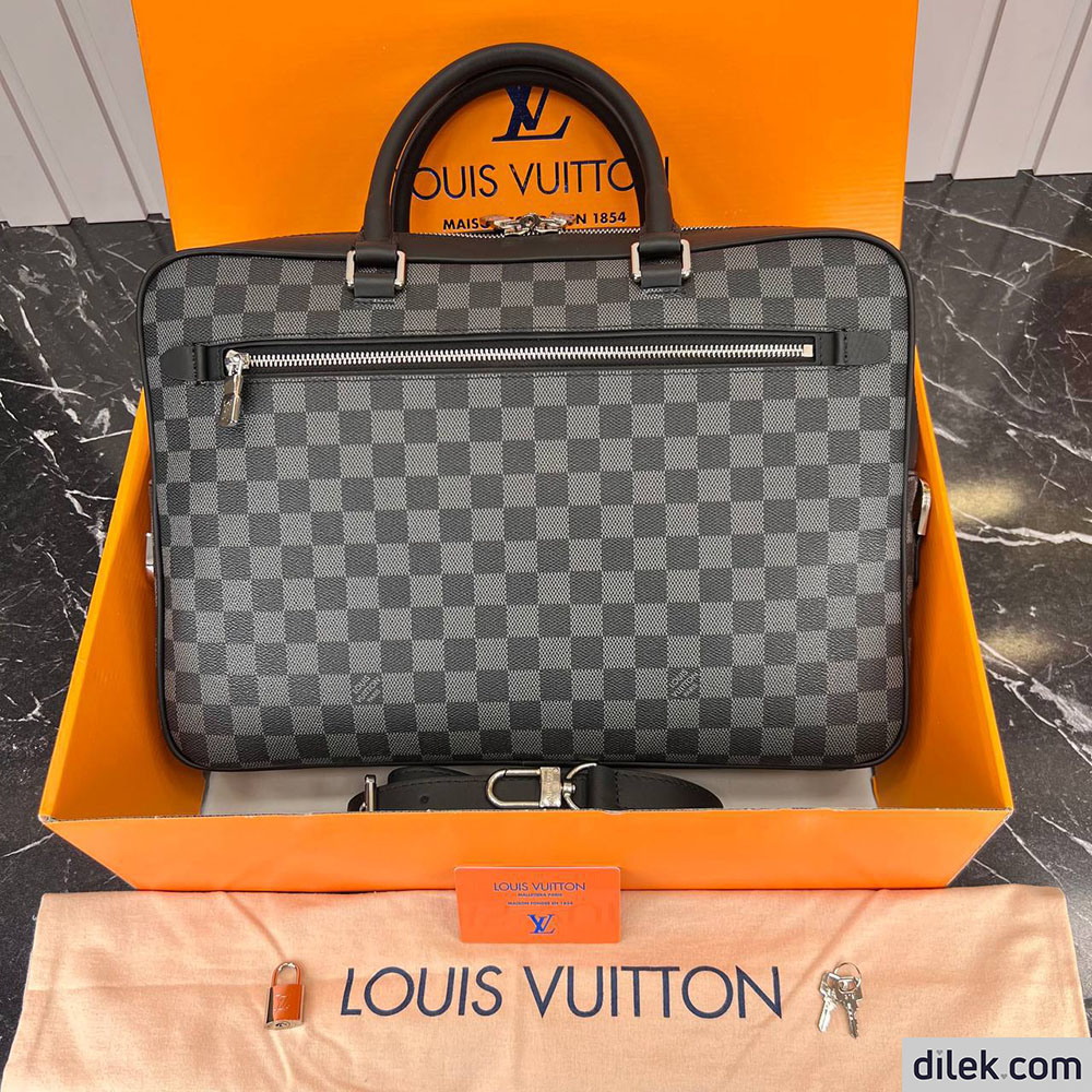 The Porte-Documents Jour in arresting Damier Graphite canvas is a more compact and casual version of the Porte-Documents Voyage. For the city-dwelling man, this is a highly practical bag, with its multiple carry options, its very practical zippered pocket in the front and enough room to easily carry a 15" laptop.