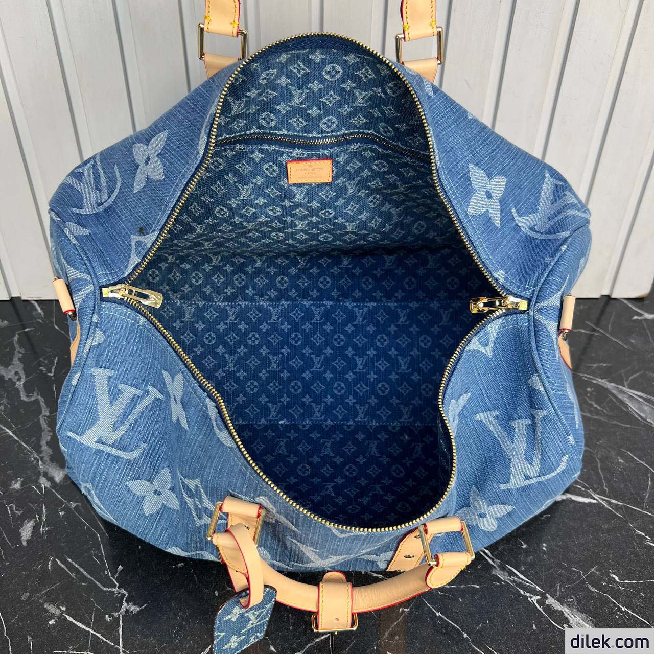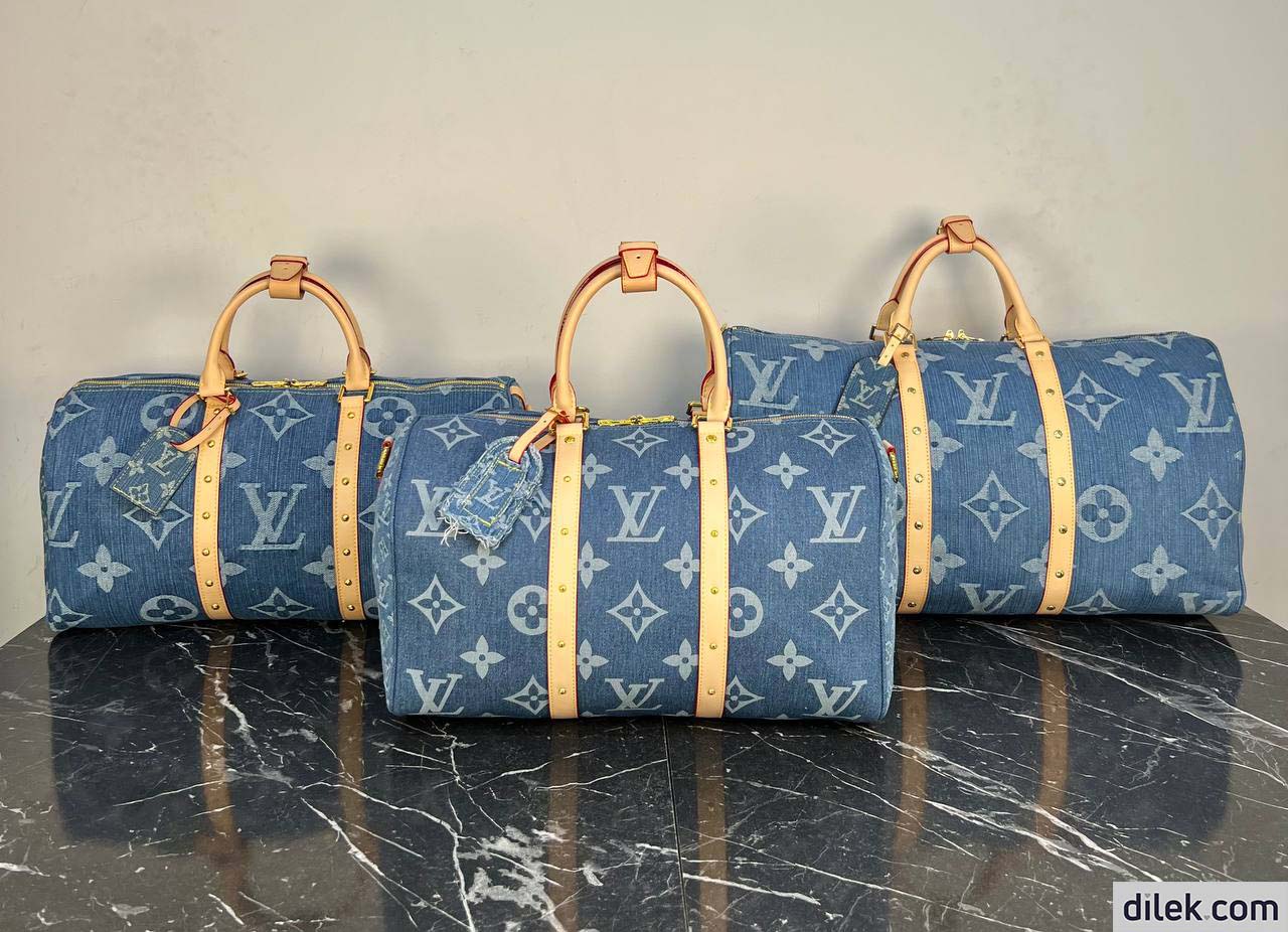The classic Keepall Bandouliere gets a sporty-chic new look with the Monogram Denim theme. The House’s famous Monogram pattern is printed on certified organic canvas the color of blue jeans, creating an eye-catching contrast with the natural cowhide trim. Complete with a padlock and a removable strap, this spacious bag is ideal as a carry-on or for short trips.