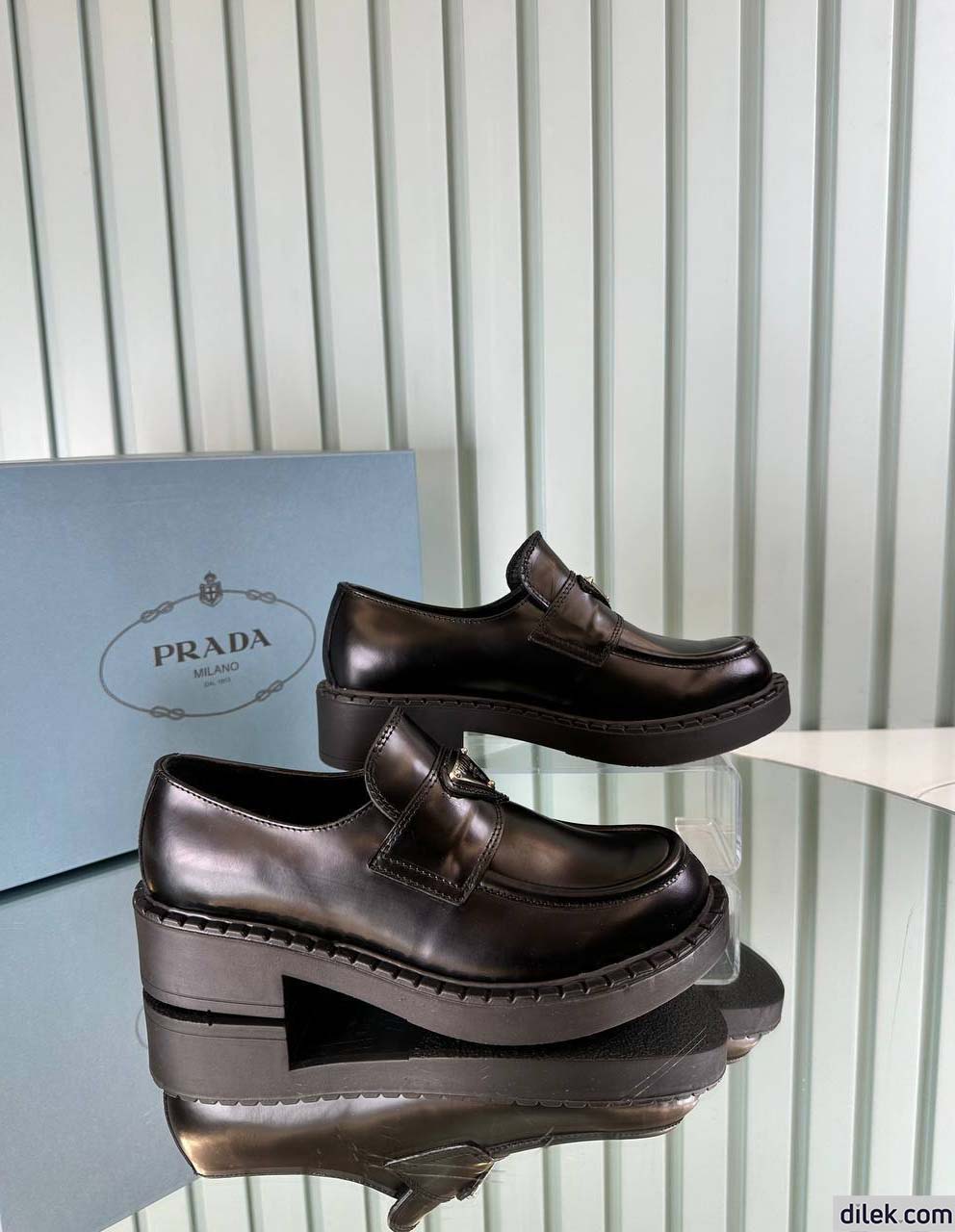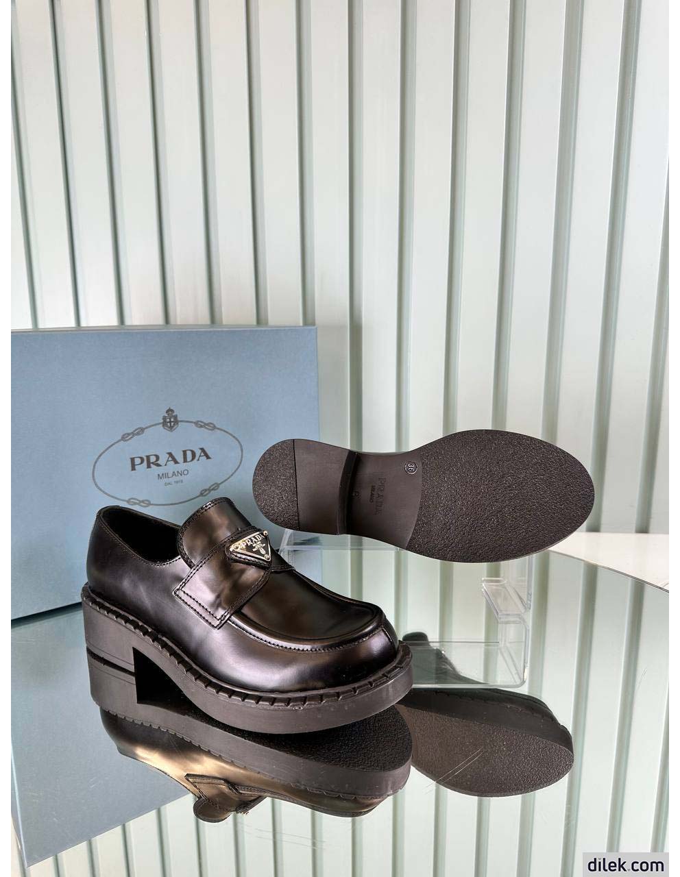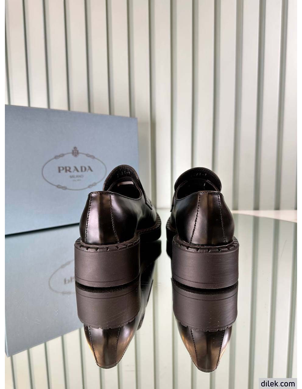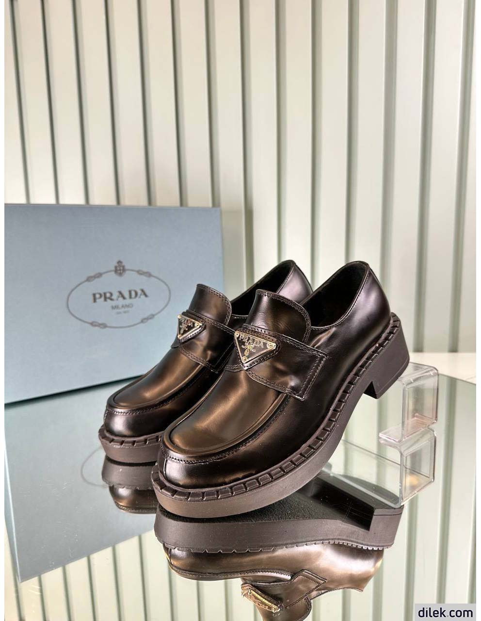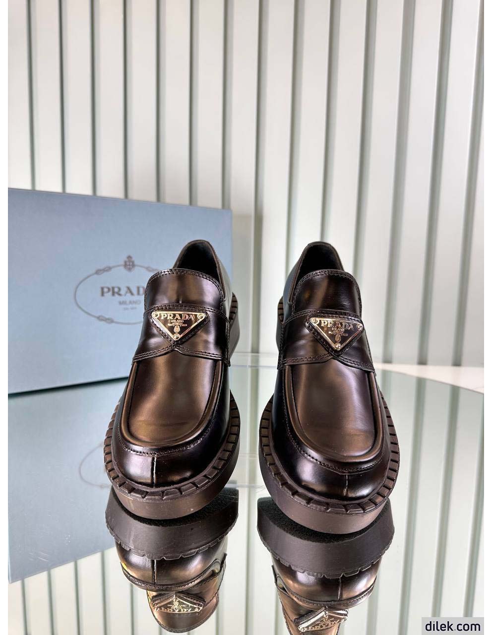 Emphasized by the iconic enameled triangle logo, these retro-inspired loafers are made of brushed leather, traditionally used in classic fine footwear and reinterpreted in Prada collections on unexpected designs for a hybrid result that reflects the duality of the brand. The notched effect of the welt around the shoe gives it a handcrafted touch.