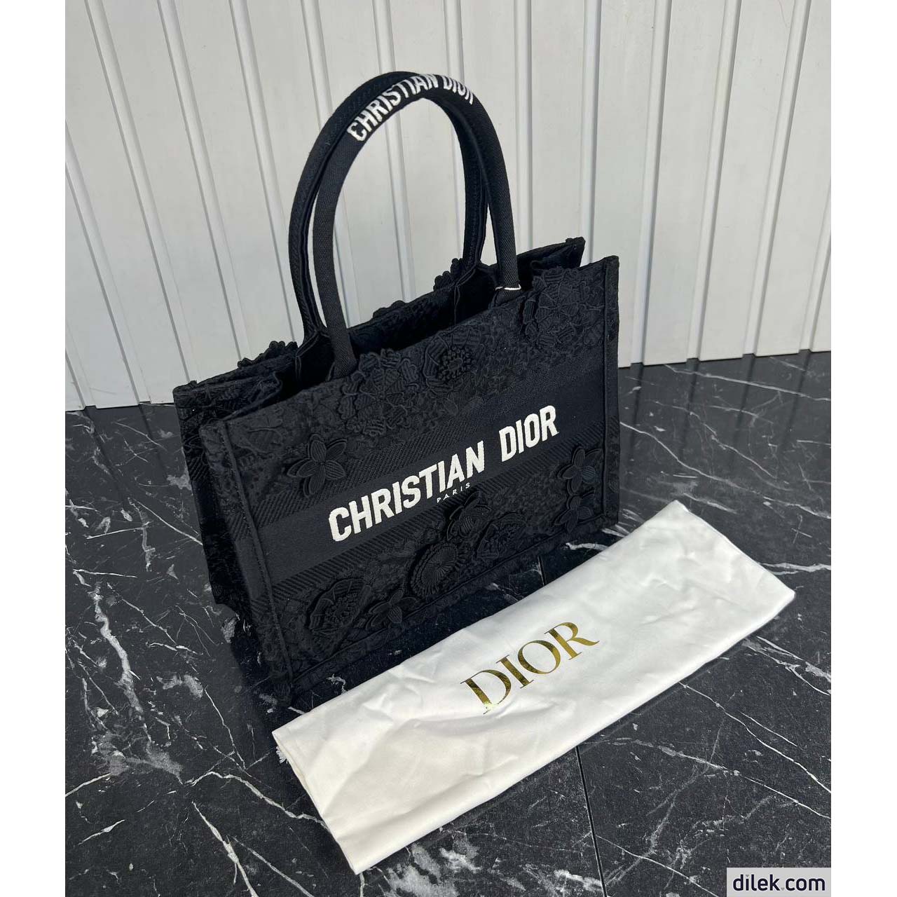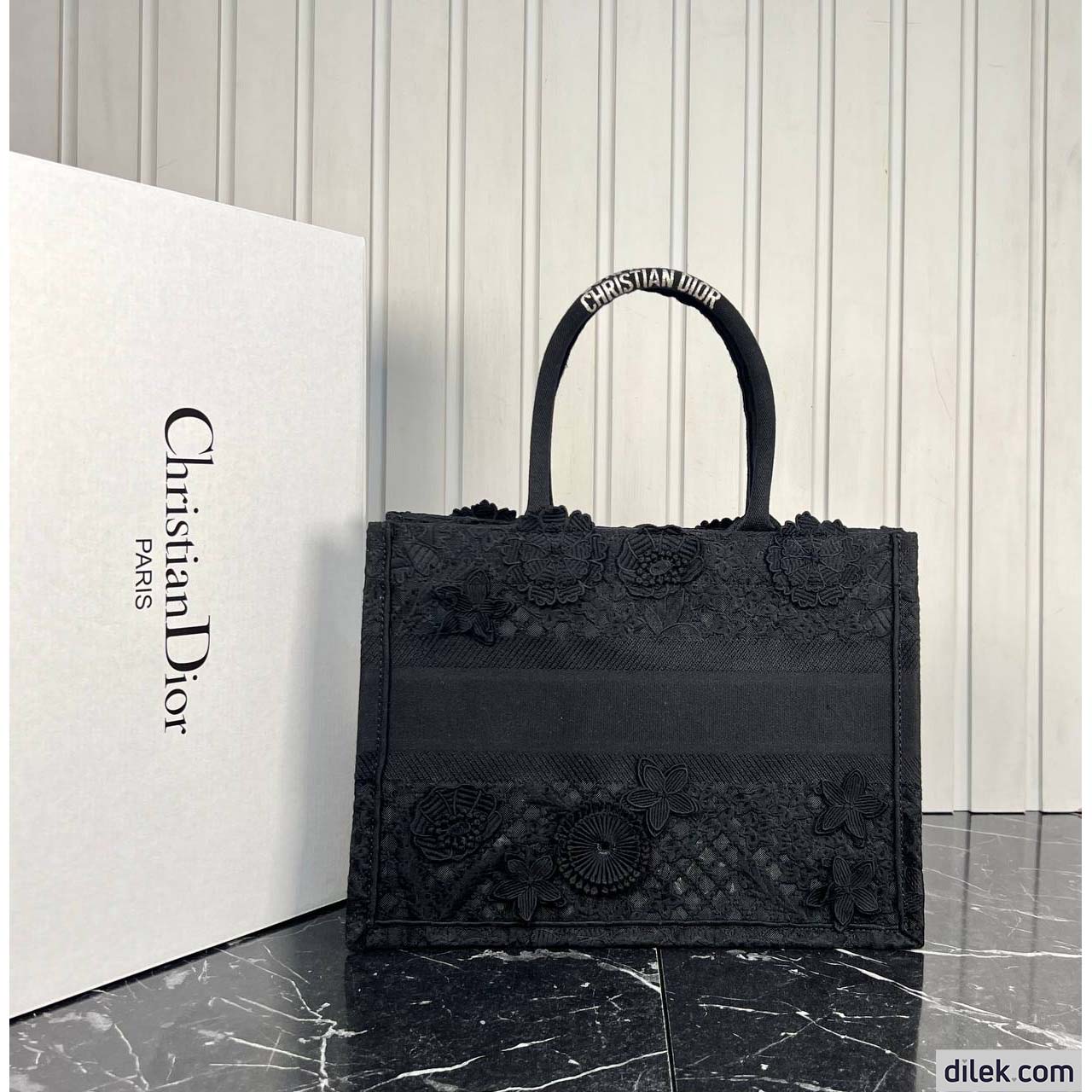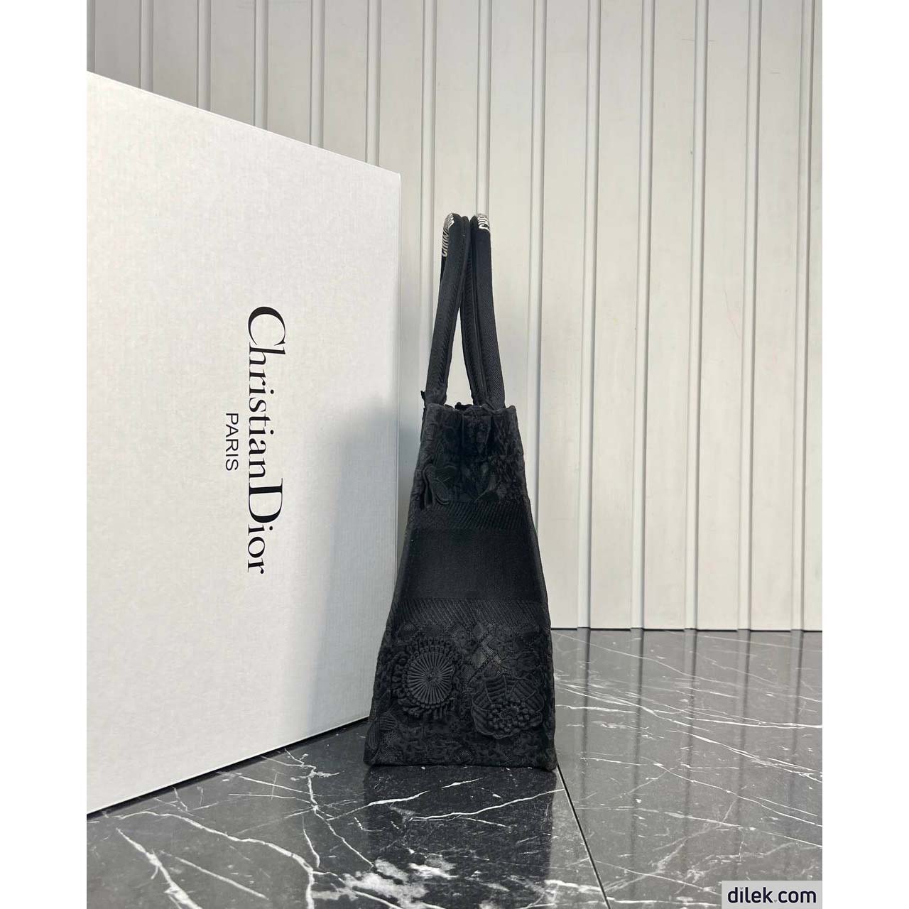 Introduced by Maria Grazia Chiuri, Creative Director of Christian Dior, the Dior Book Tote has become a staple of the Dior aesthetic. Designed to hold all the daily essentials, the style is fully embroidered with a black D-Lace Butterfly motif with 3D Macrame effect. The ultra-elegant embroidery is a refined take on lace and display of the House's savoir-faire with a poetic embellishment of three-dimensional hand-applied butterflies. Enhanced by a contrasting Christian Dior Paris signature on the front, the medium tote may be carried by hand or worn over the shoulder.