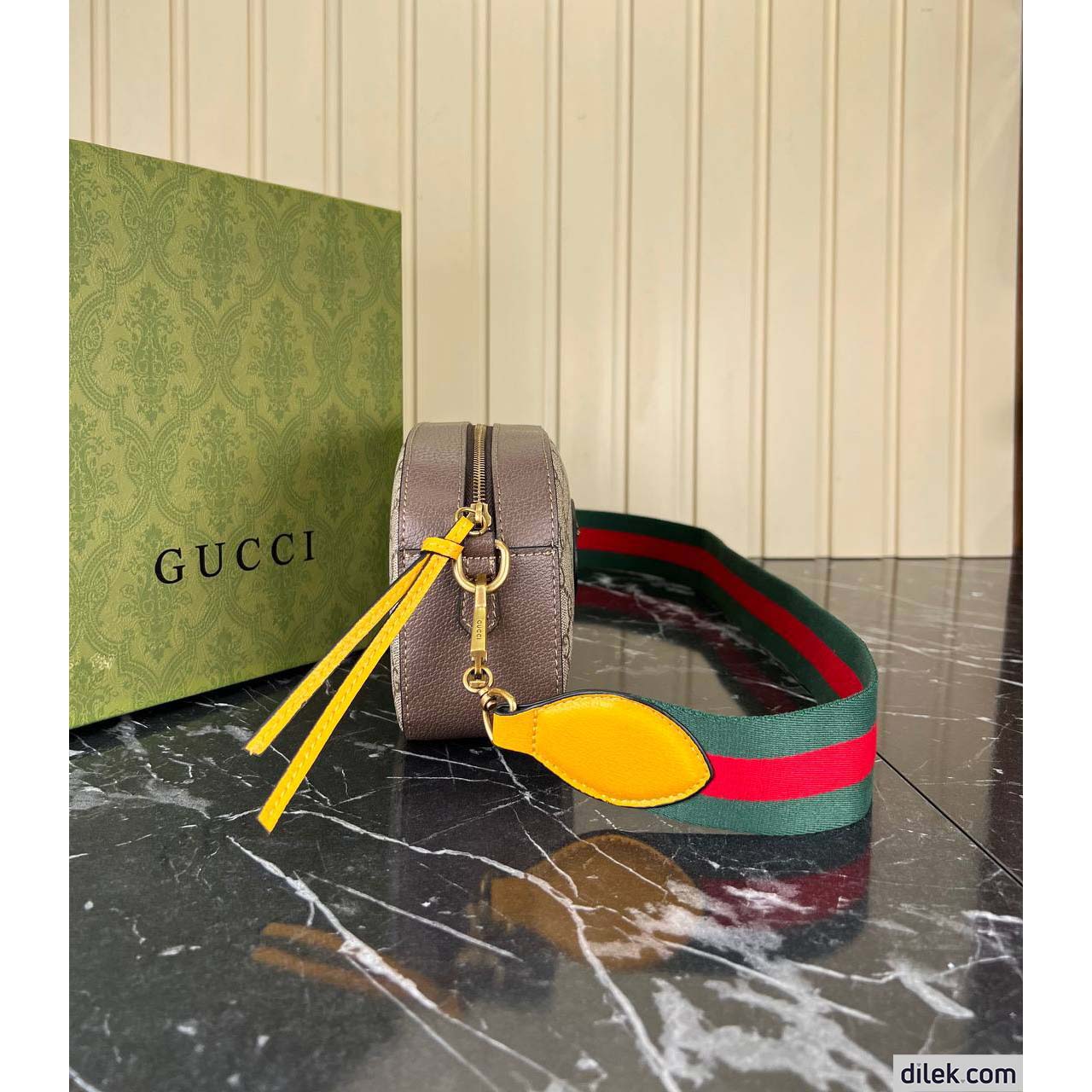 A collection of vintage inspired bags speaks to the contemporary voyager, trimmed with the House Web stripe. Made in GG Supreme canvas, this camera bag has yellow leather details. The contrast trims pay homage to the House’s past, when artisans would repair luggage by replacing worn areas with new ones in any colours that were available.