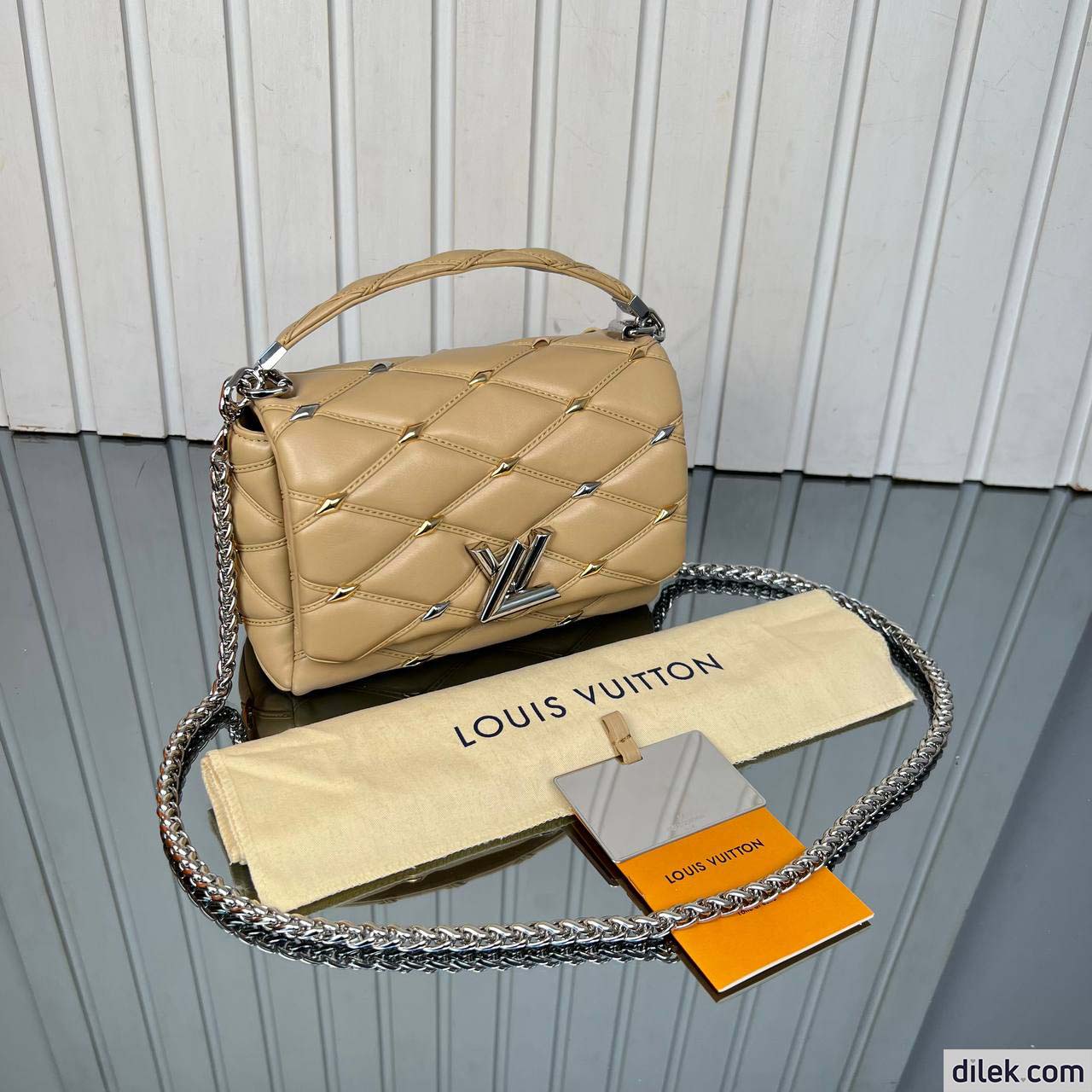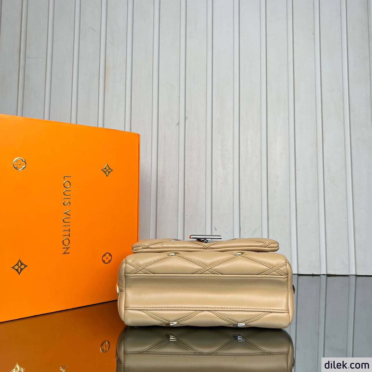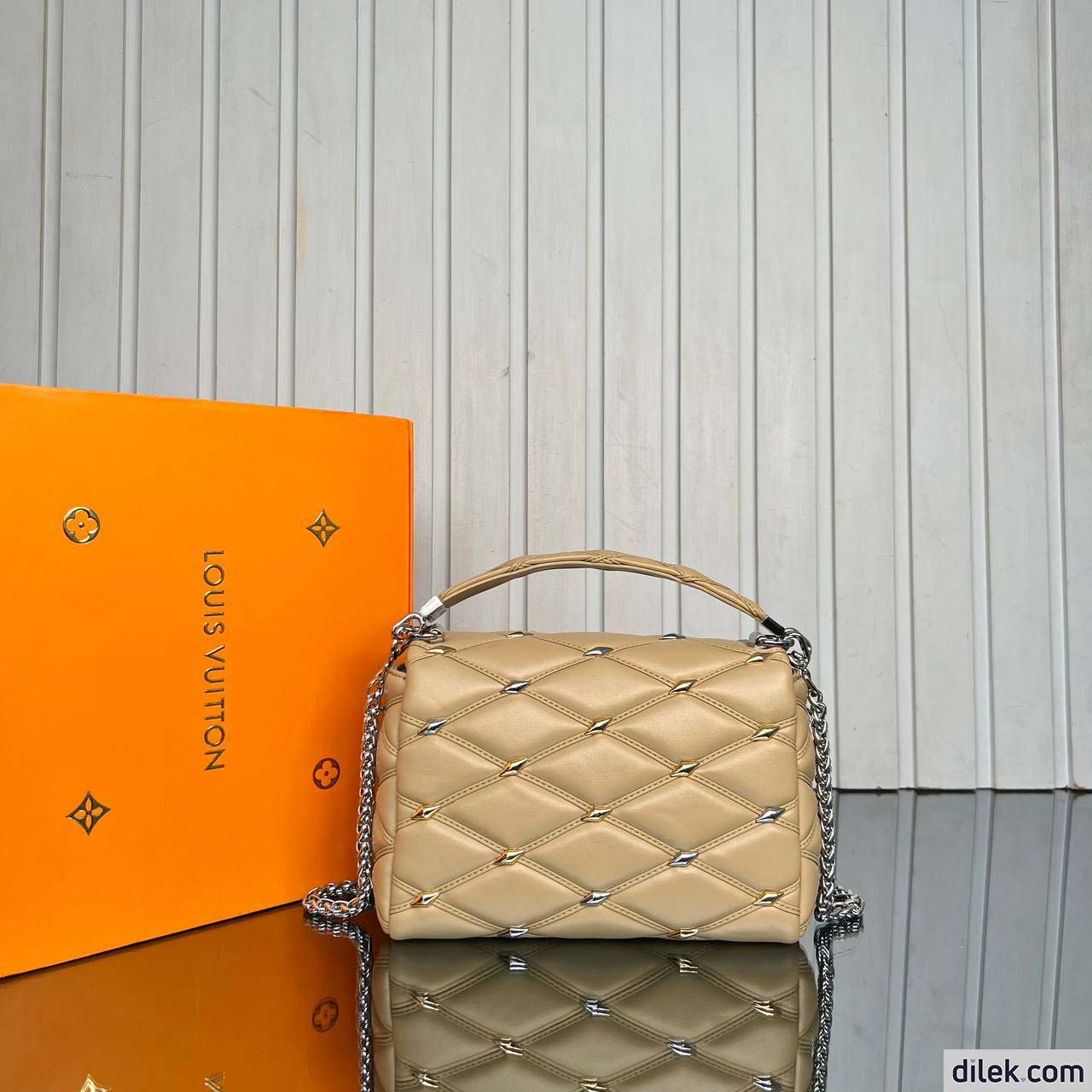 This GO-14 MM handbag in silver-color lambskin was introduced in the Spring-Summer 2024 Collection. The quilted lamb leather features a glamourous metallic finish. Gold-color hardware perfectly complements the silver leather. The GO-14 has both a removable handle for hand carry and a detachable and adjustable sliding chain for shoulder or cross-body wear.