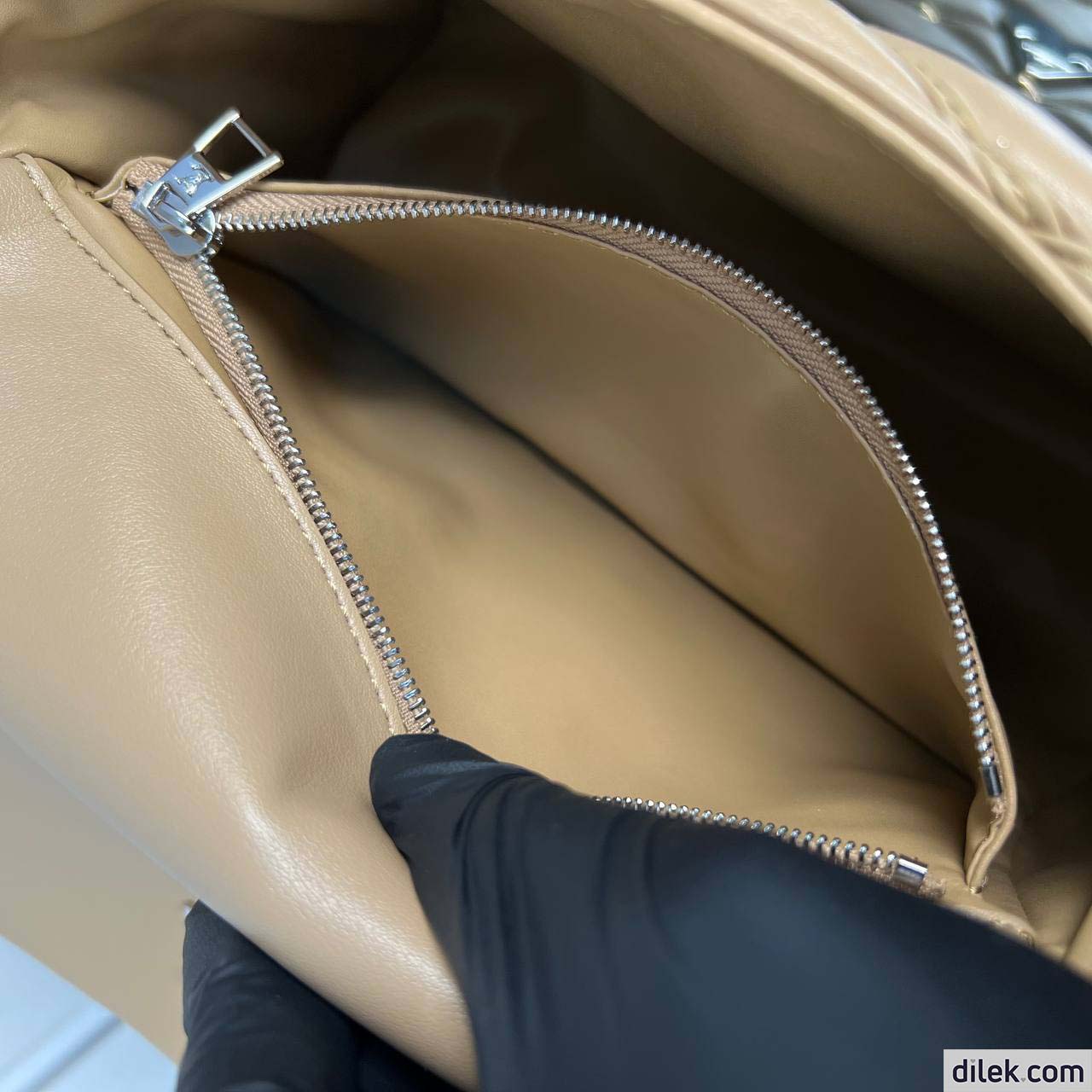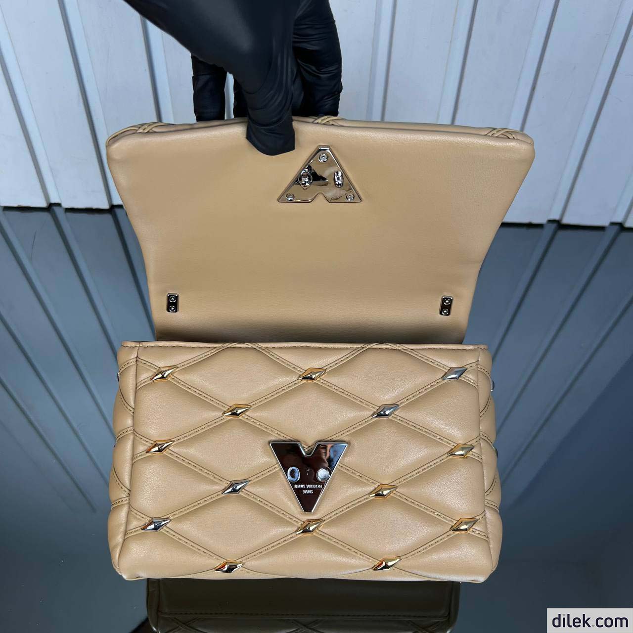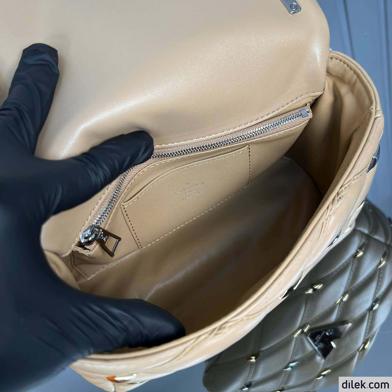 This GO-14 MM handbag in silver-color lambskin was introduced in the Spring-Summer 2024 Collection. The quilted lamb leather features a glamourous metallic finish. Gold-color hardware perfectly complements the silver leather. The GO-14 has both a removable handle for hand carry and a detachable and adjustable sliding chain for shoulder or cross-body wear.