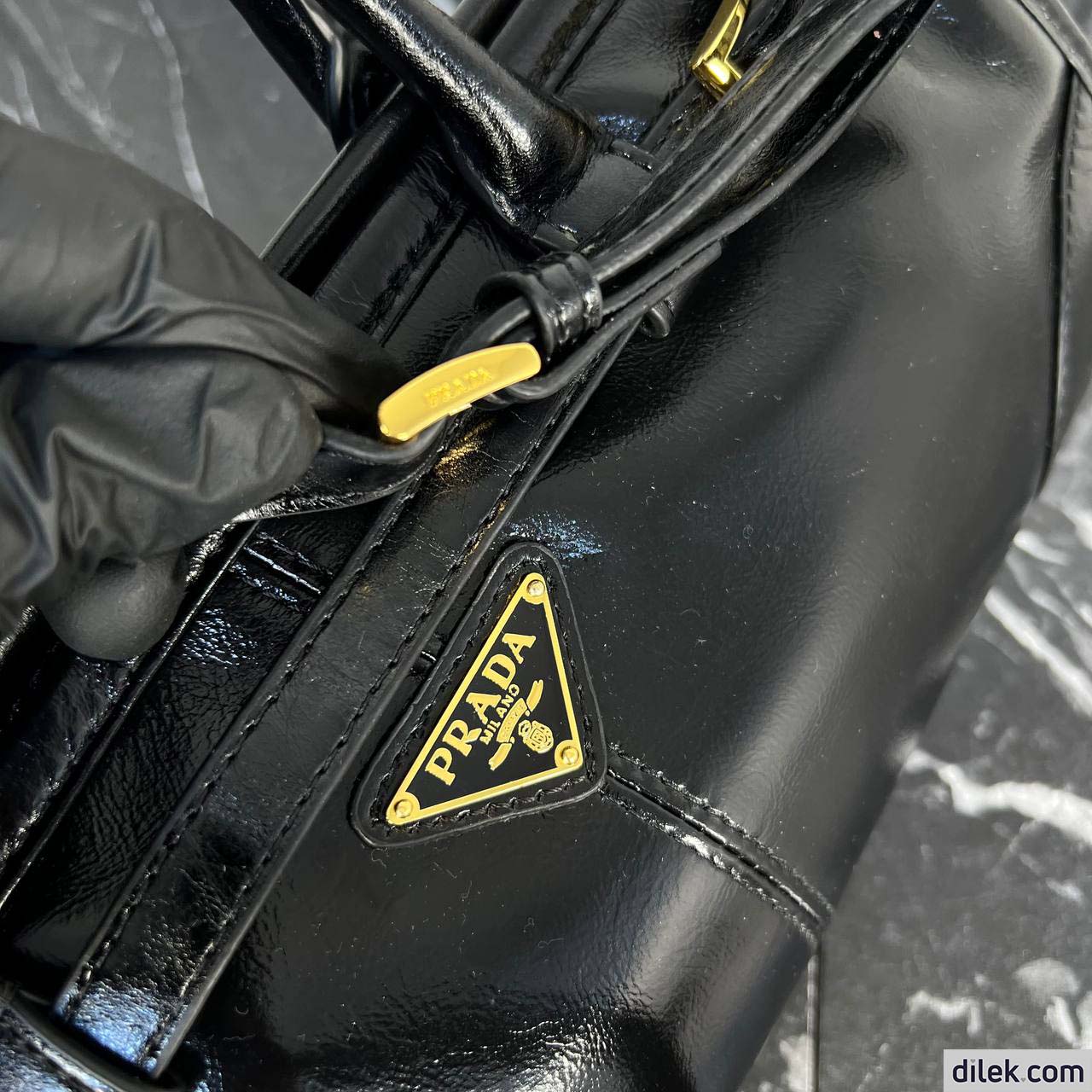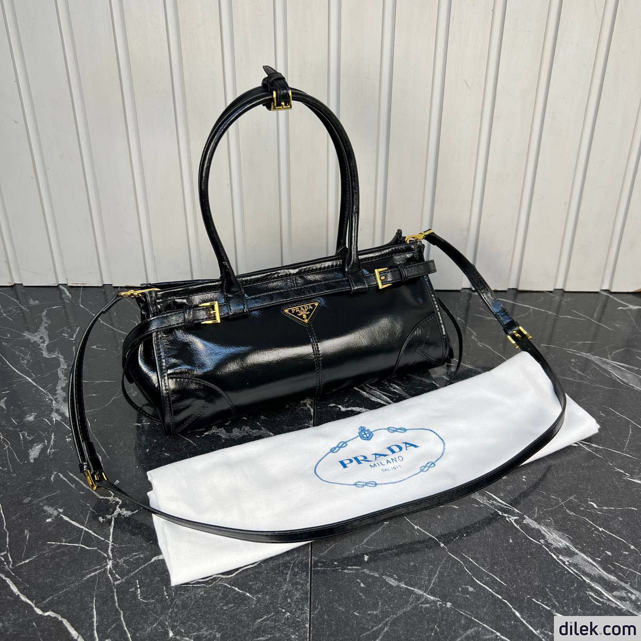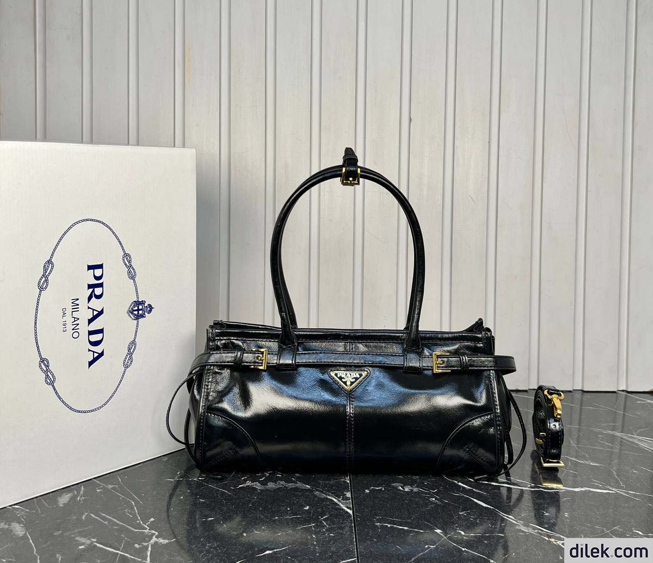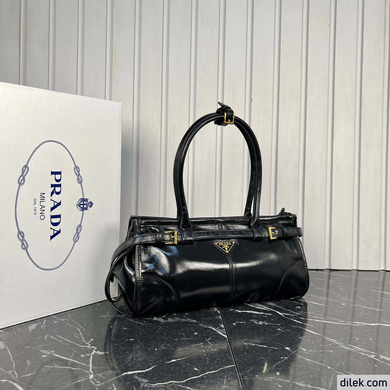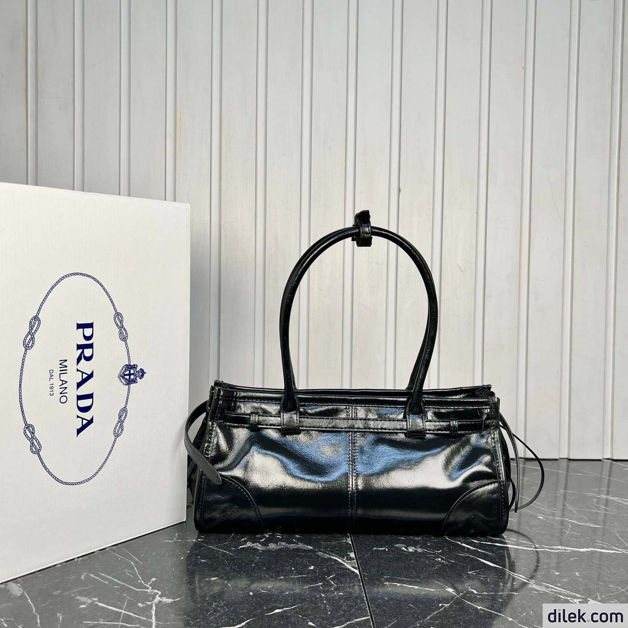 This pragmatic and refined handbag is made of soft leather with a glossy finish that emphasizes its versatile, modern allure. The geometric design blends different influences into one style with a distinctive but sleek aesthetic. Embellished by the sophisticated strap detail, the rectangular silhouette has zipper pockets inside. The enameled metal triangle logo completes the look with its iconic signature.