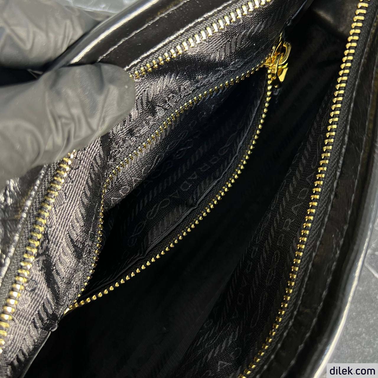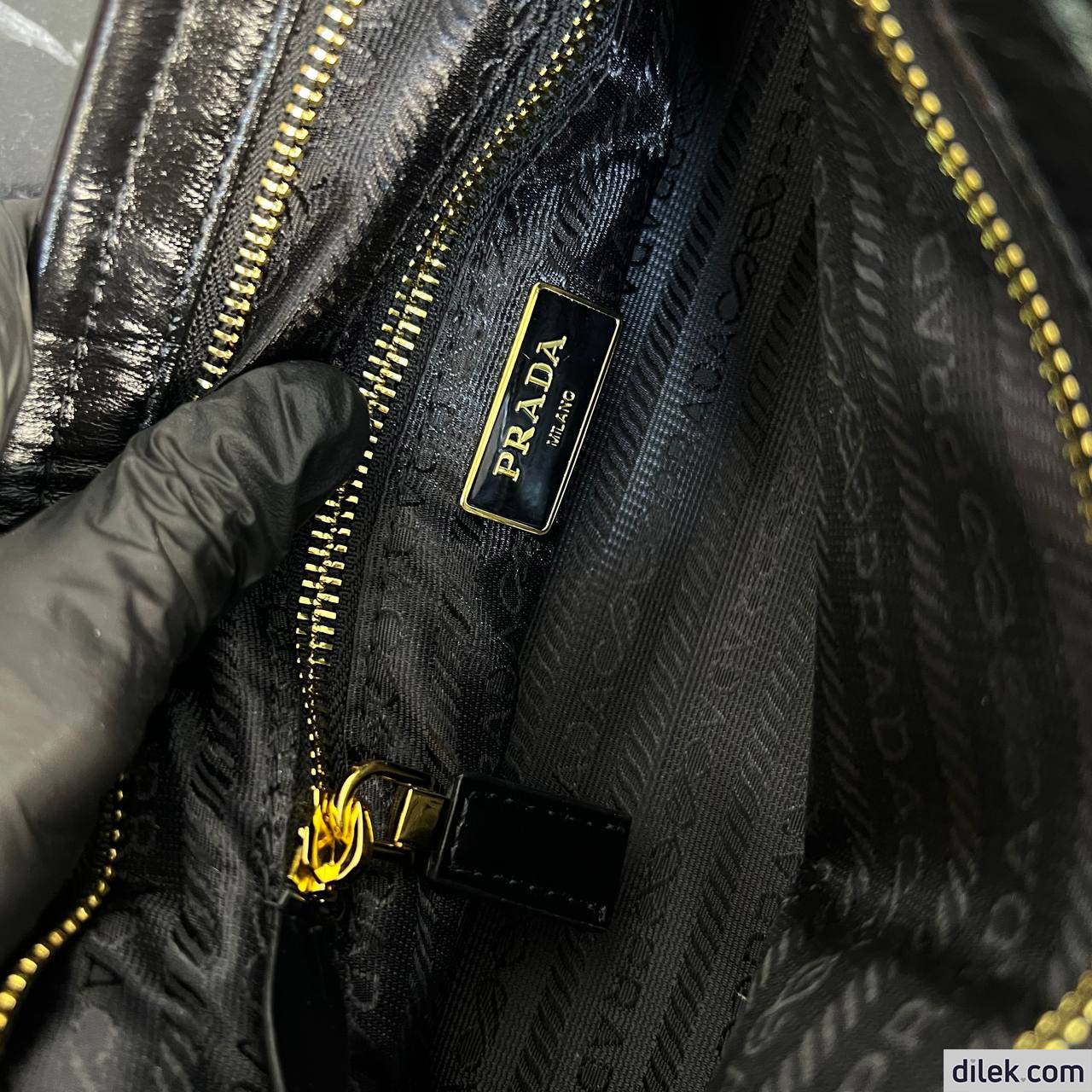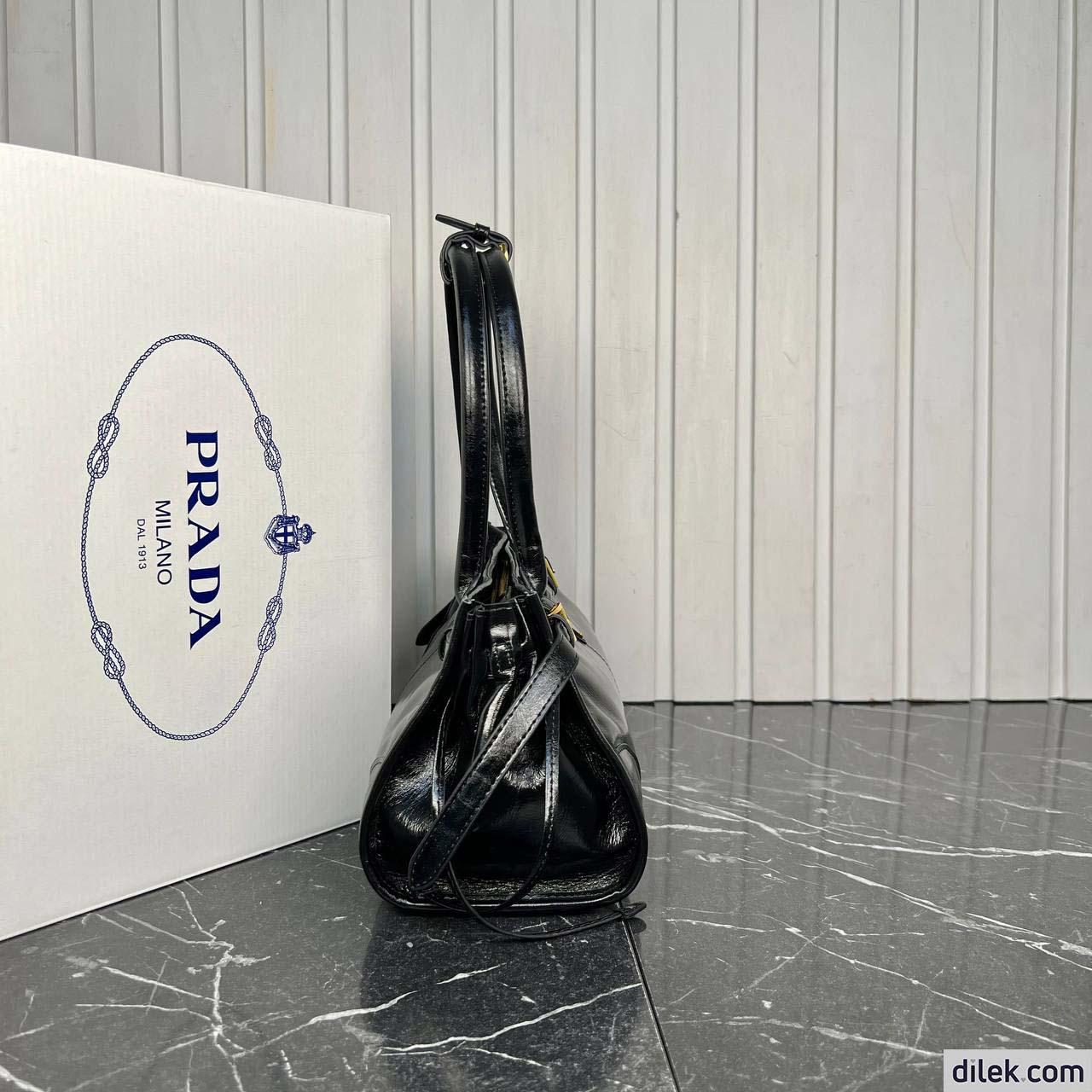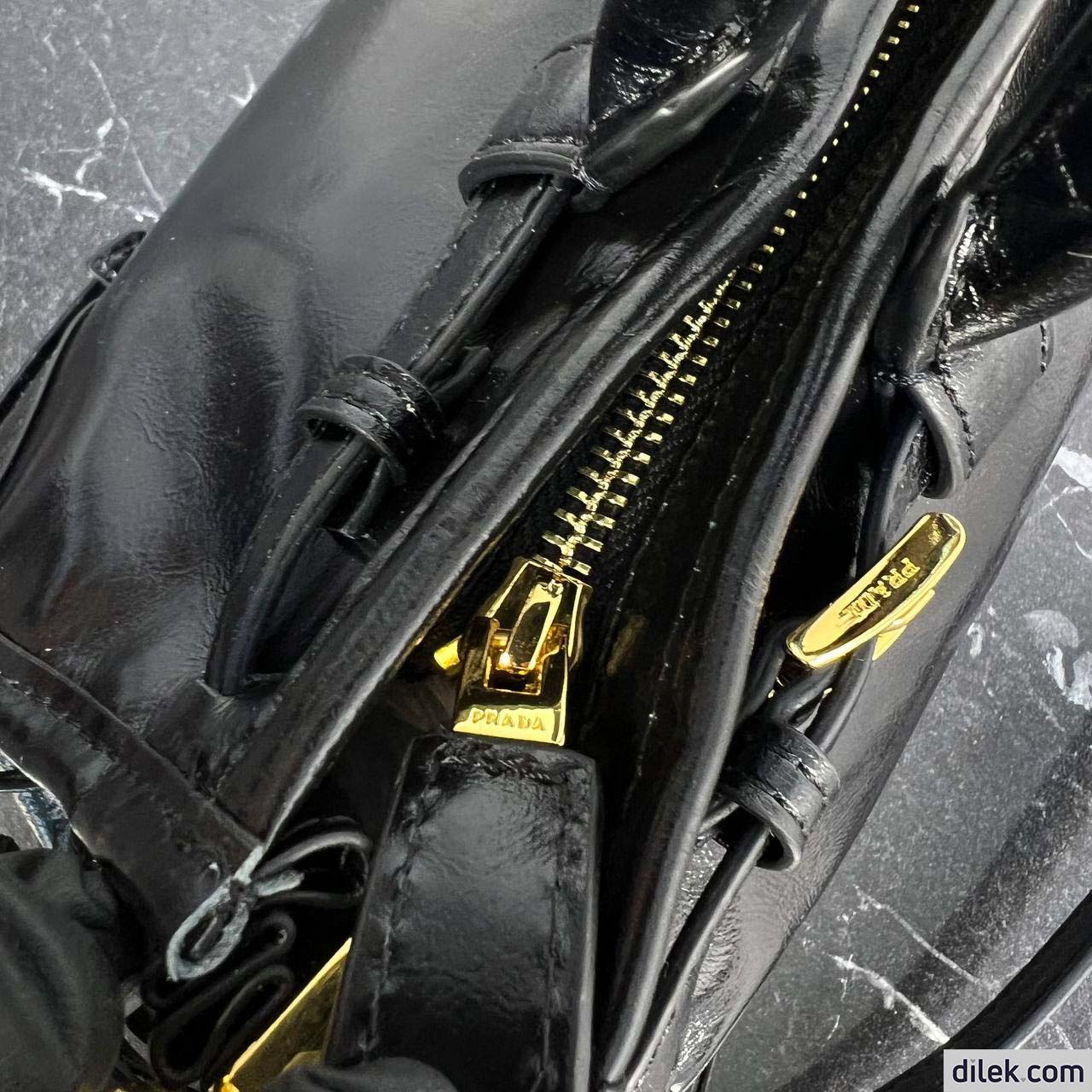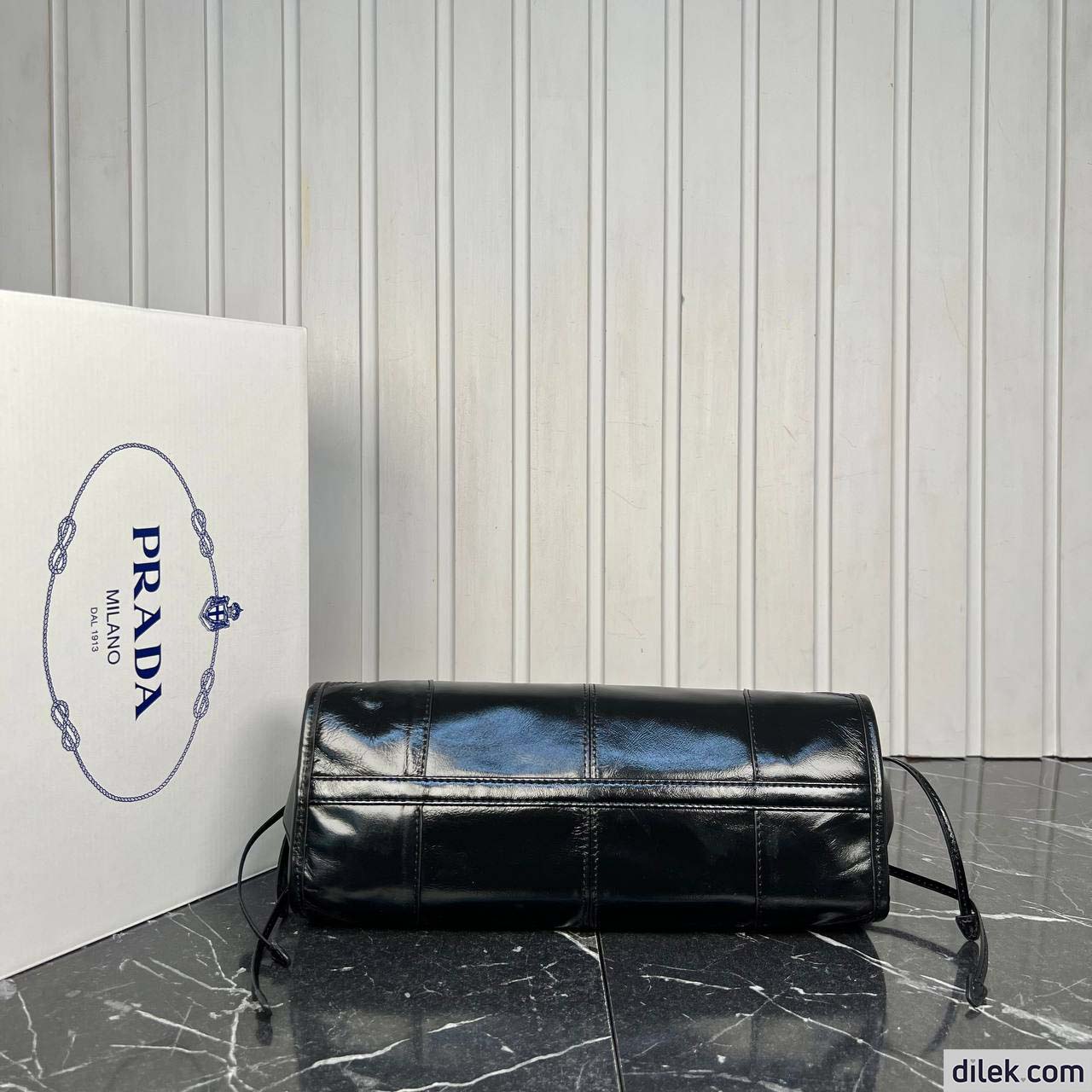 This pragmatic and refined handbag is made of soft leather with a glossy finish that emphasizes its versatile, modern allure. The geometric design blends different influences into one style with a distinctive but sleek aesthetic. Embellished by the sophisticated strap detail, the rectangular silhouette has zipper pockets inside. The enameled metal triangle logo completes the look with its iconic signature.