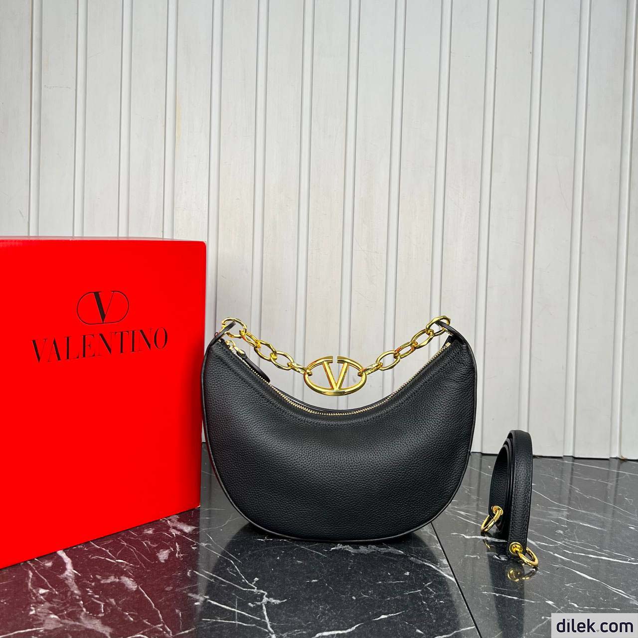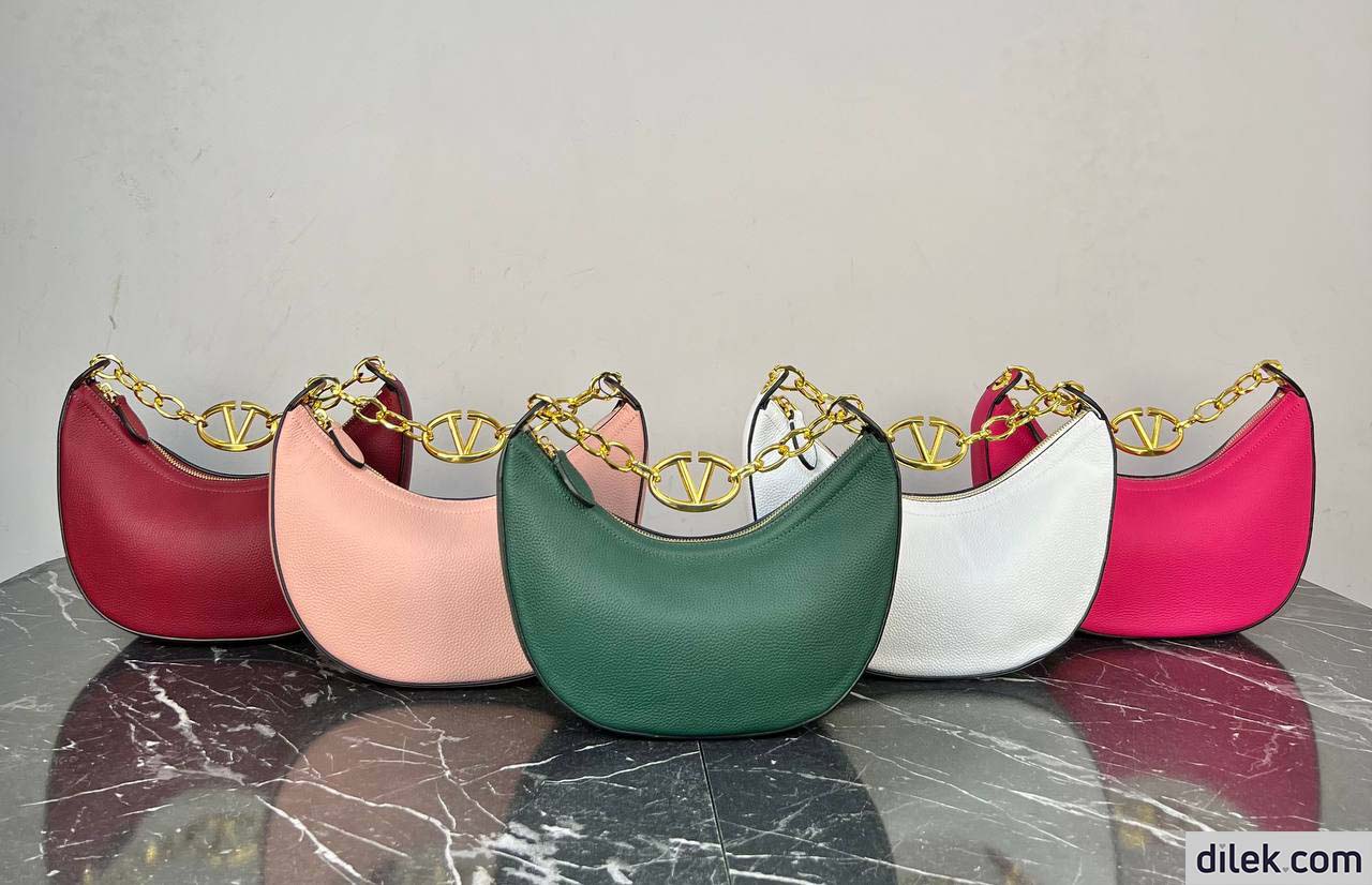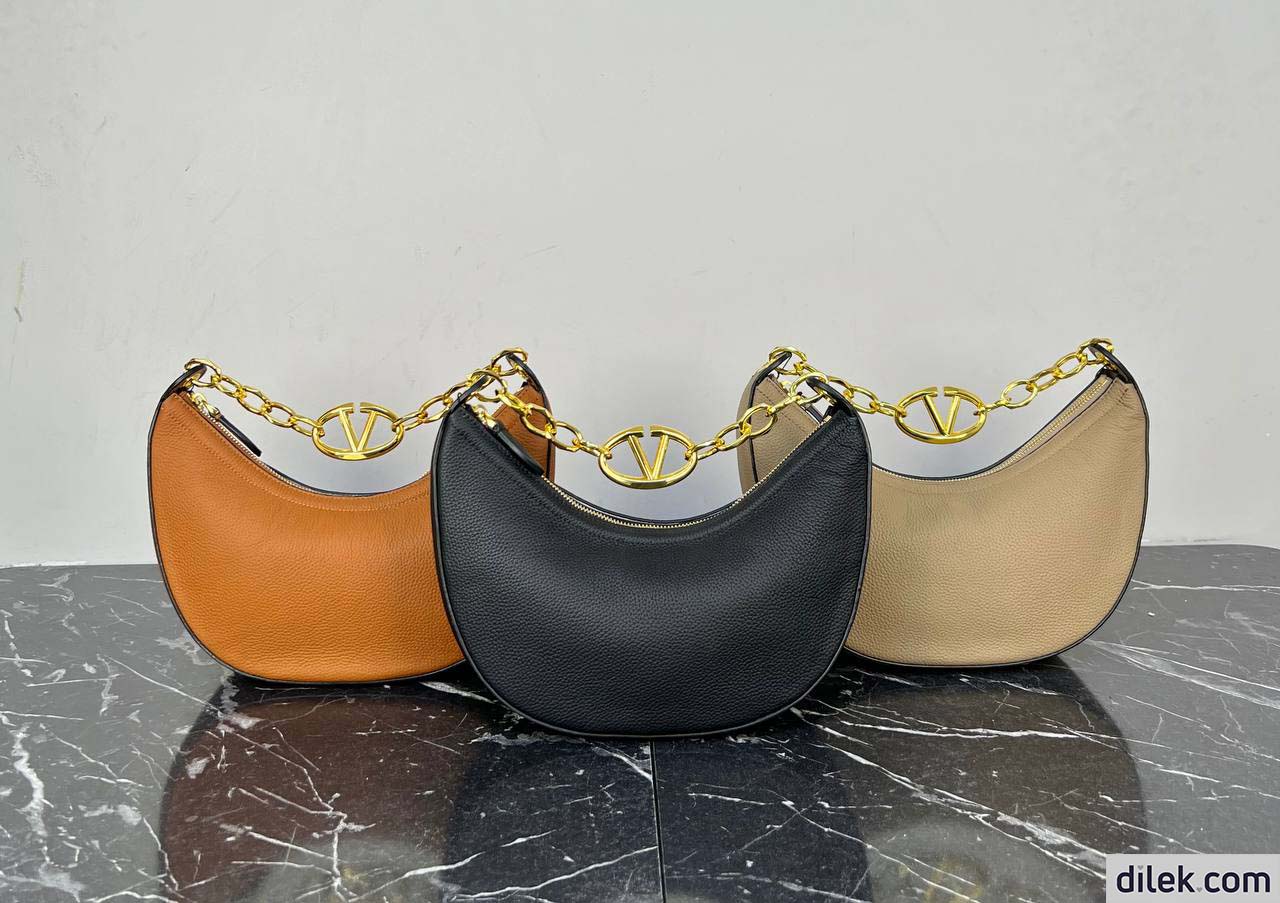 Valentino Garavani VLogo Moon small hobo bag in grainy calfskin with chain and metallic VLogo Signature element. Equipped with a chain and detachable leather shoulder strap, the bag can be worn as a crossbody/shoulder bag or carried by hand.