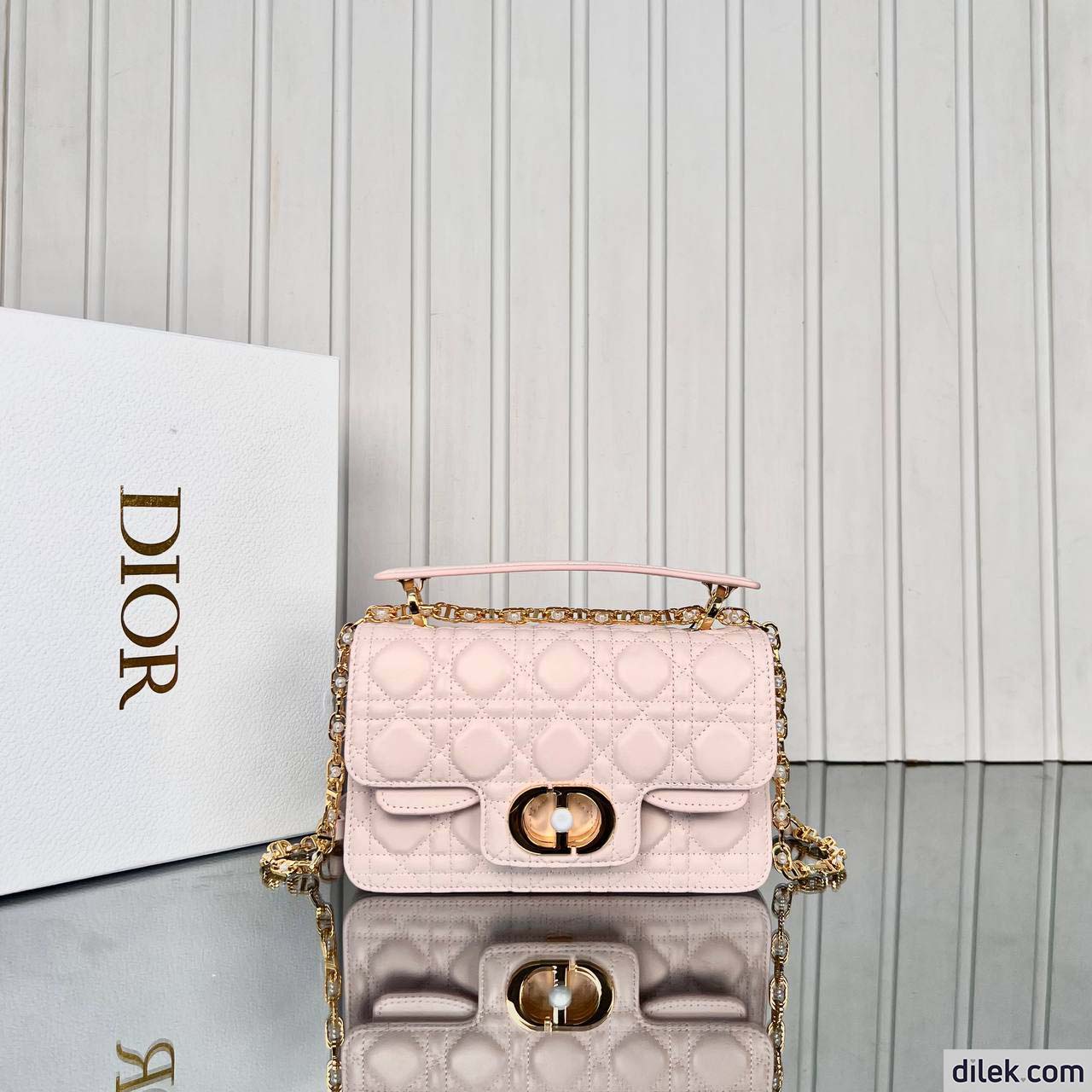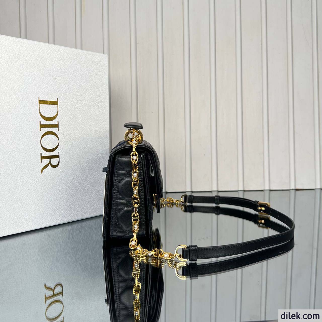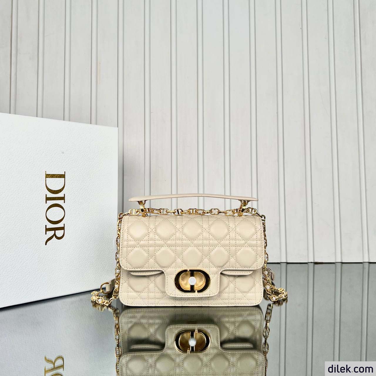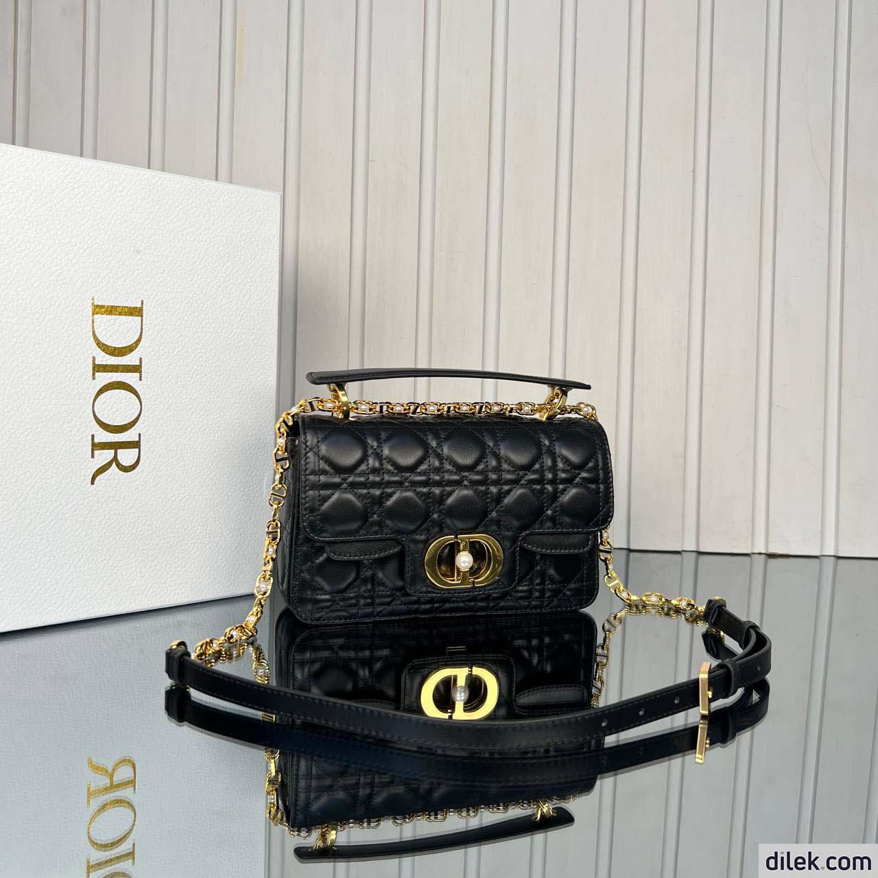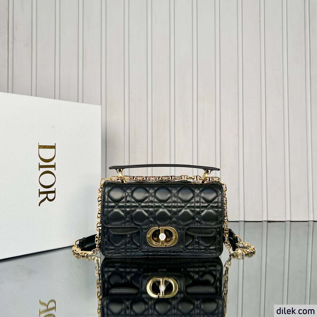 New for Summer 2024, the Dior Jolie Top Handle bag presents an elegant and functional design. It is crafted in black calfskin with Cannage stitching and features a double flap enhanced by a CD signature embellished with a white resin pearl, as well as three compartments and a zip pocket to accommodate all the essentials, day or evening. The removable top handle is completed by a detachable chain strap with a leather insert and CD signature links embellished with white resin pearls, allowing the miniature bag to be comfortably carried by hand, worn over the shoulder or crossbody.
