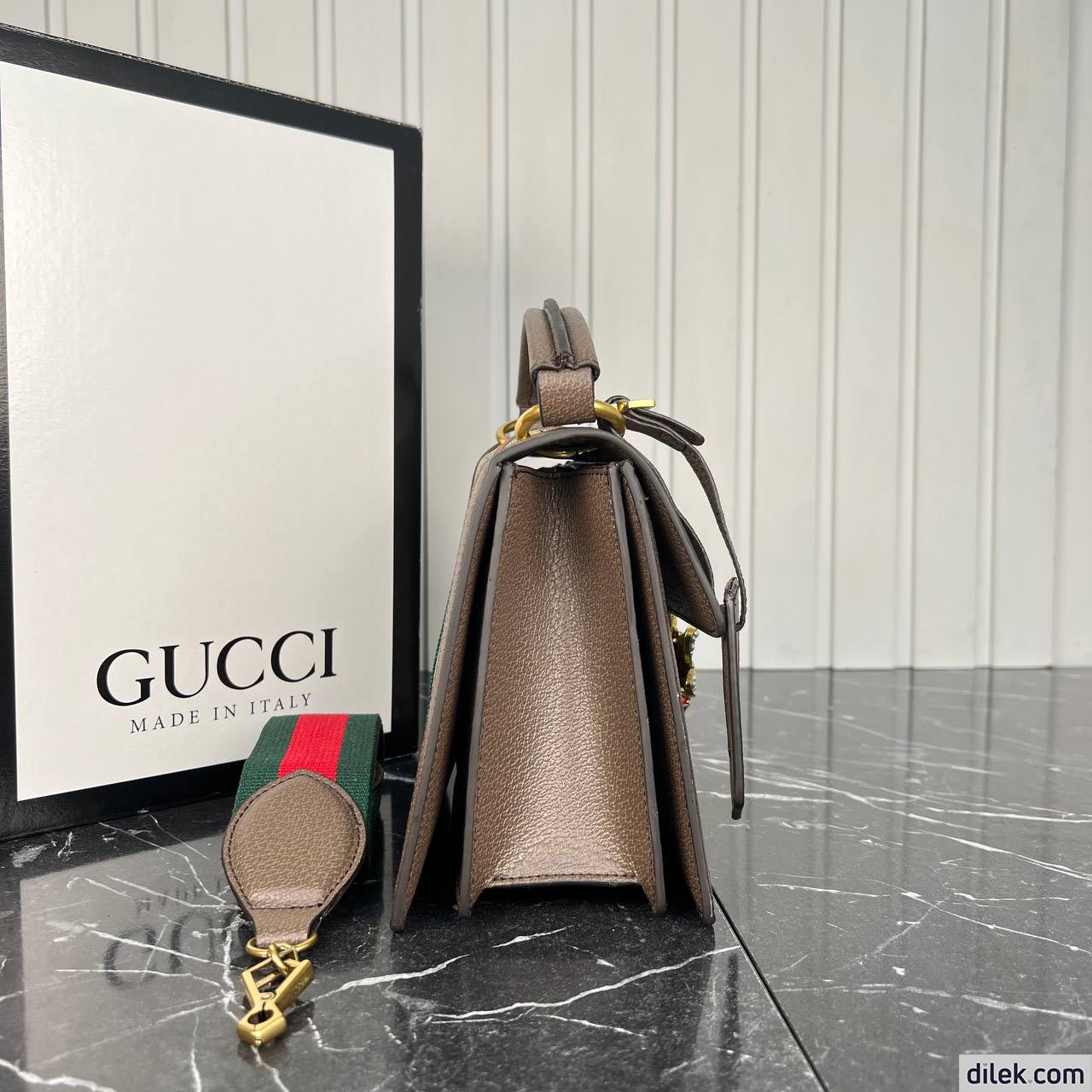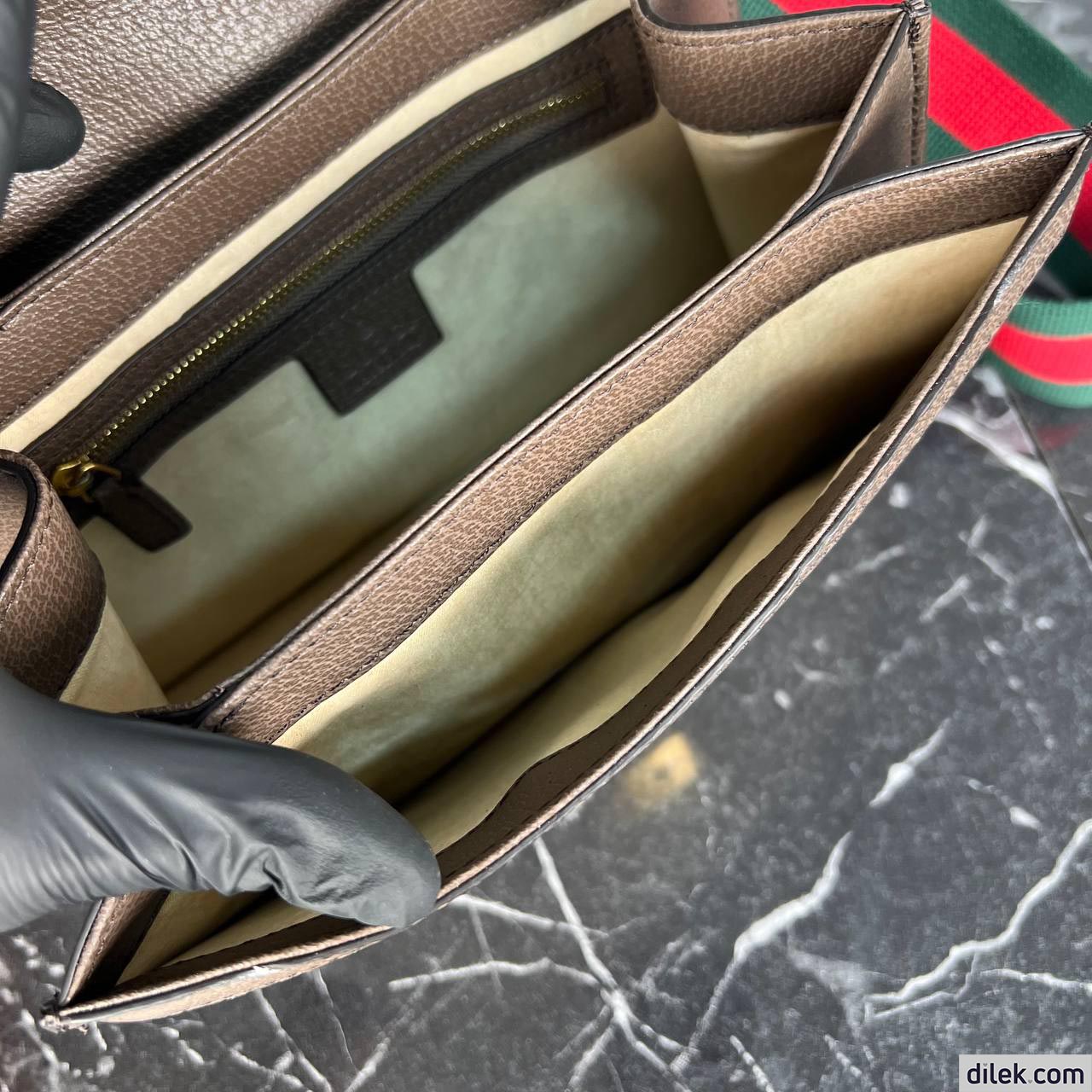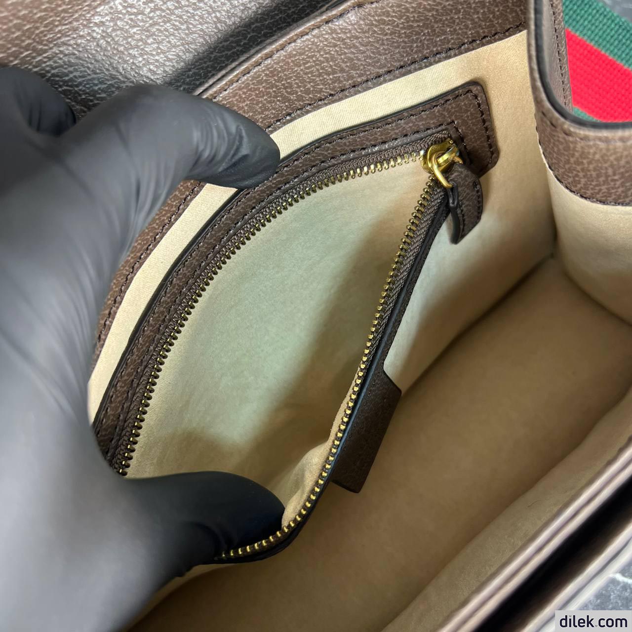 The world of Ophidia continues to evolve with new iterations each season. The top handle bag is presented as part of the Epilogue collection with a detachable shoulder strap. The vintage influenced square shape is accentuated by the House Web stripe and Double G hardware a contemporary take on a Gucci archival belt buckle from the '70s. Crafted from the House's monogram canvas, the style has a strong logo feel.