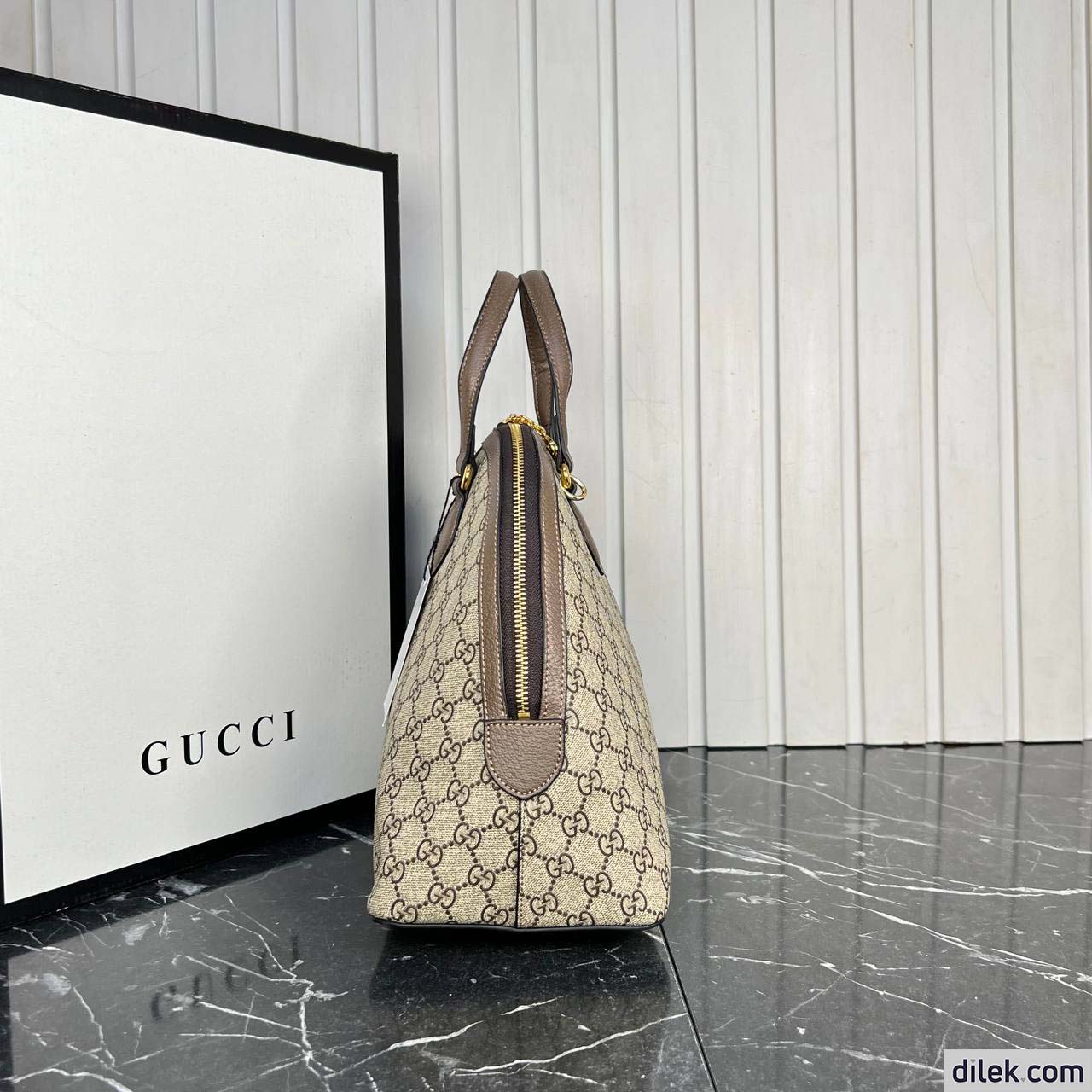 The world of Ophidia continues to evolve with new iterations for the Pre-Fall collection. This medium-sized top handle bag is made of beige and ebony GG Supreme canvas and has a detachable shoulder strap. The House iconic Web stripe and Double G hardware complete the piece.