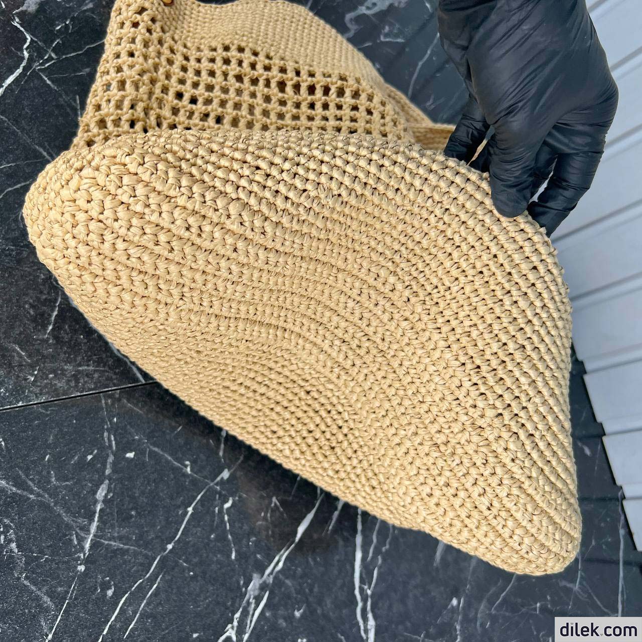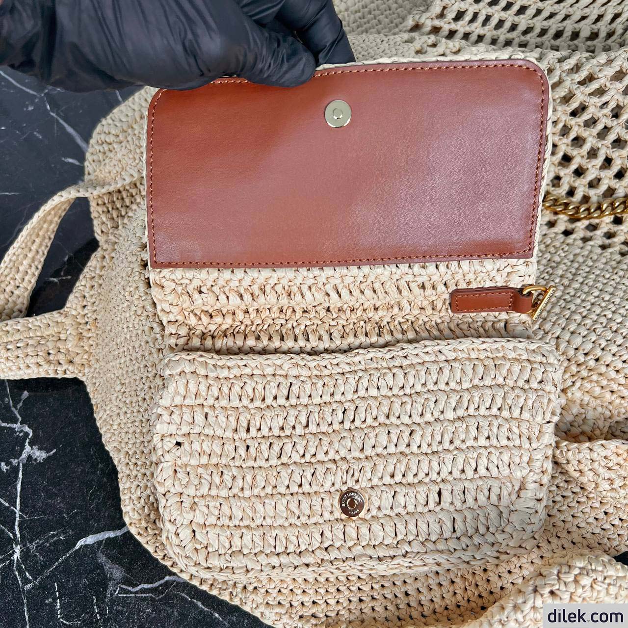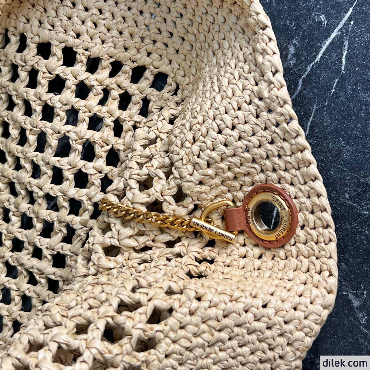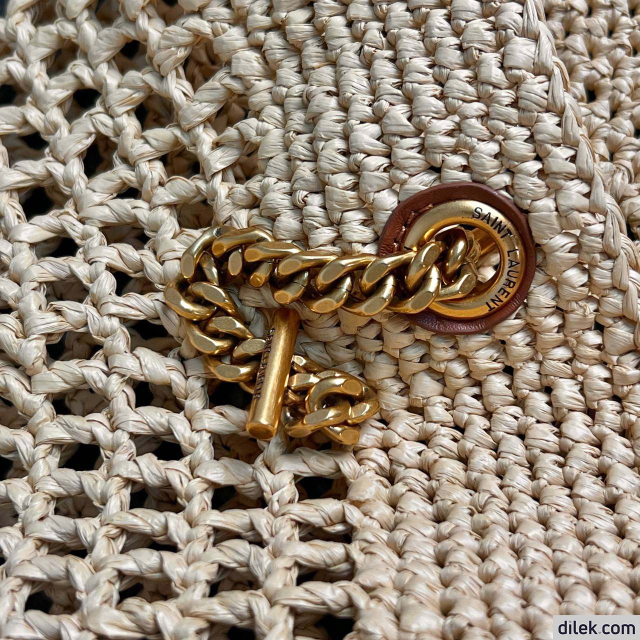 Maxi shopping bag made in a hand-embroidered natural raffia. This technique requires the finest savoir-faire and specialized craftsmanship. Anorned with an oversized, sculptures cassandre, its inner chain can be used to adjust the sides.