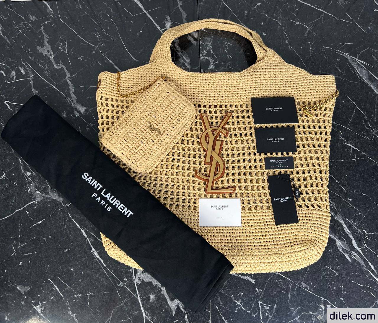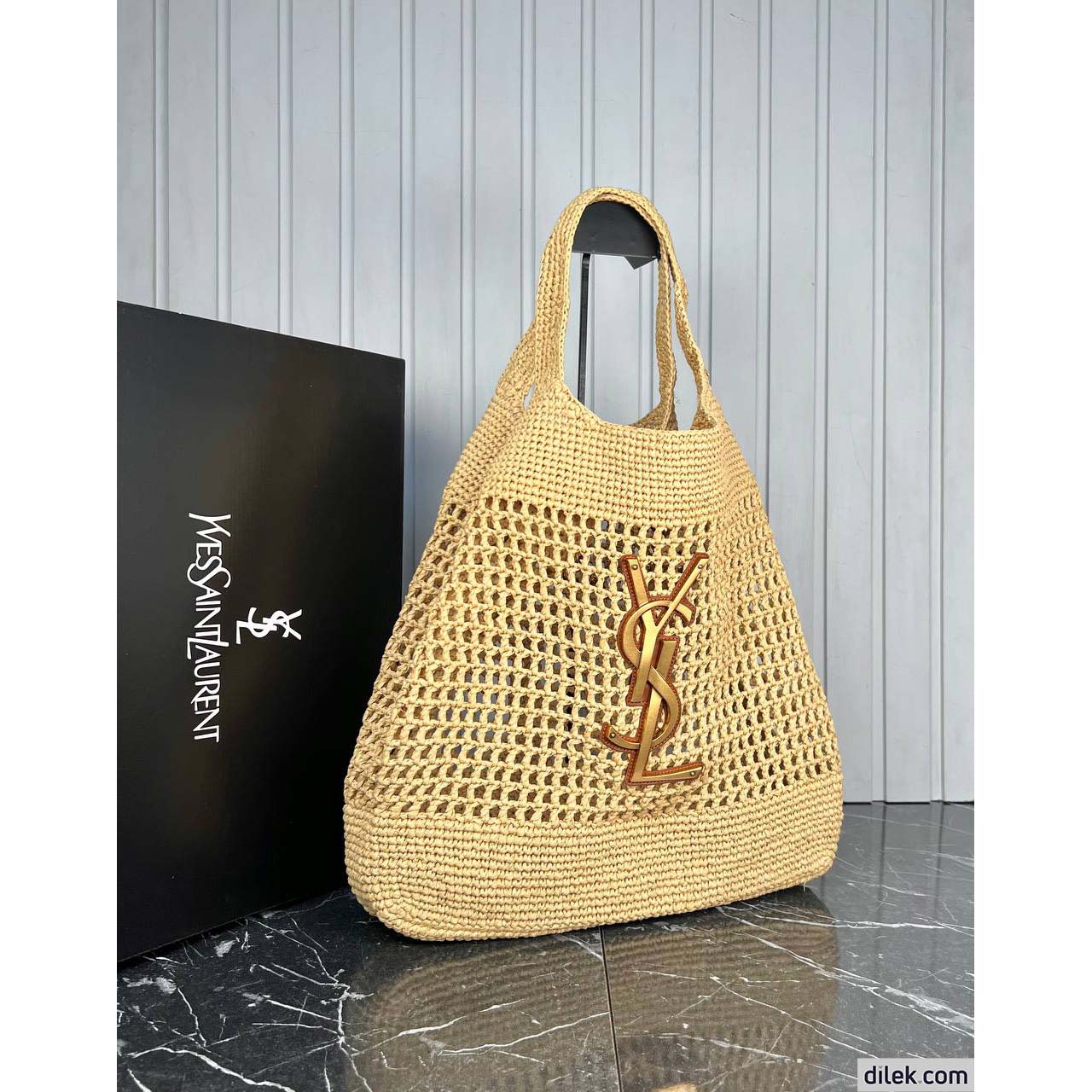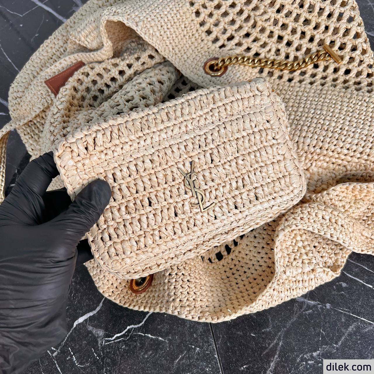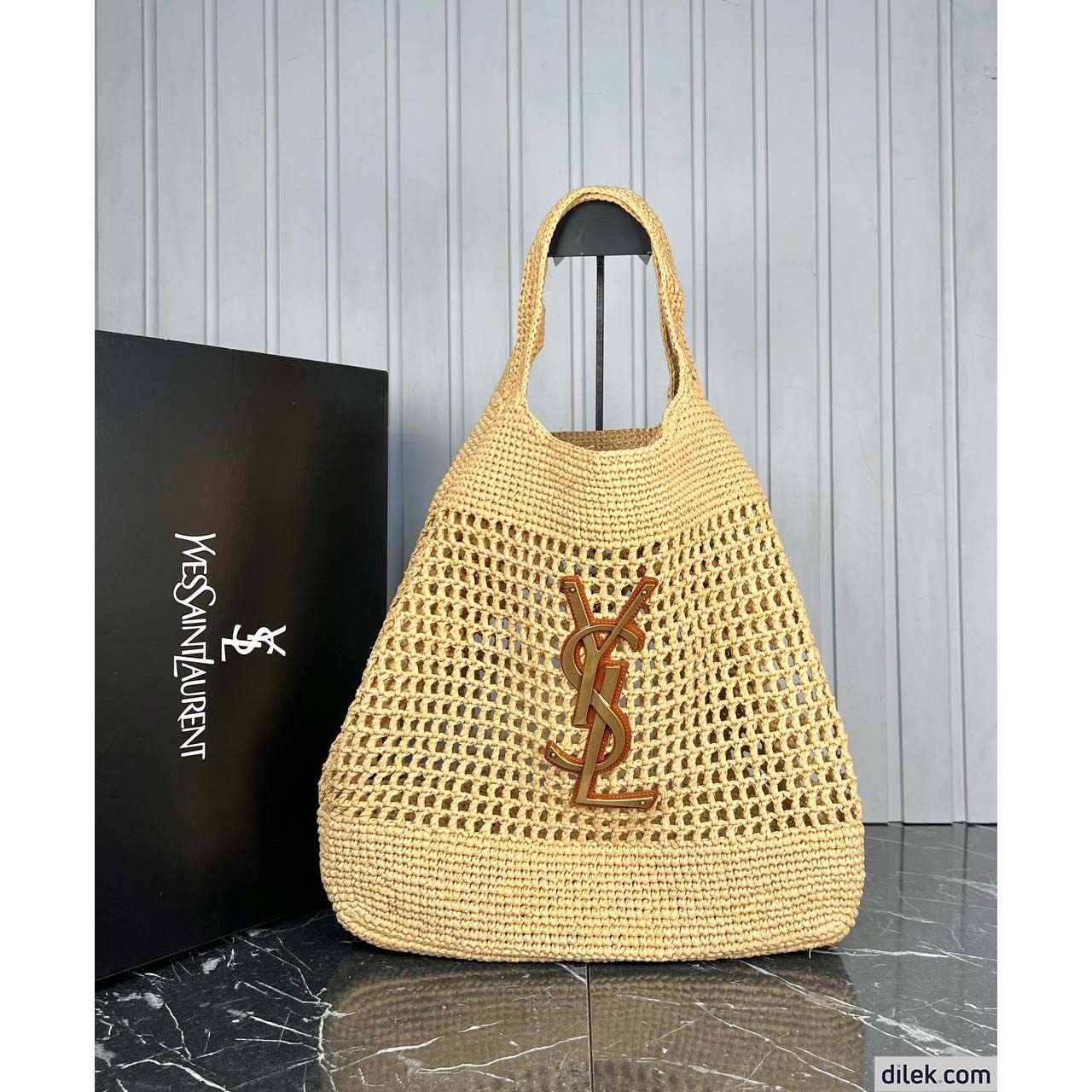 Maxi shopping bag made in a hand-embroidered natural raffia. This technique requires the finest savoir-faire and specialized craftsmanship. Anorned with an oversized, sculptures cassandre, its inner chain can be used to adjust the sides.