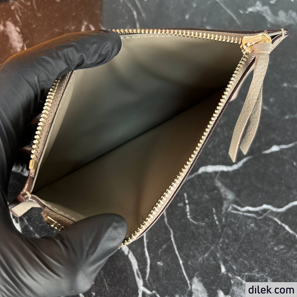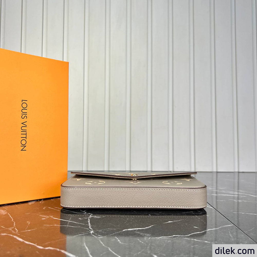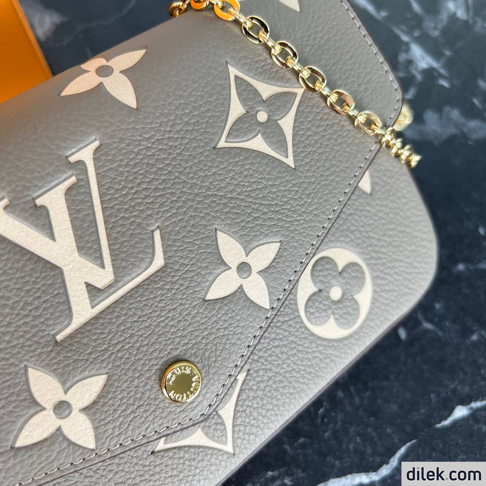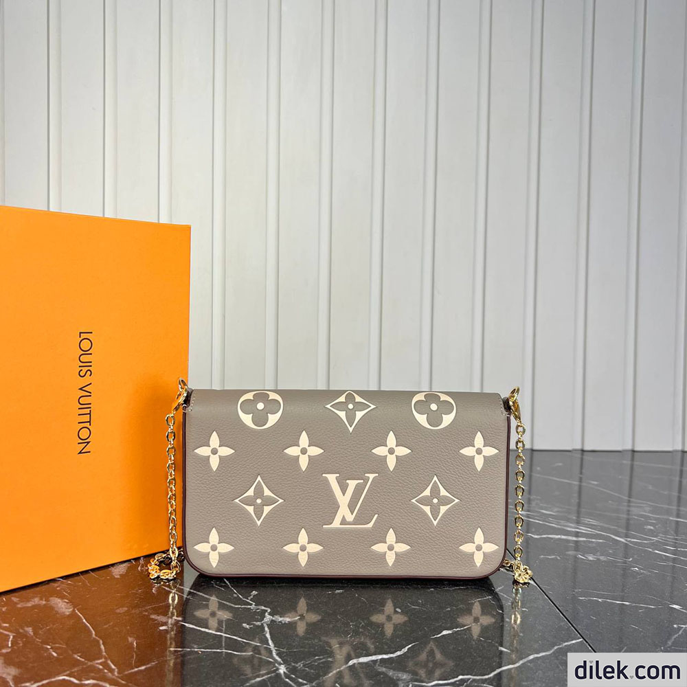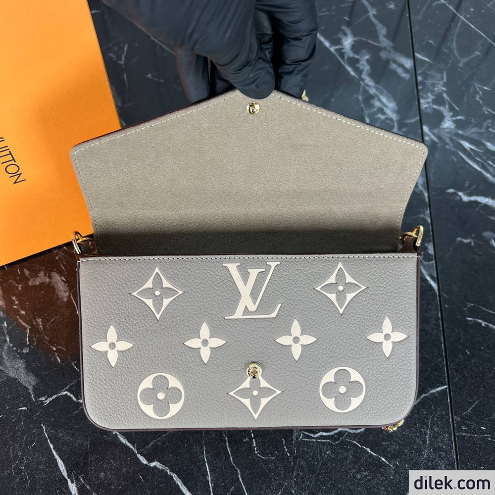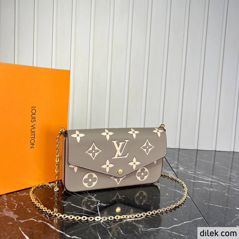 The Felicie Pochette is crafted from supple Monogram Empreinte leather, embossed with Louis Vuitton's iconic Monogram pattern. The bicolor palette brings added refinement to this elegant and versatile design, which features a removable chain, enabling it to be carried on the shoulder or as a clutch, as well as two removable pockets.
