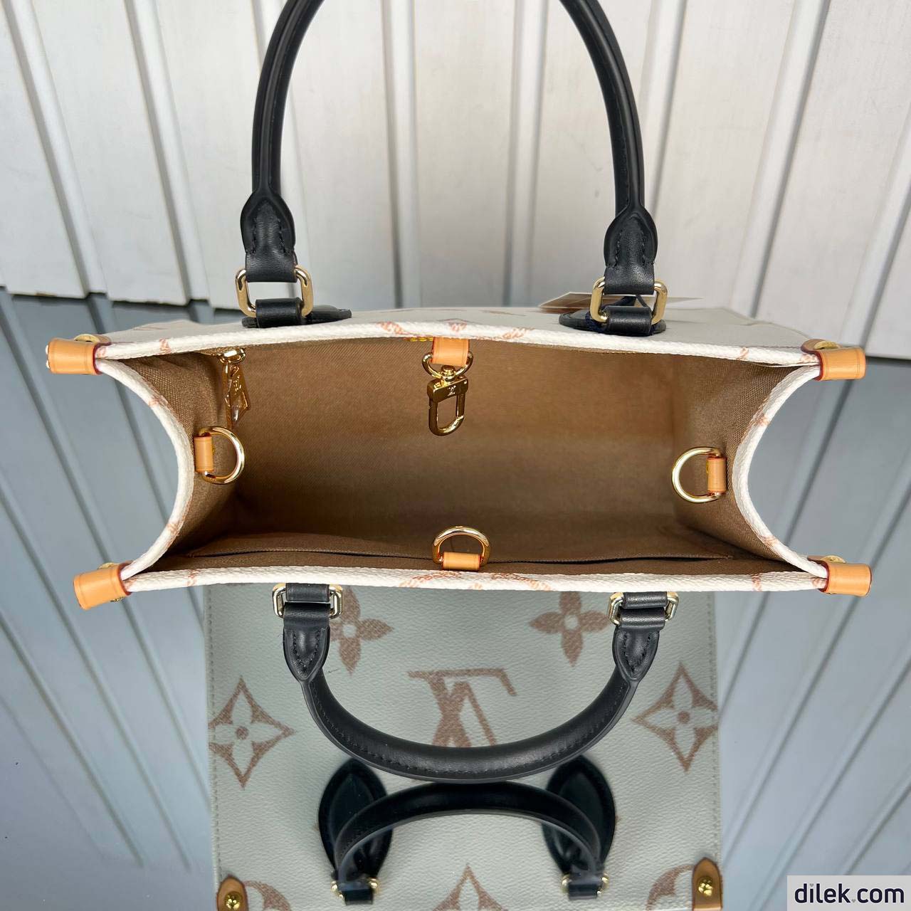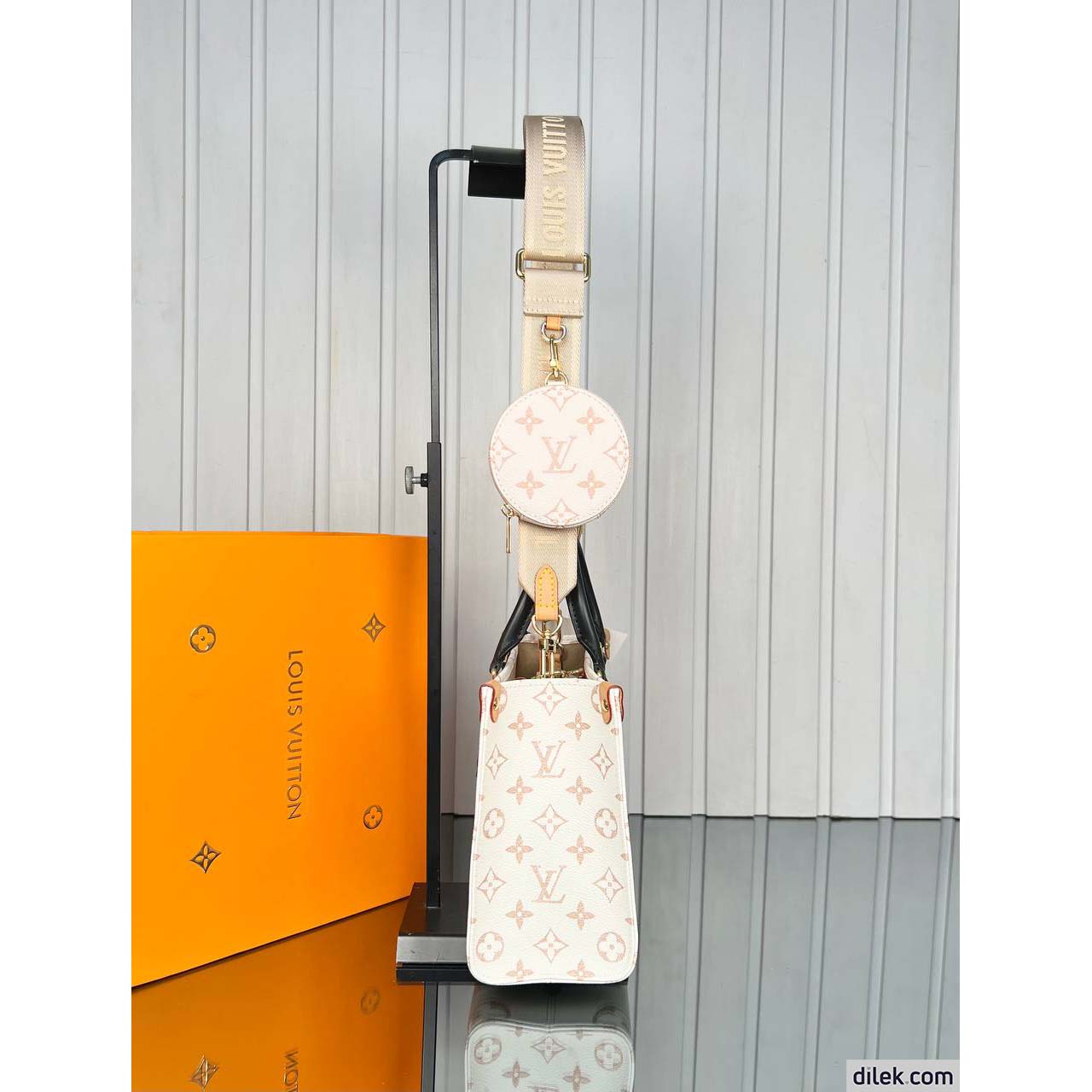 Part of the Sunrise Aquarelle collection, this OnTheGo BB handbag is fashioned from Monogram Empreinte leather in a colorway of orange, pink and fuchsia, inspired by sunrise. The LVs and Monogram Blossoms printed on the leather have a watercolor aspect. A hint of glossiness is screen-printed onto the surface, like glistening drops of morning dew. Two rolled-leather top handles and a removable and adjustable strap enable various carry options.