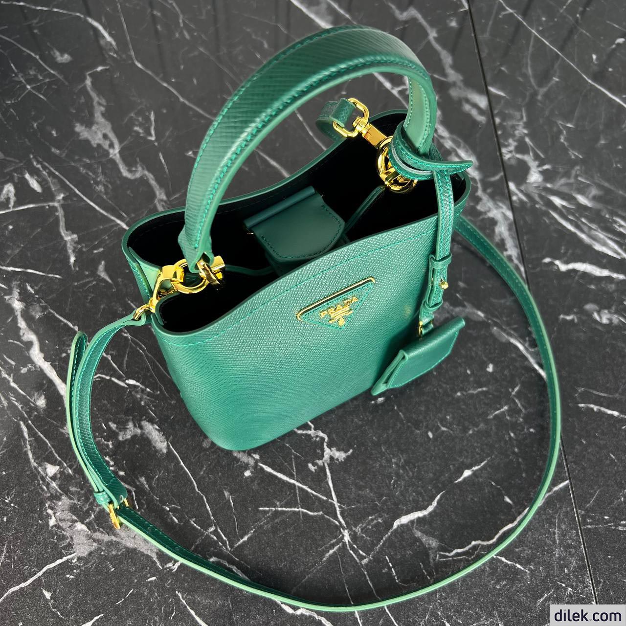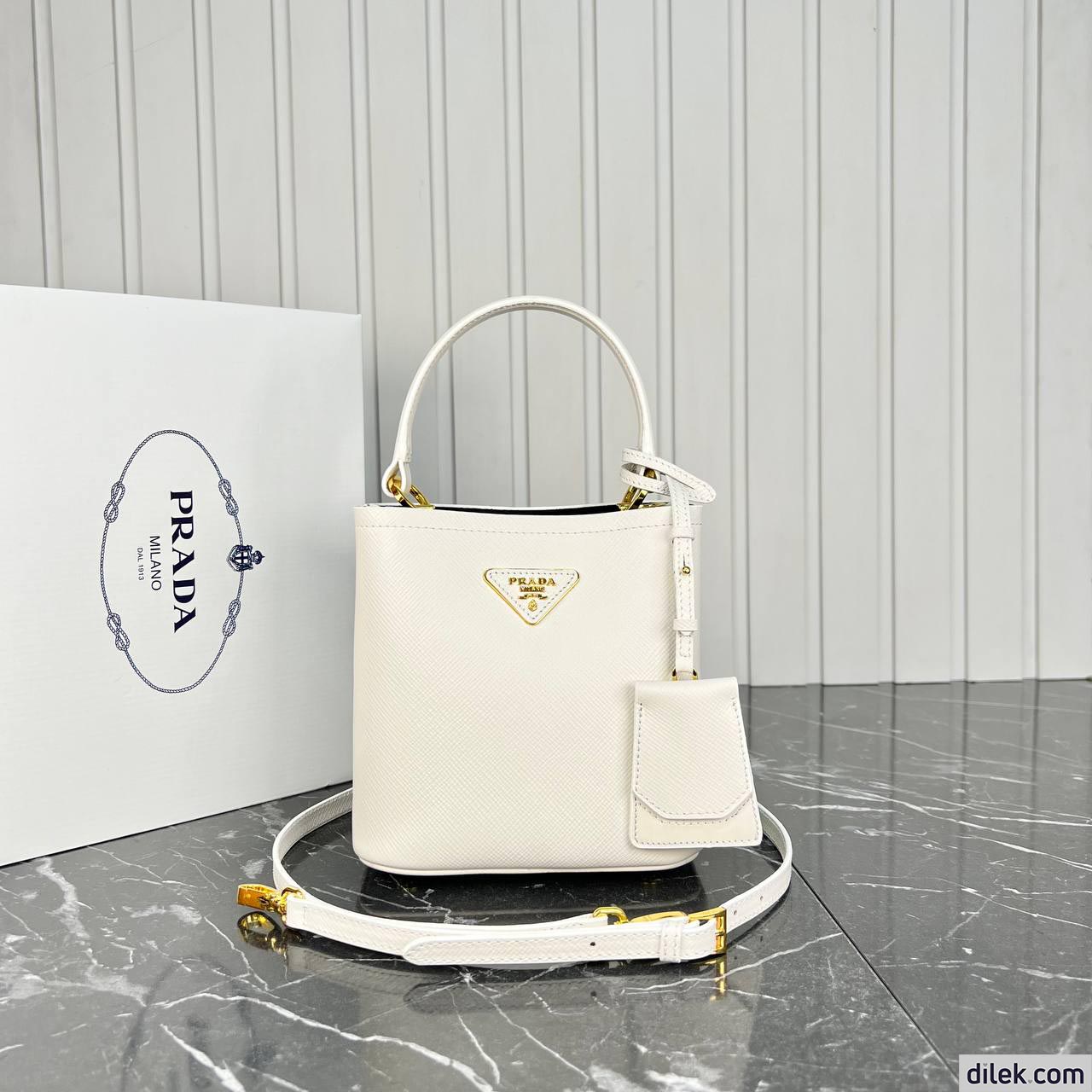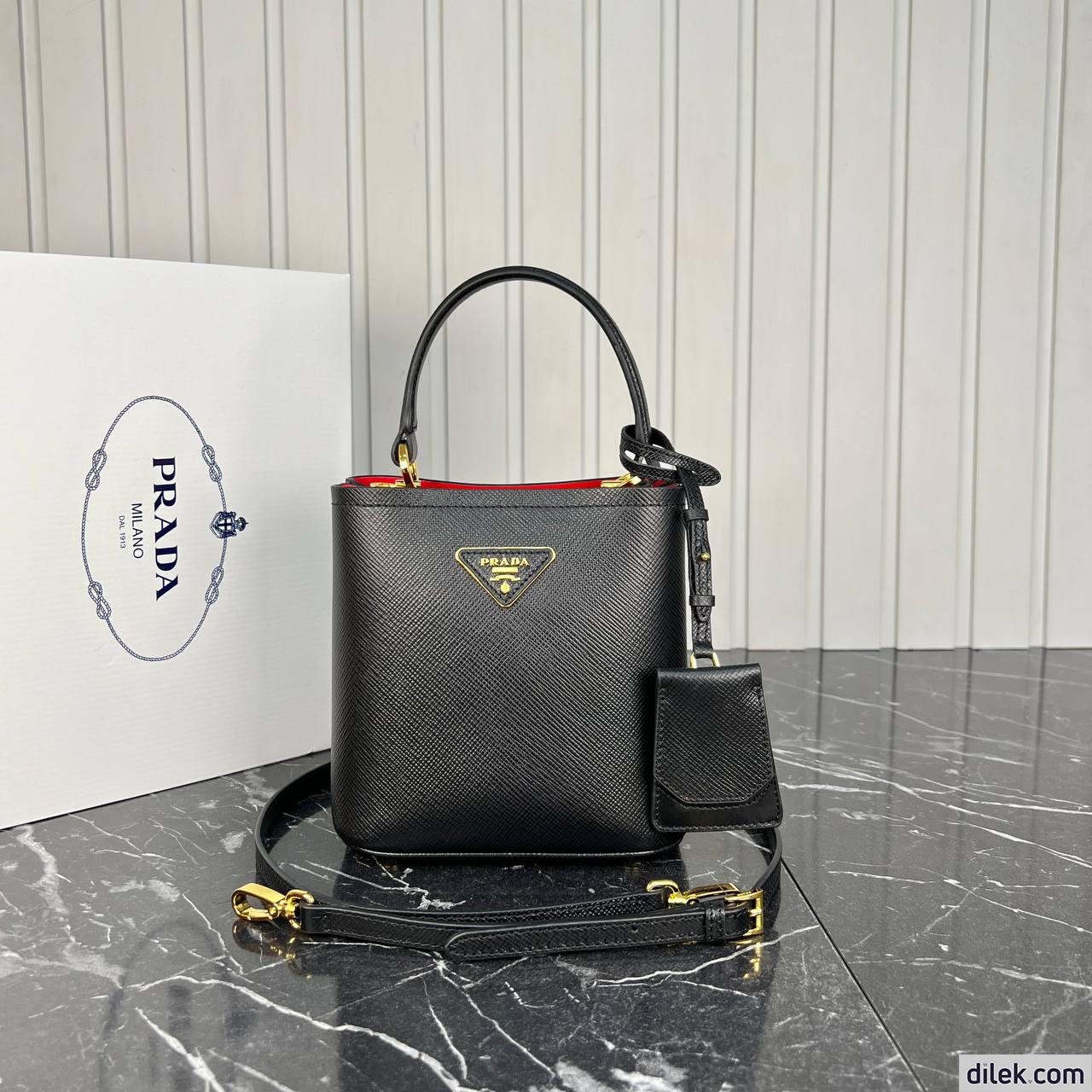 The iconic texture of Saffiano leather characterizes the compact Prada Panier bag. The elegant design of the bag with single handle is distinguished for the strap closure on the top.