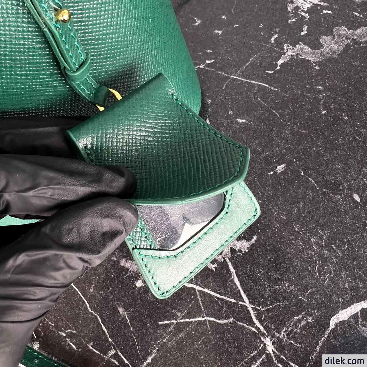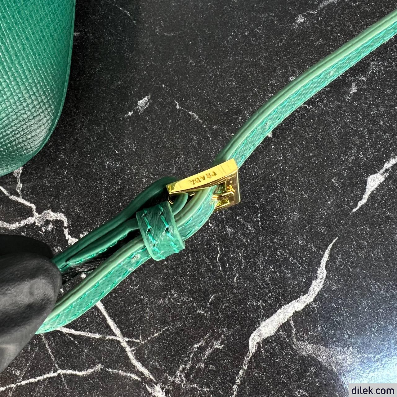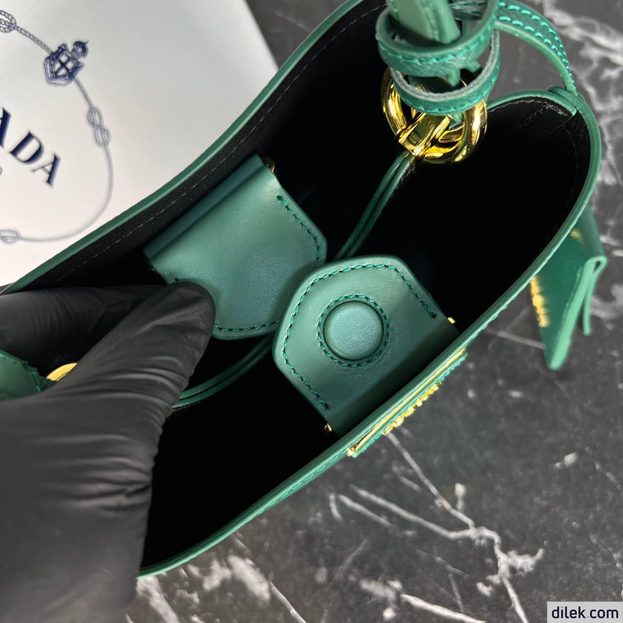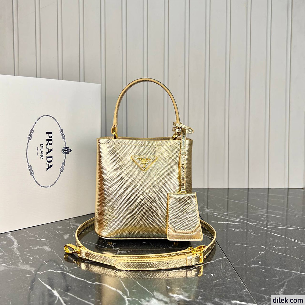 The iconic texture of Saffiano leather characterizes the compact Prada Panier bag. The elegant design of the bag with single handle is distinguished for the strap closure on the top.