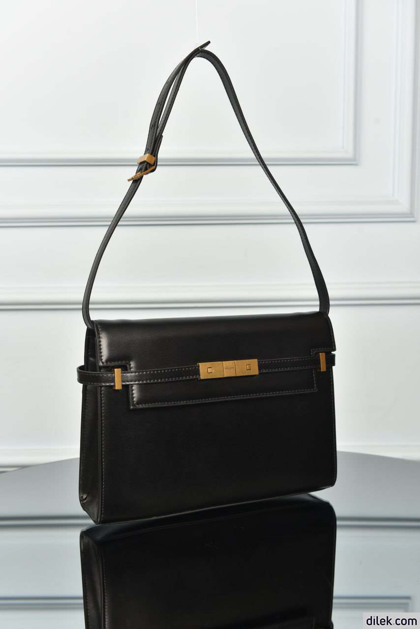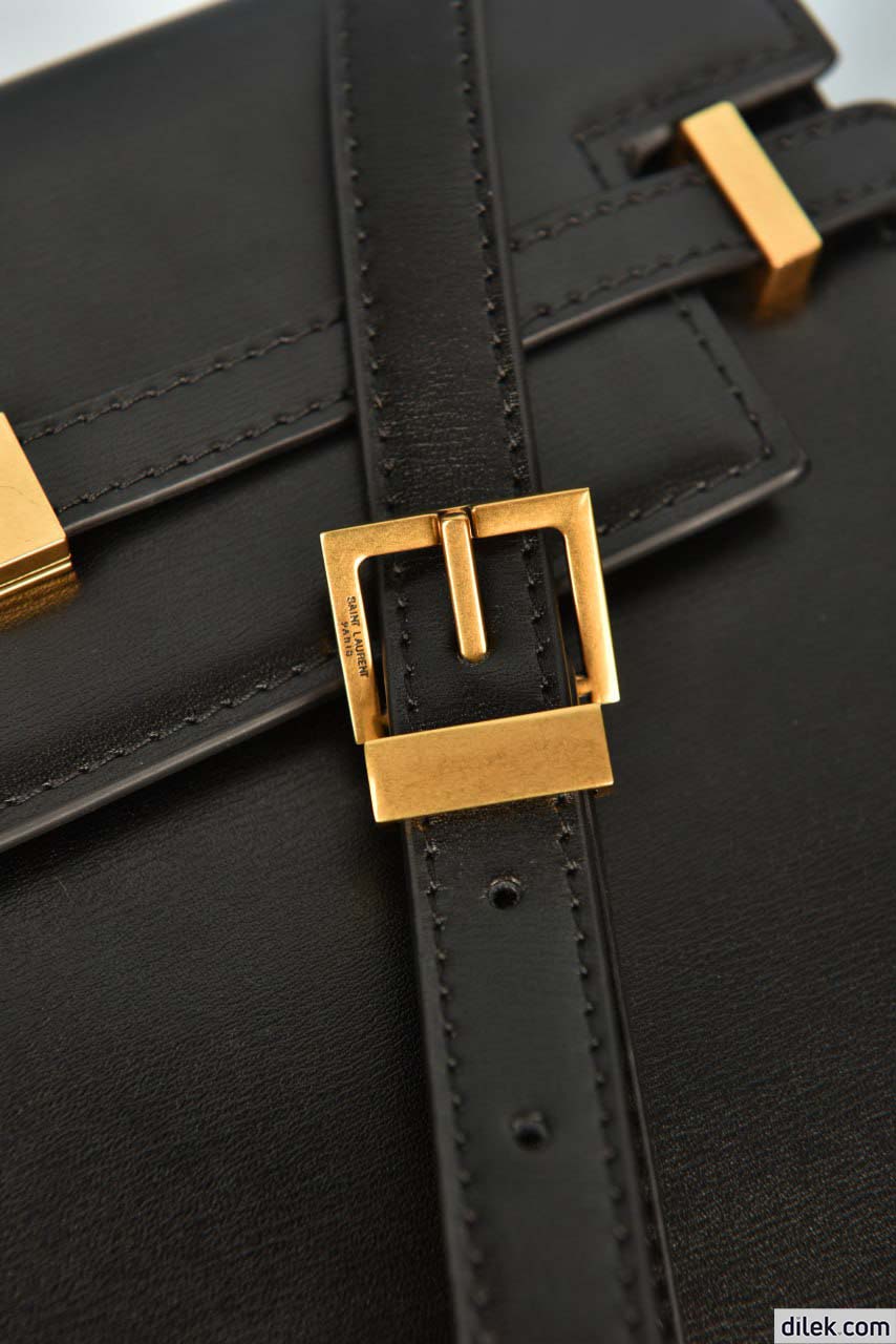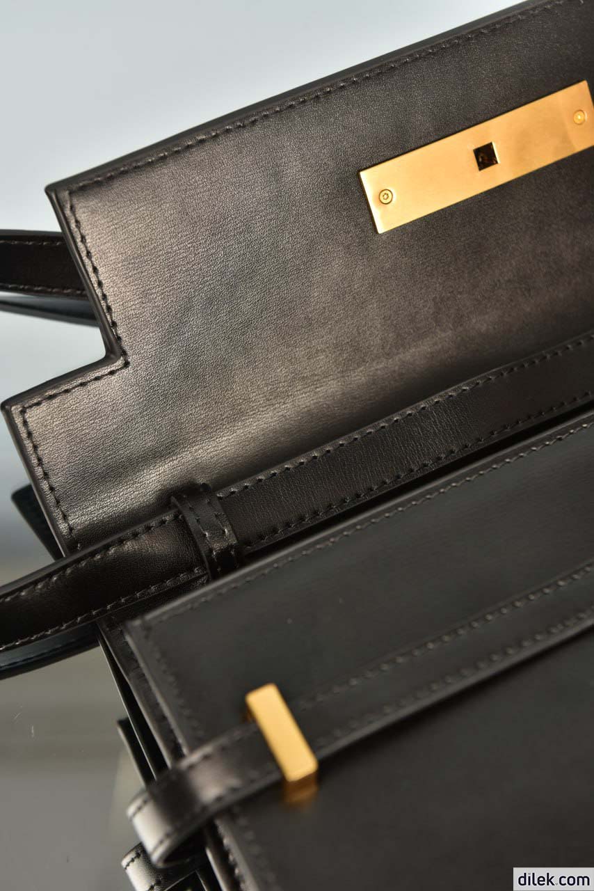 Manhattan with small flap on top, compression tabs on the sides and an adjustable, detachable shoulder strap.