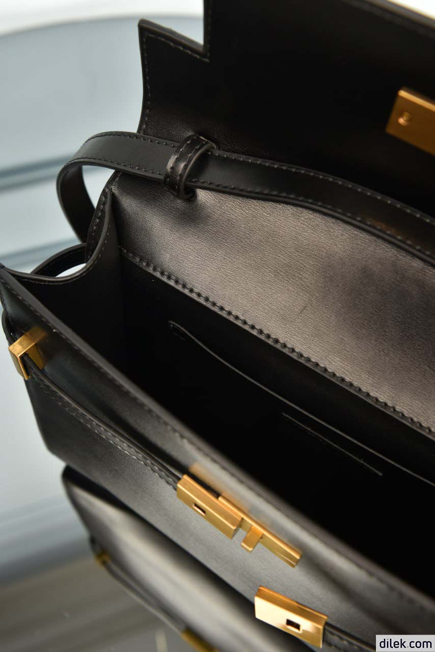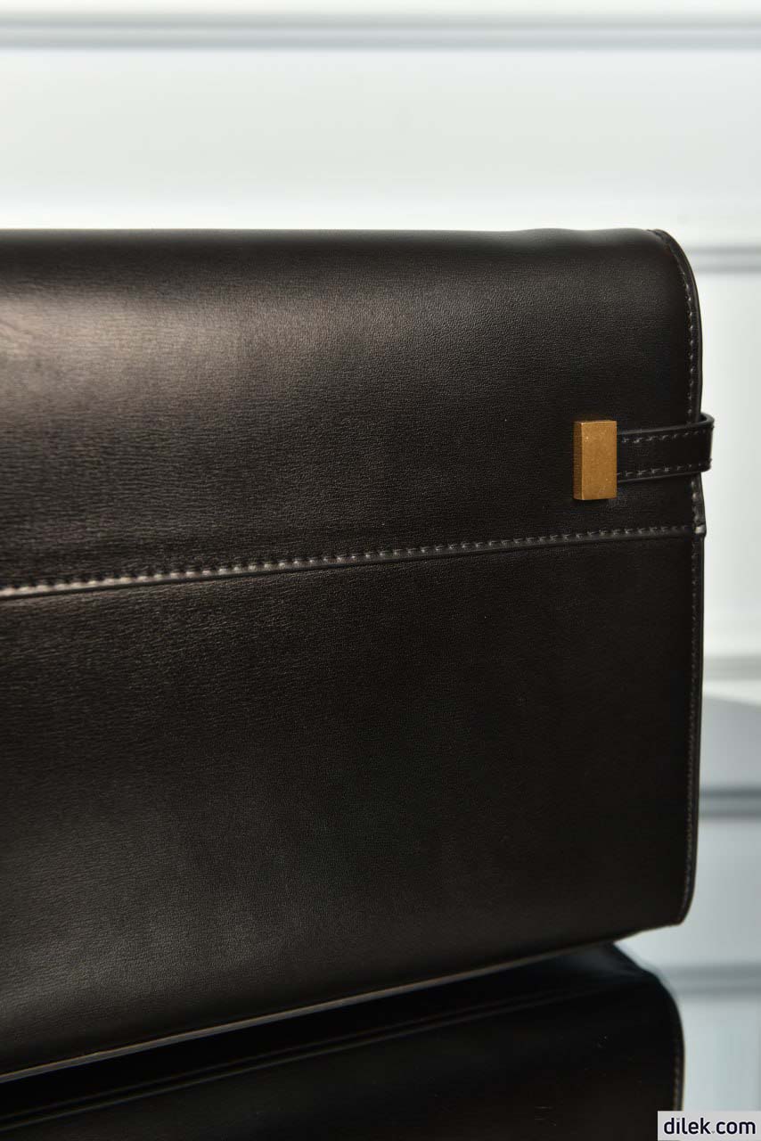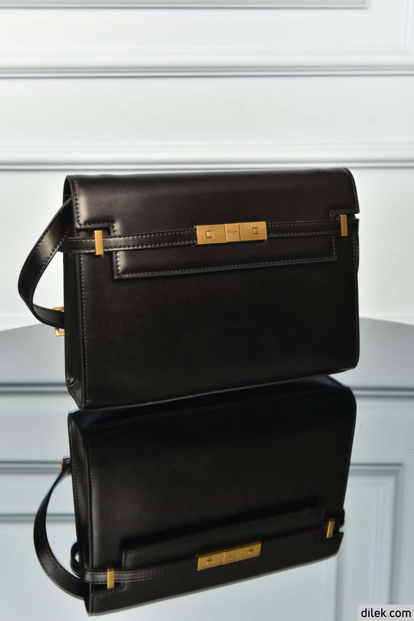 Manhattan with small flap on top, compression tabs on the sides and an adjustable, detachable shoulder strap.