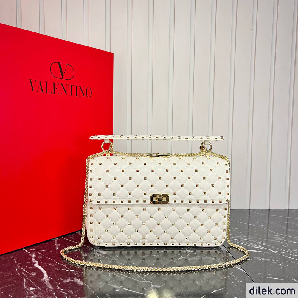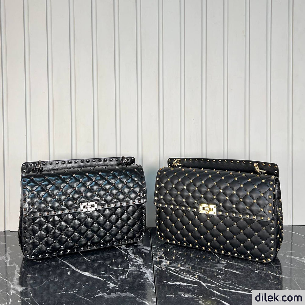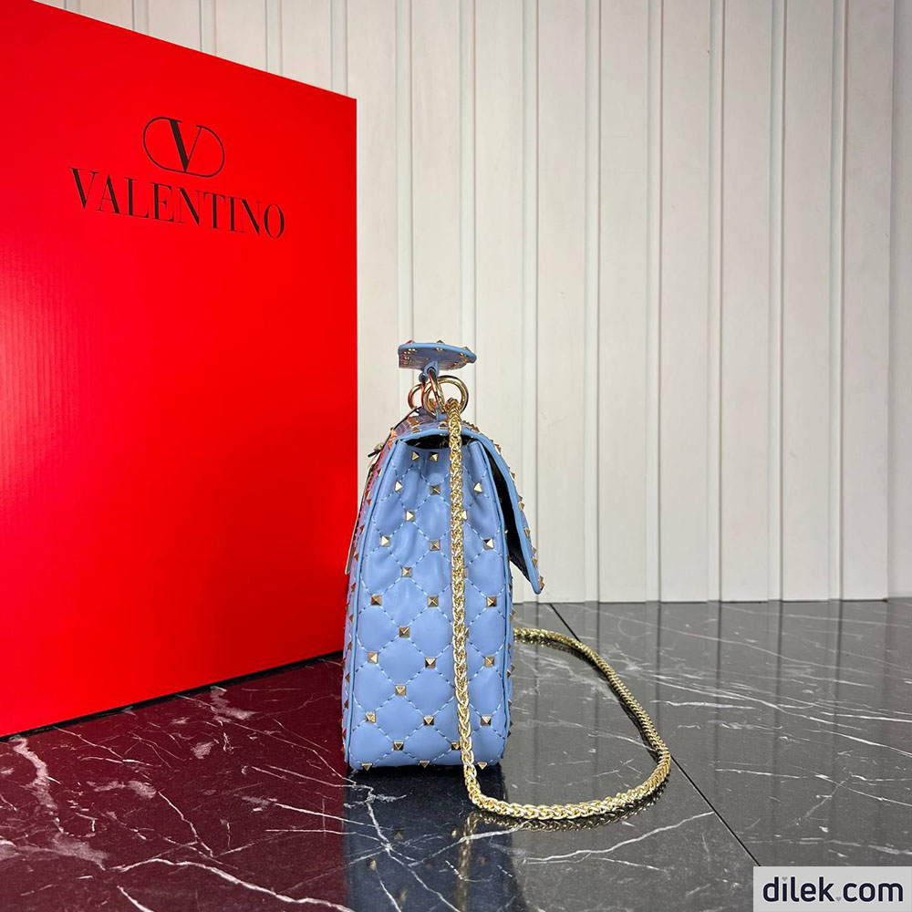 Medium Valentino Garavani Rockstud Spike bag in supple Nappa lambskin with chain. Quilted construction, embellished with small studs. Equipped with both a detachable sliding chain strap and a detachable handle, this accessory can be worn as a crossbody/shoulder bag or used as a handbag.