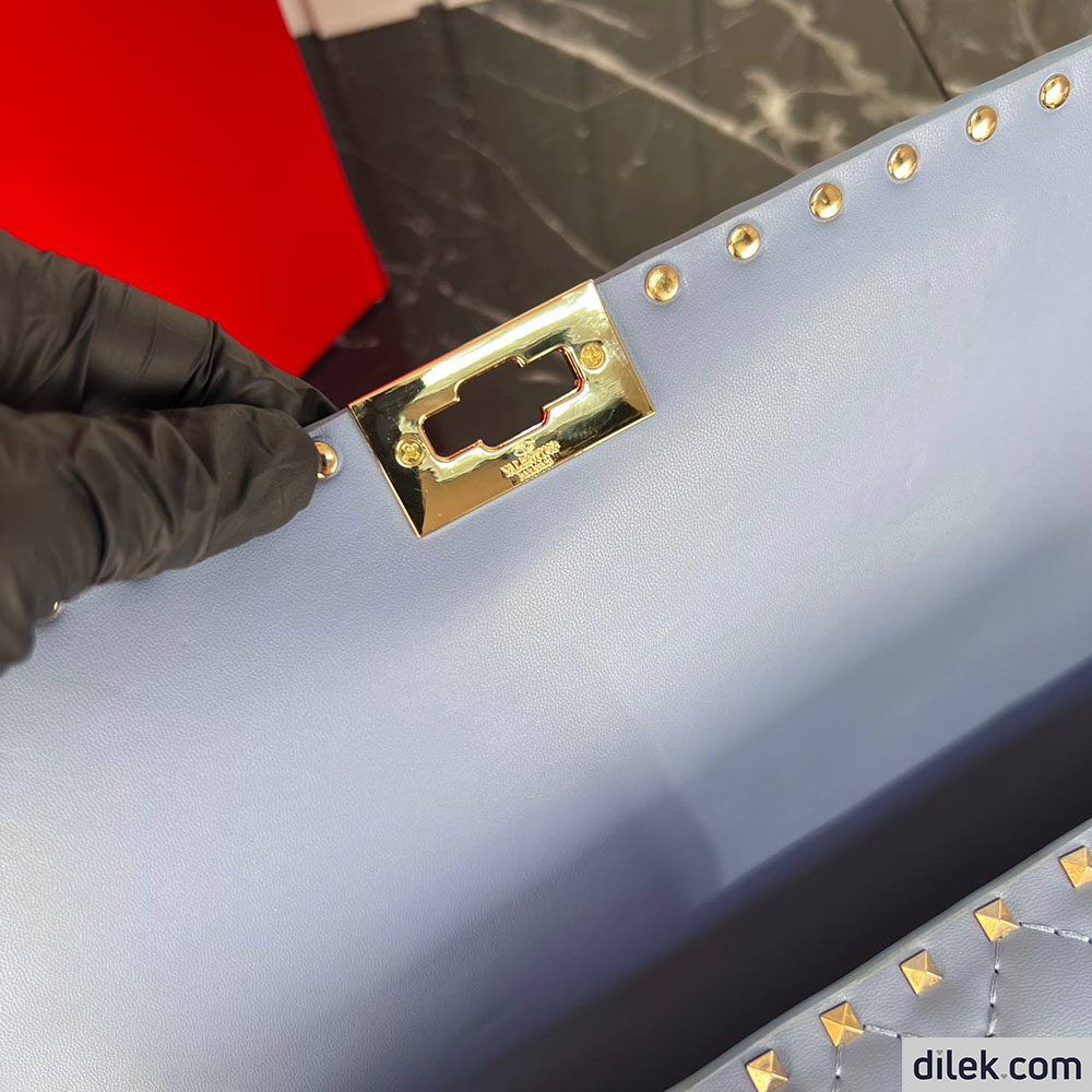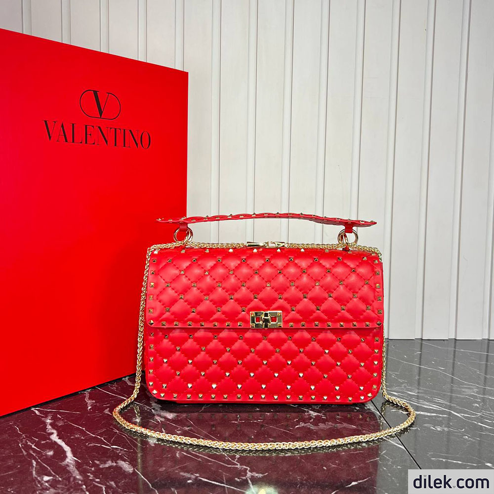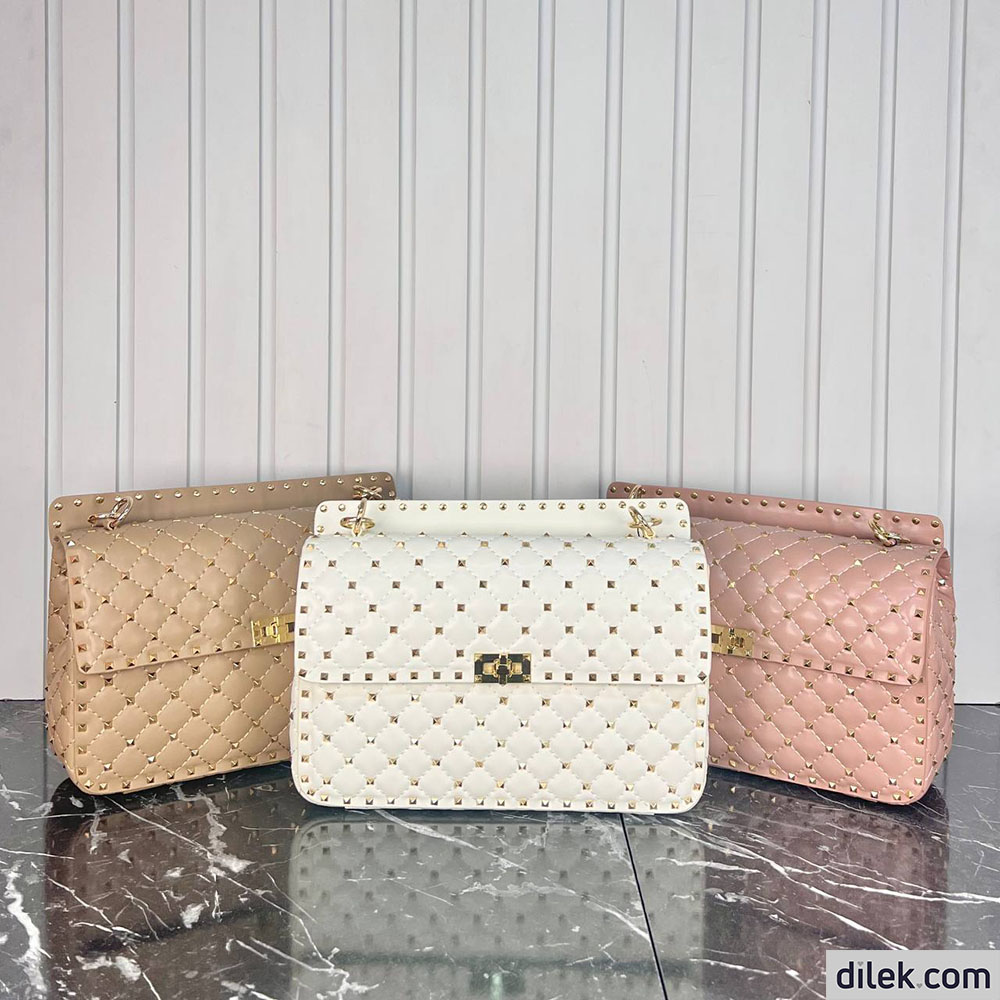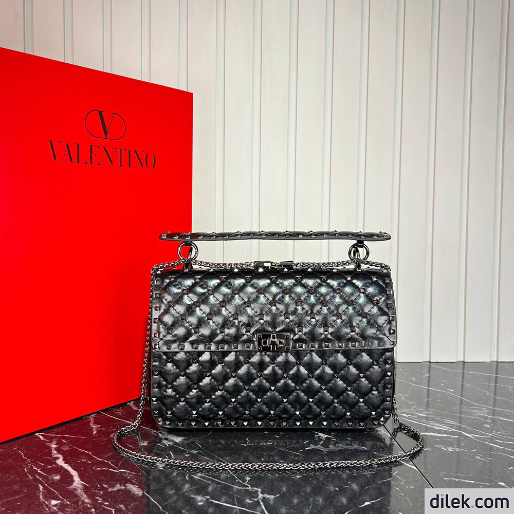 Medium Valentino Garavani Rockstud Spike bag in supple Nappa lambskin with chain. Quilted construction, embellished with small studs. Equipped with both a detachable sliding chain strap and a detachable handle, this accessory can be worn as a crossbody/shoulder bag or used as a handbag.