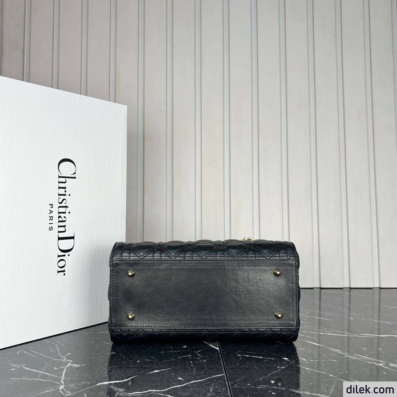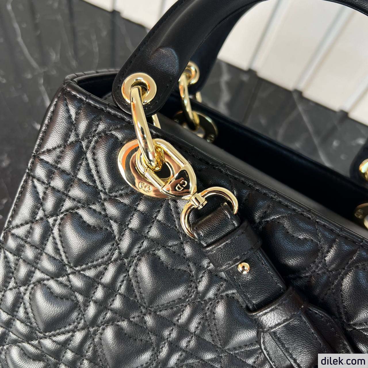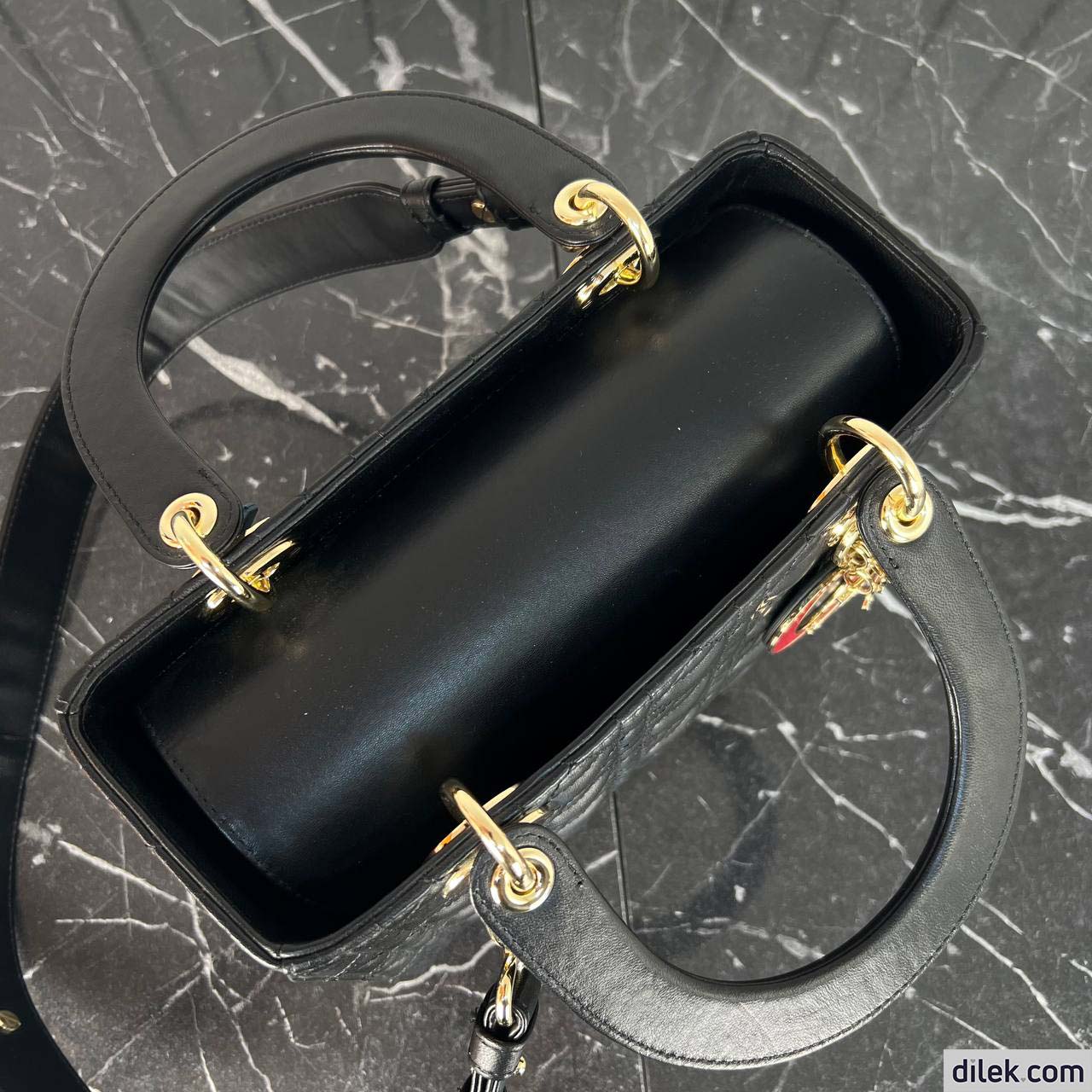 The Lady Dior bag epitomizes the House's vision of elegance and beauty. Sleek and refined, the timeless yet relevant style is crafted in black lambskin with Cannage stitching, creating the instantly recognizable quilted texture. The pale gold-finish metal D.I.O.R. charms lend a polished touch to the style. Featuring a thin, removable leather shoulder strap, the large Lady Dior bag can be carried by hand, worn over the shoulder or crossbody as an ideal evening companion.