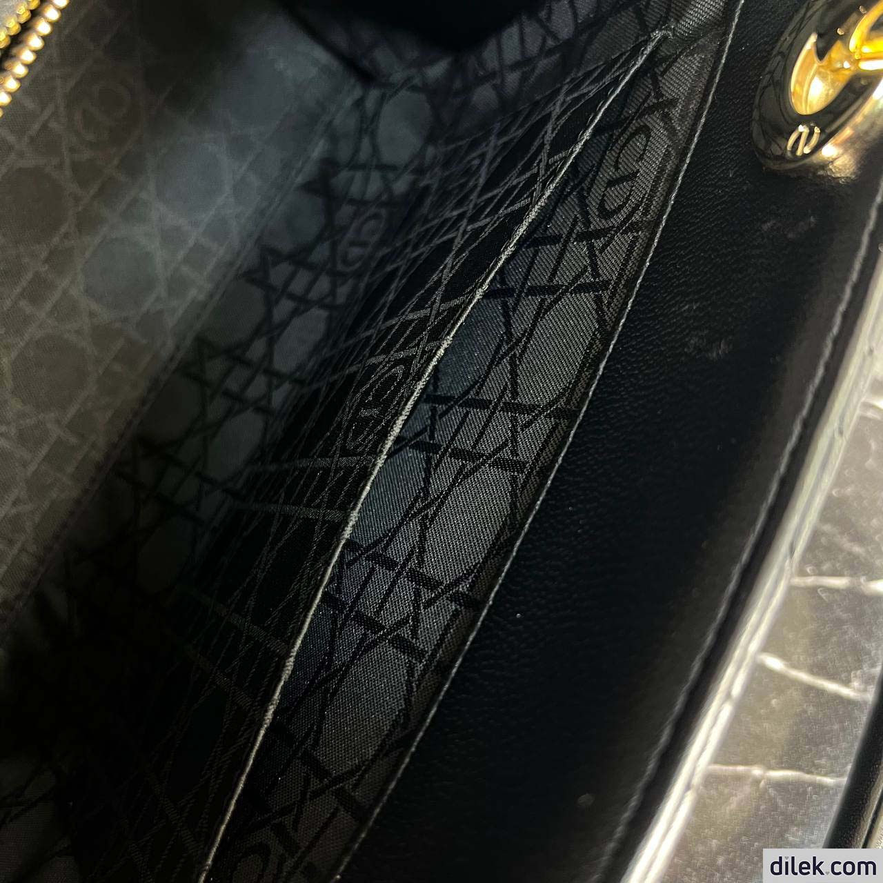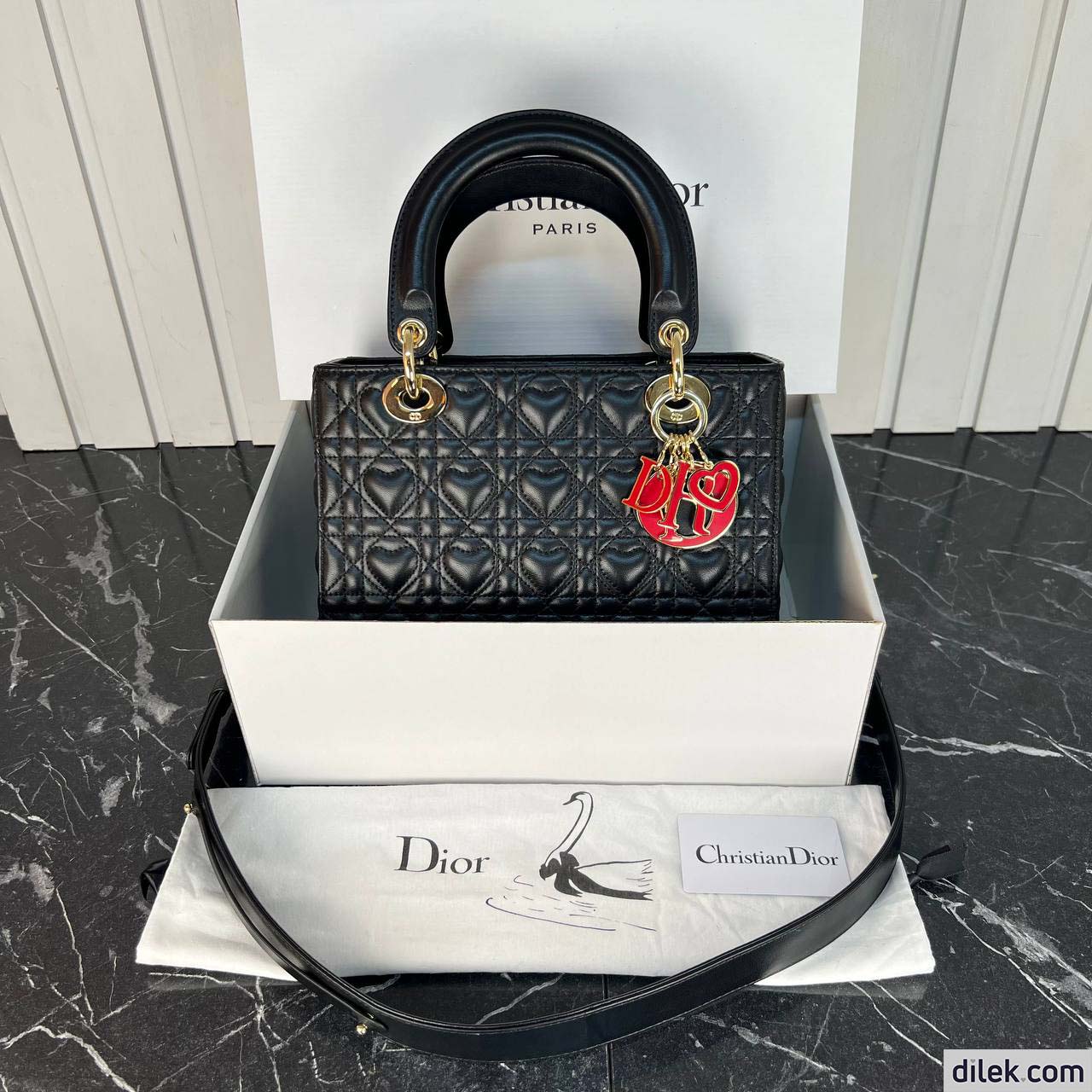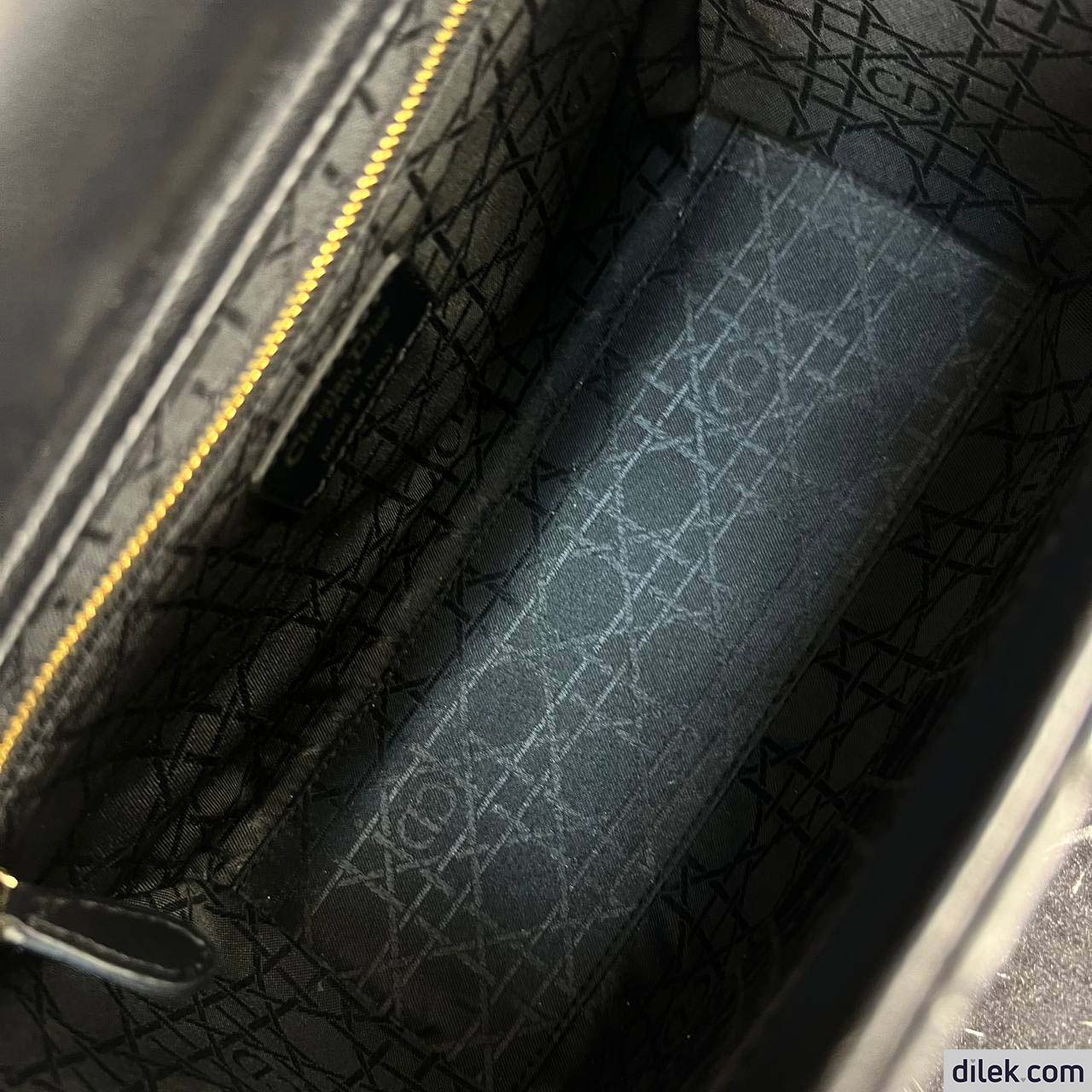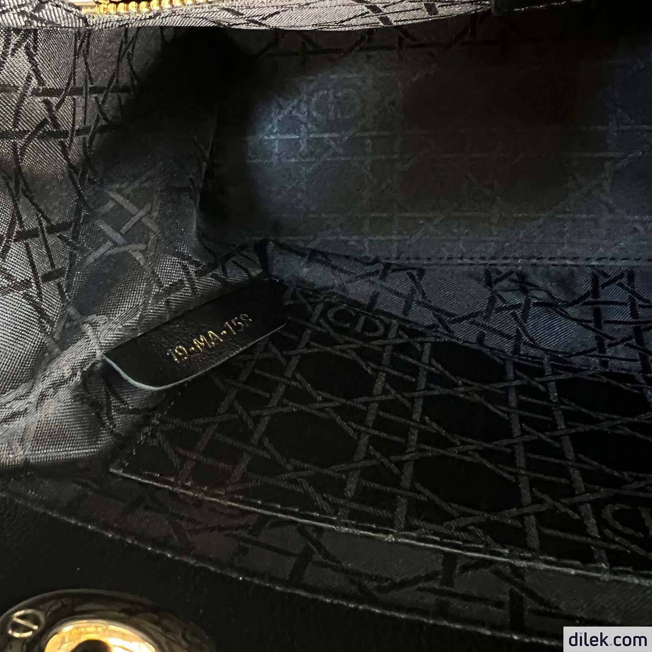 The Lady Dior bag epitomizes the House's vision of elegance and beauty. Sleek and refined, the timeless yet relevant style is crafted in black lambskin with Cannage stitching, creating the instantly recognizable quilted texture. The pale gold-finish metal D.I.O.R. charms lend a polished touch to the style. Featuring a thin, removable leather shoulder strap, the large Lady Dior bag can be carried by hand, worn over the shoulder or crossbody as an ideal evening companion.