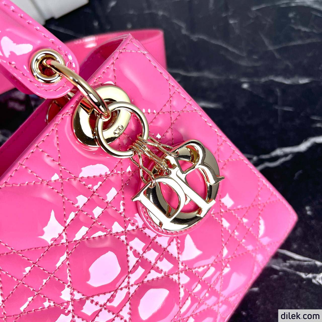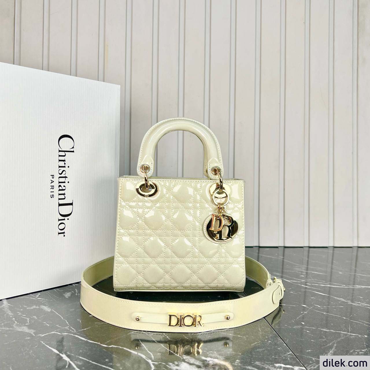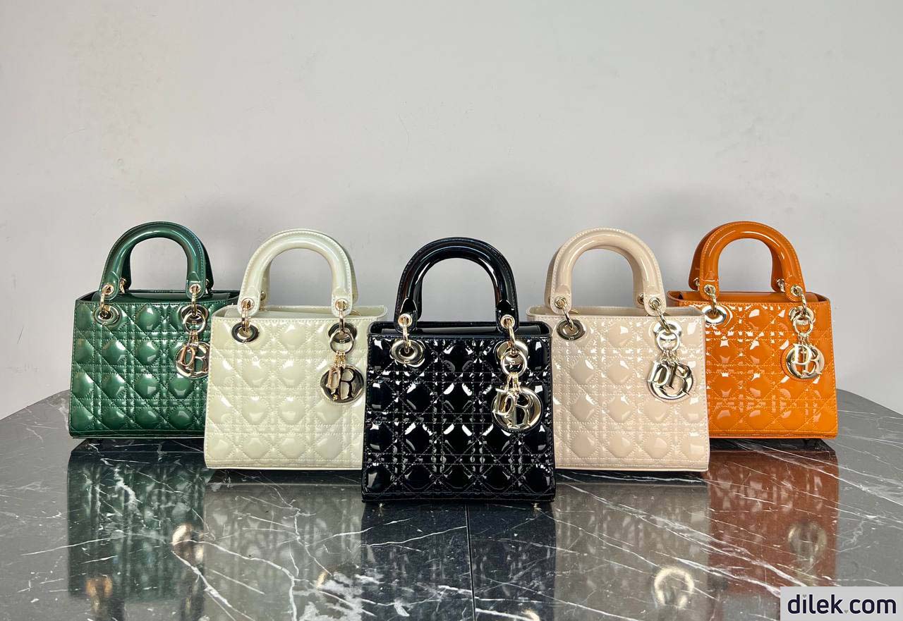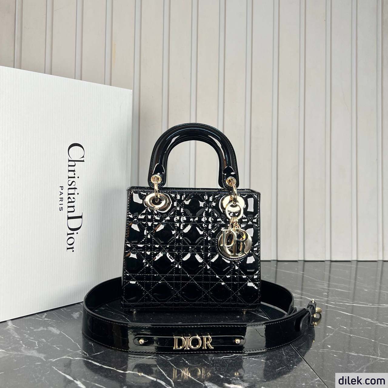 The Lady Dior bag epitomizes the House's vision of elegance and beauty. Sleek and refined, the timeless yet relevant style is crafted in black patent calfskin with Cannage stitching, creating the instantly recognizable quilted texture. The pale gold-finish metal D.I.O.R. charms complete and illuminate its silhouette. Featuring a thin, removable leather shoulder strap, the medium Lady Dior bag can be carried by hand, worn over the shoulder or crossbody.