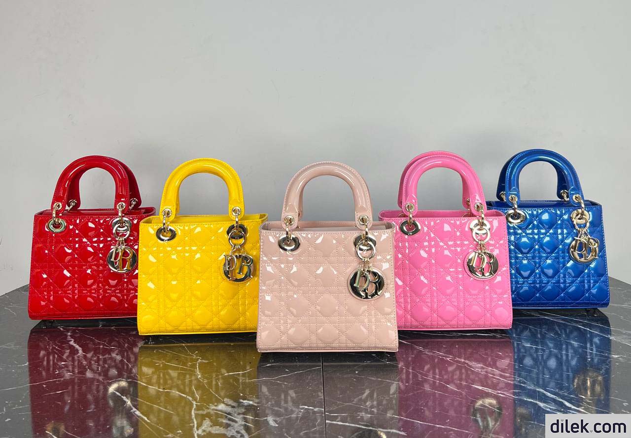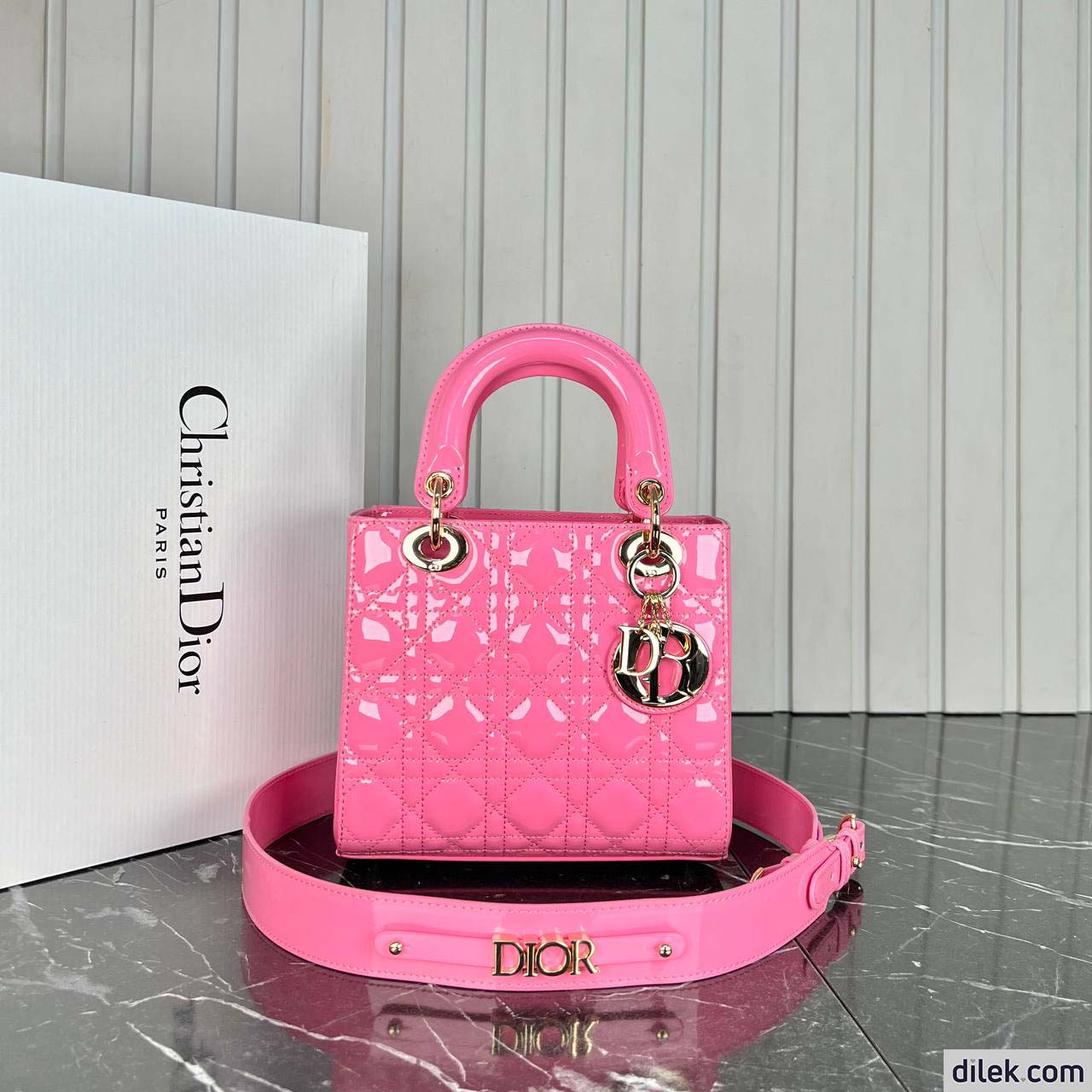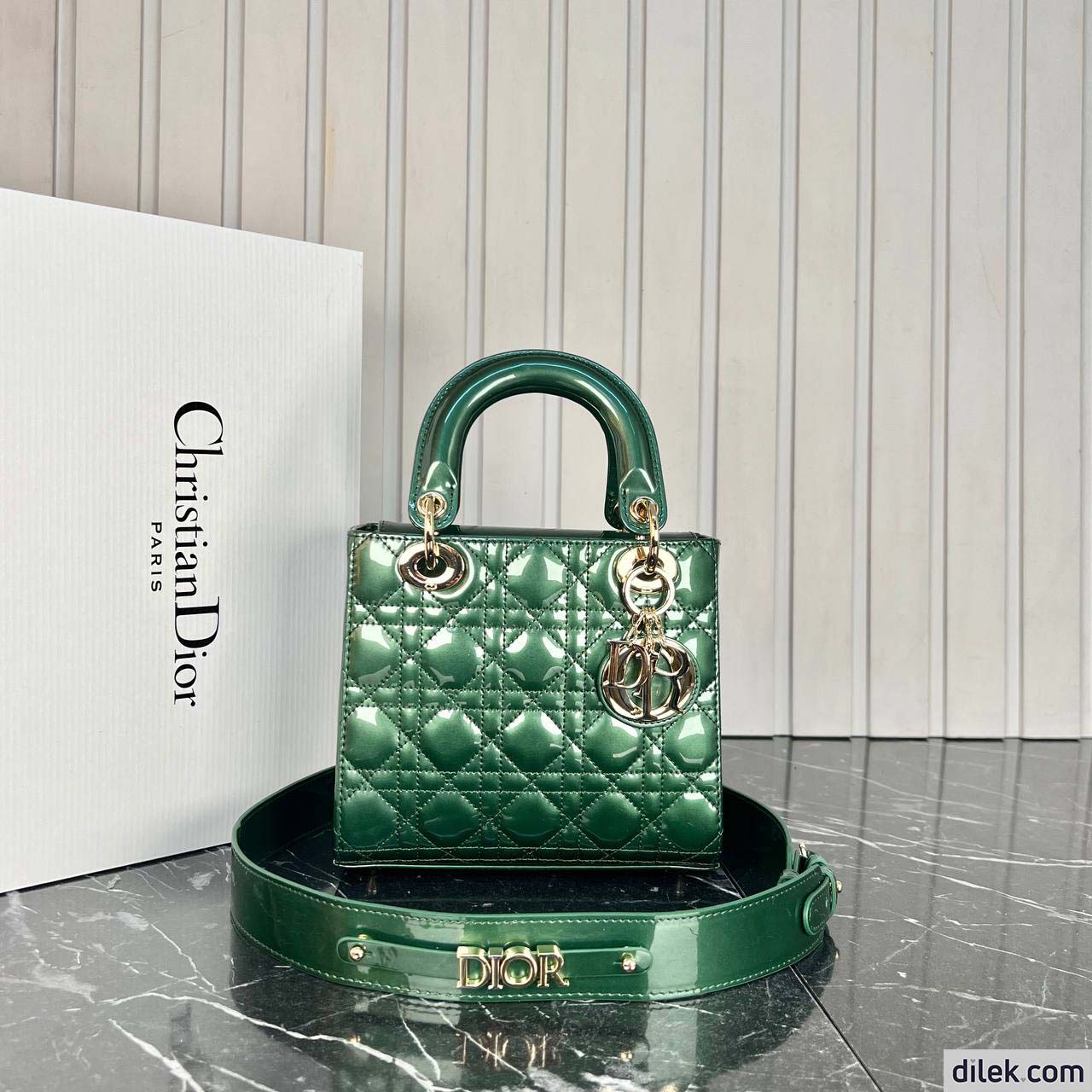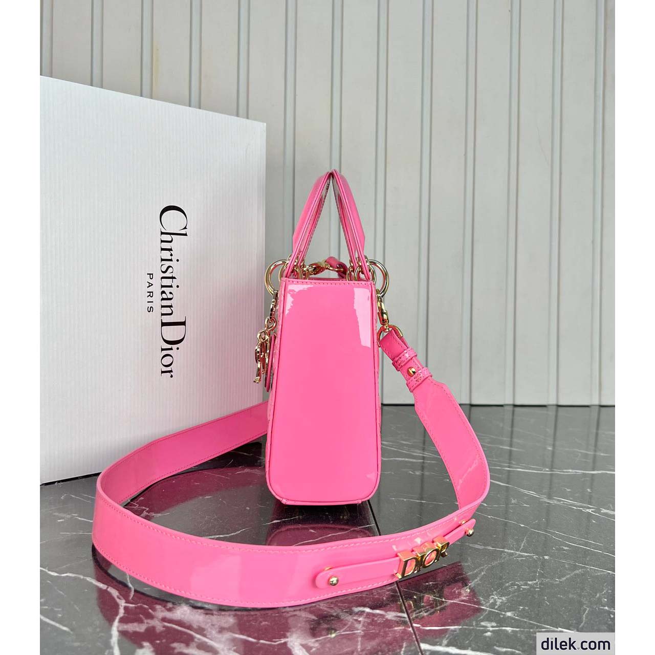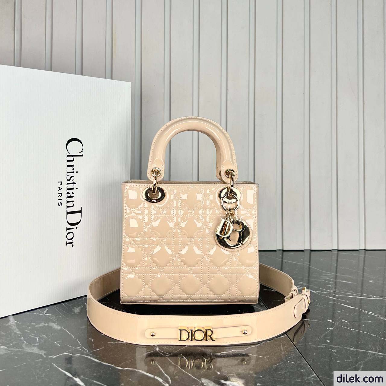 The Lady Dior bag epitomizes the House's vision of elegance and beauty. Sleek and refined, the timeless yet relevant style is crafted in black patent calfskin with Cannage stitching, creating the instantly recognizable quilted texture. The pale gold-finish metal D.I.O.R. charms complete and illuminate its silhouette. Featuring a thin, removable leather shoulder strap, the medium Lady Dior bag can be carried by hand, worn over the shoulder or crossbody.