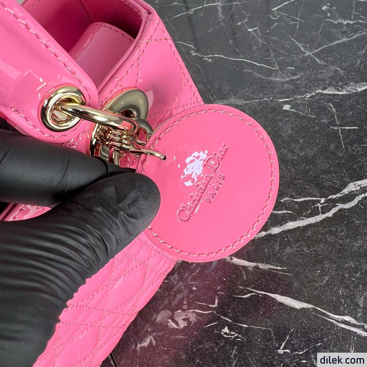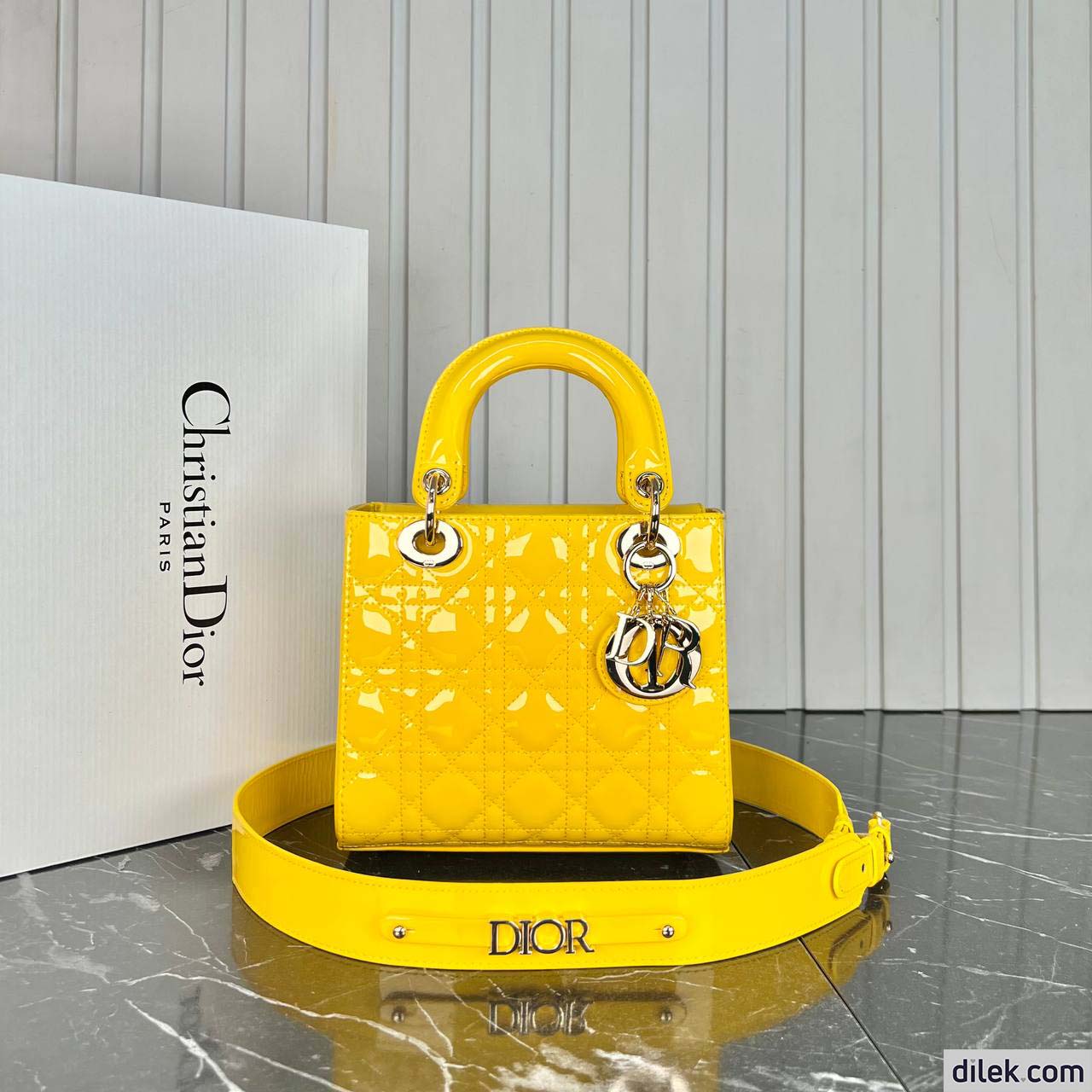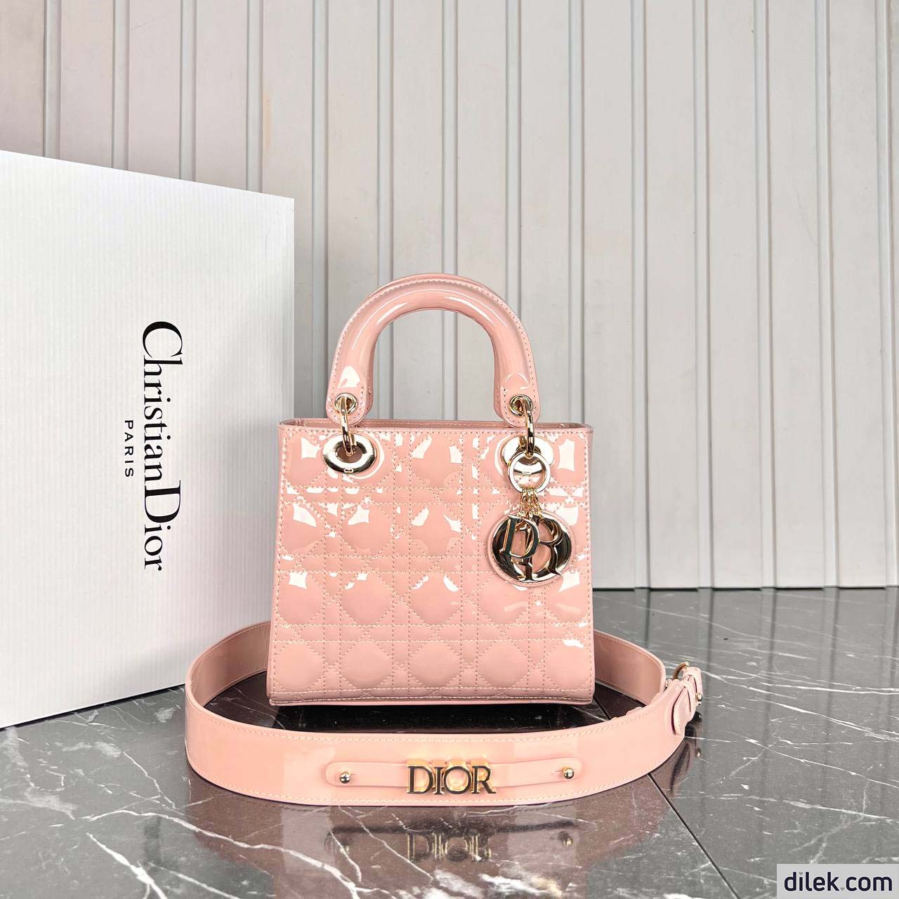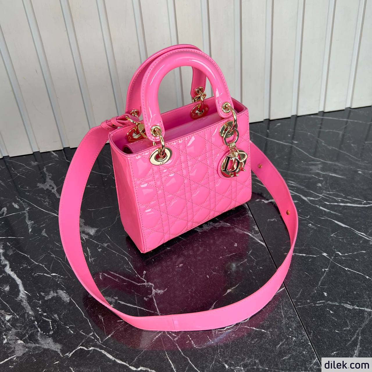The Lady Dior bag epitomizes the House's vision of elegance and beauty. Sleek and refined, the timeless yet relevant style is crafted in black patent calfskin with Cannage stitching, creating the instantly recognizable quilted texture. The pale gold-finish metal D.I.O.R. charms complete and illuminate its silhouette. Featuring a thin, removable leather shoulder strap, the medium Lady Dior bag can be carried by hand, worn over the shoulder or crossbody.