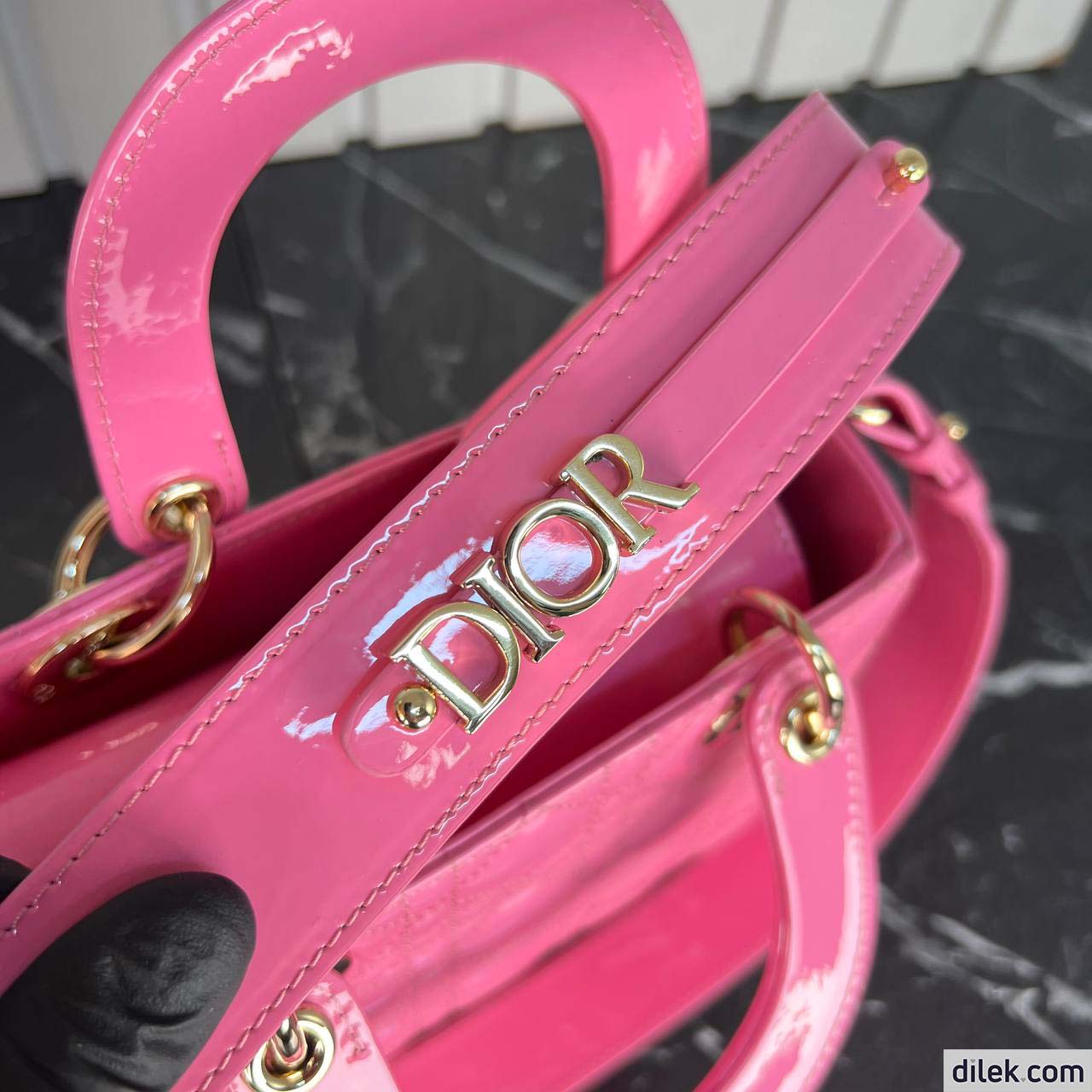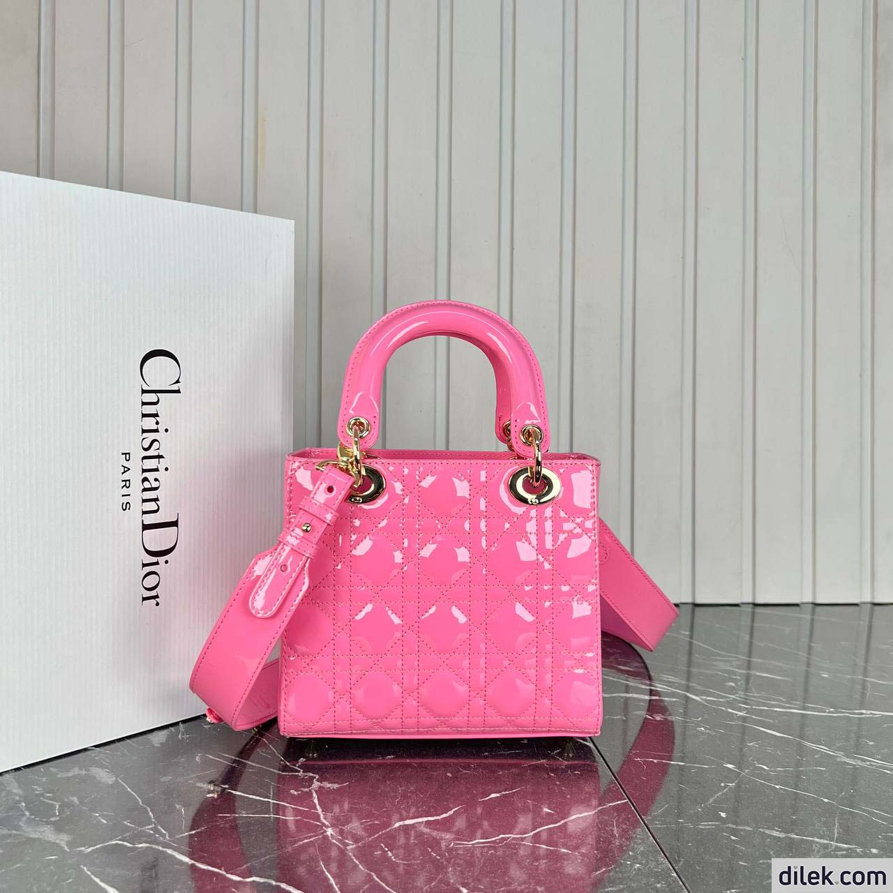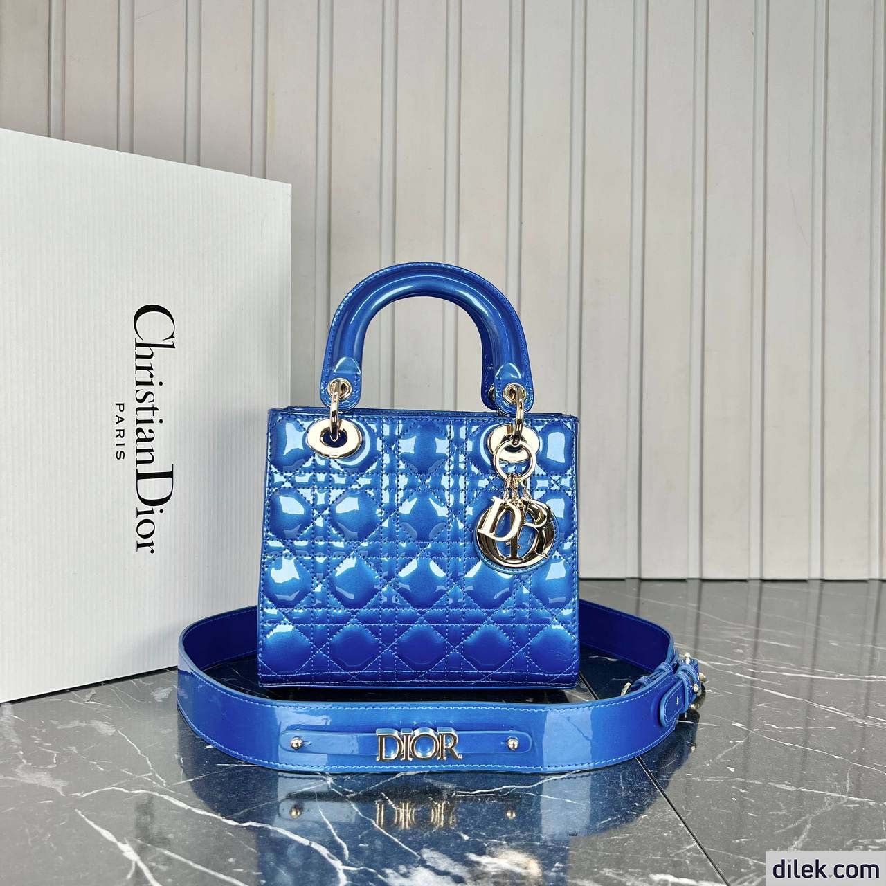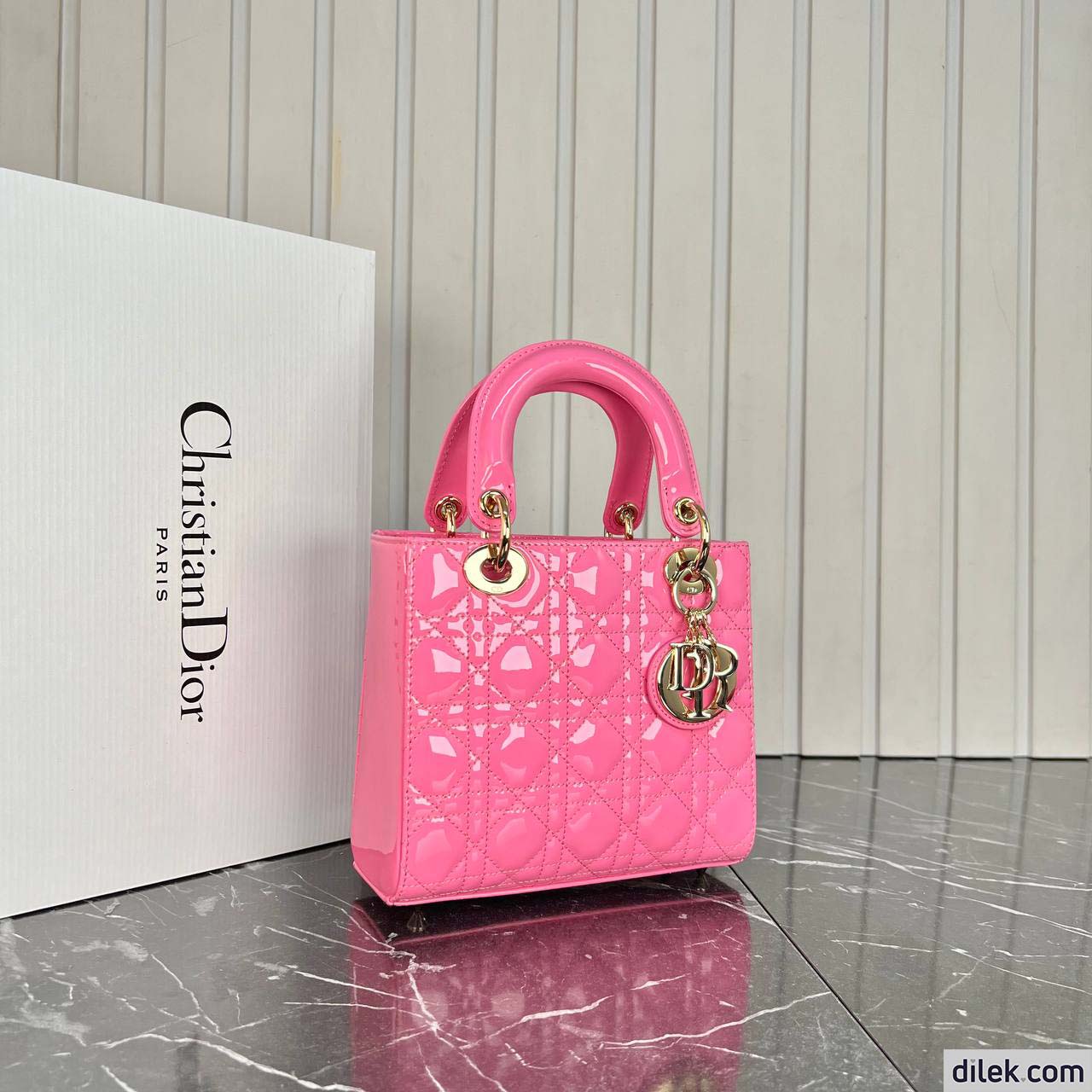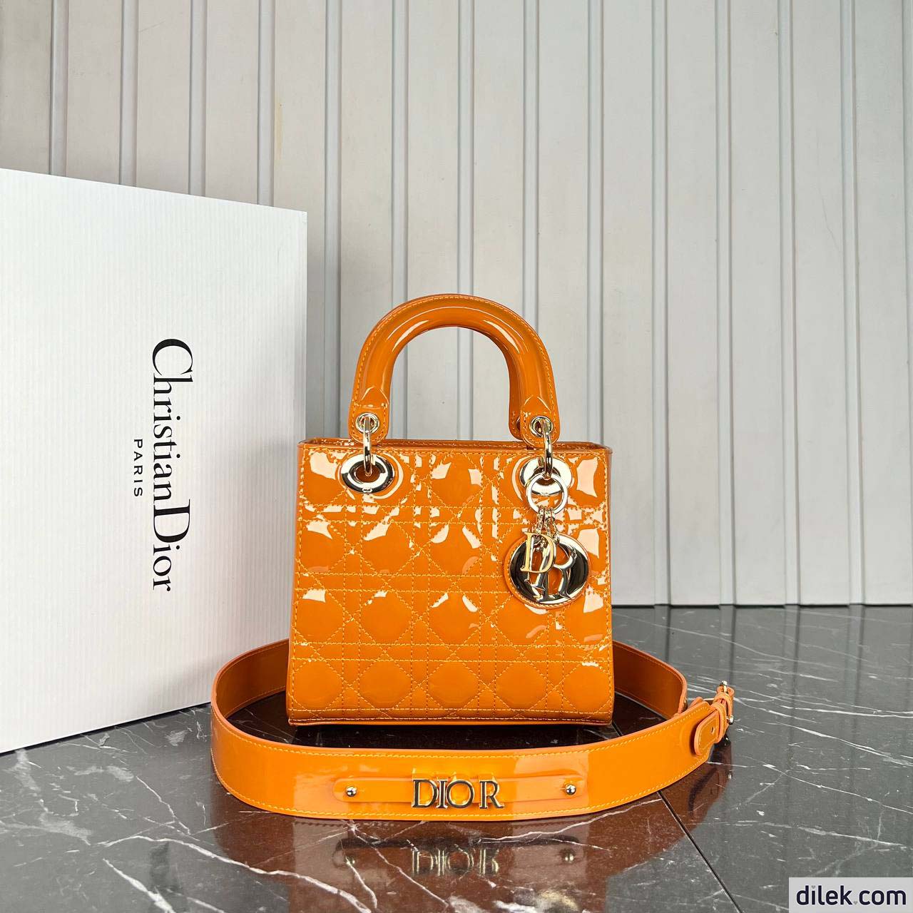 The Lady Dior bag epitomizes the House's vision of elegance and beauty. Sleek and refined, the timeless yet relevant style is crafted in black patent calfskin with Cannage stitching, creating the instantly recognizable quilted texture. The pale gold-finish metal D.I.O.R. charms complete and illuminate its silhouette. Featuring a thin, removable leather shoulder strap, the medium Lady Dior bag can be carried by hand, worn over the shoulder or crossbody.