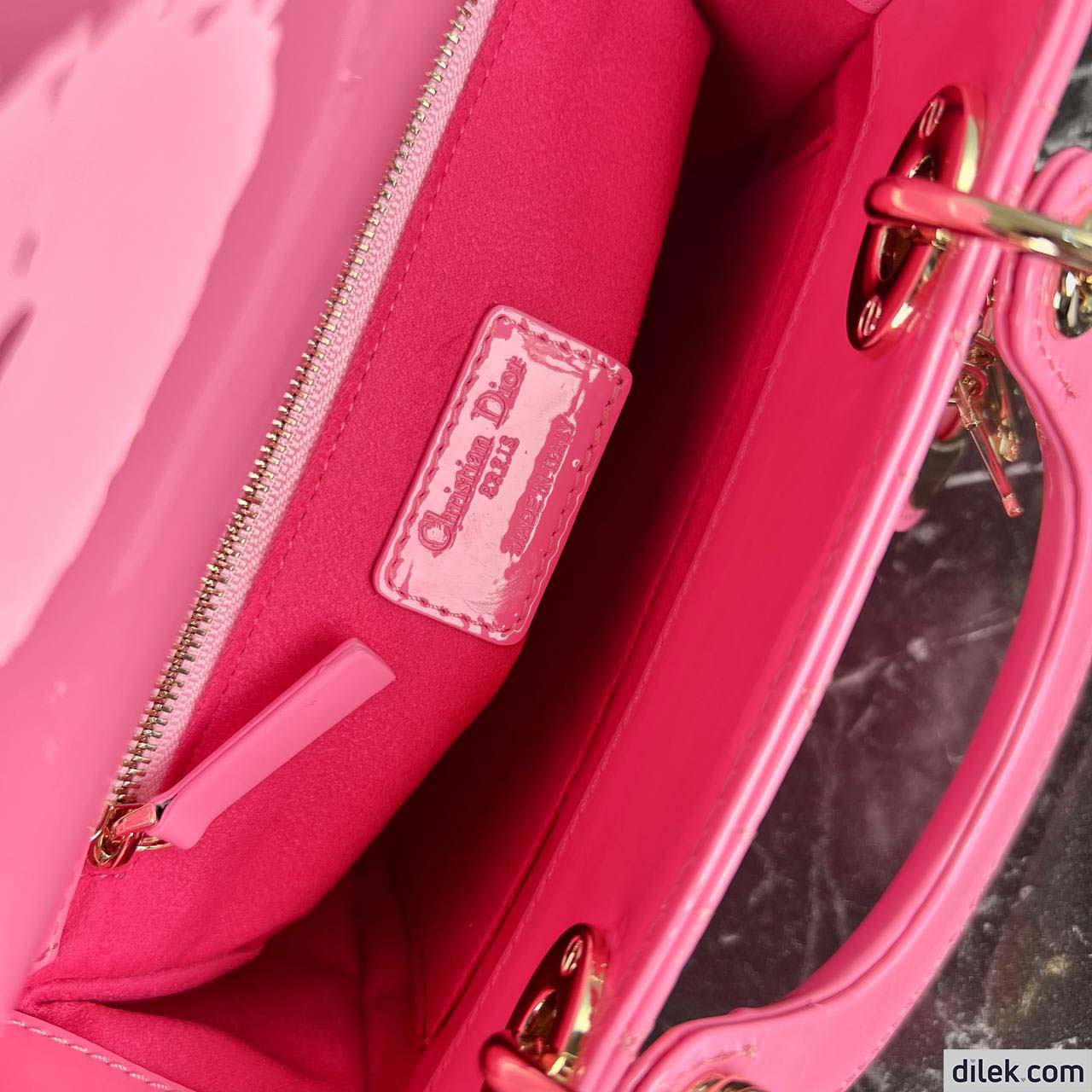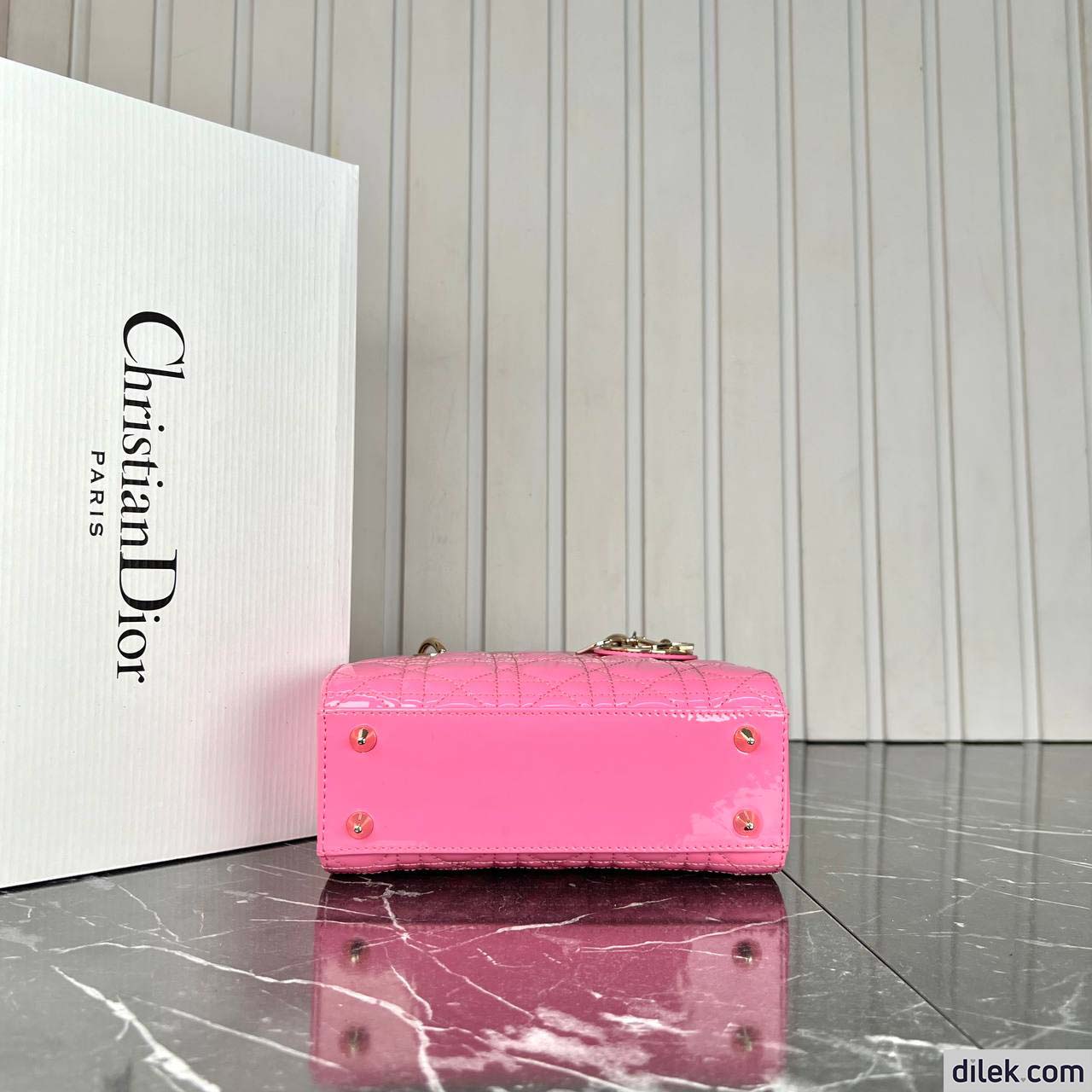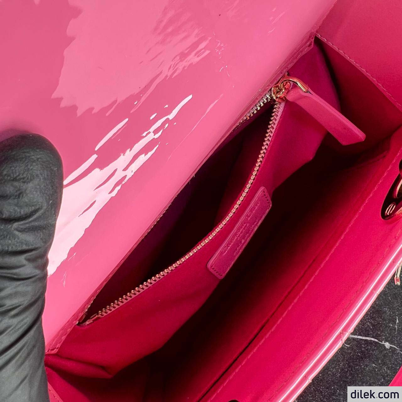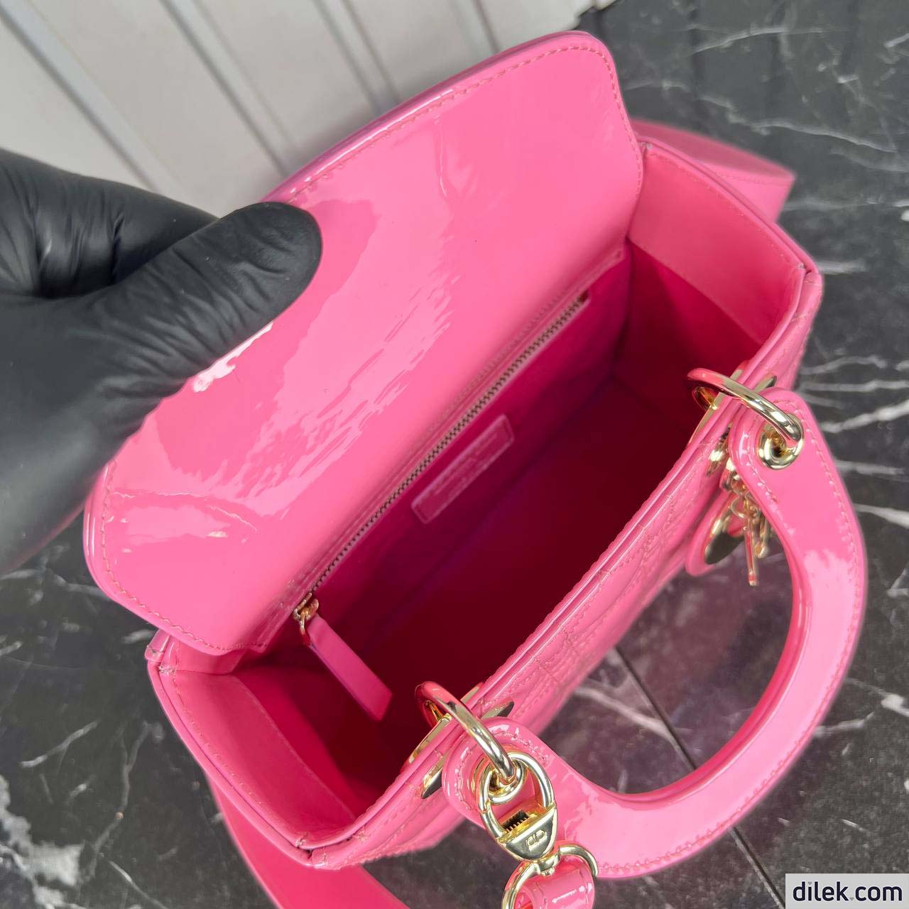 The Lady Dior bag epitomizes the House's vision of elegance and beauty. Sleek and refined, the timeless yet relevant style is crafted in black patent calfskin with Cannage stitching, creating the instantly recognizable quilted texture. The pale gold-finish metal D.I.O.R. charms complete and illuminate its silhouette. Featuring a thin, removable leather shoulder strap, the medium Lady Dior bag can be carried by hand, worn over the shoulder or crossbody.