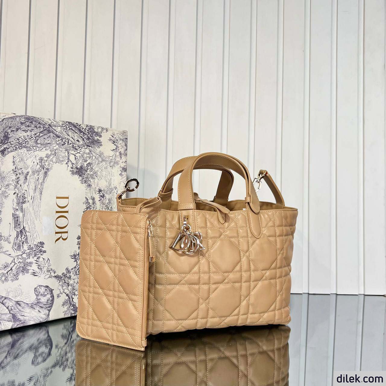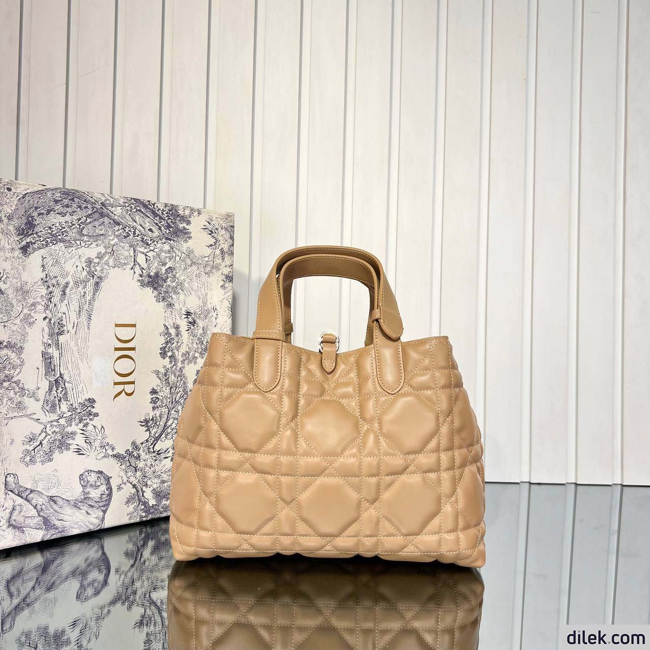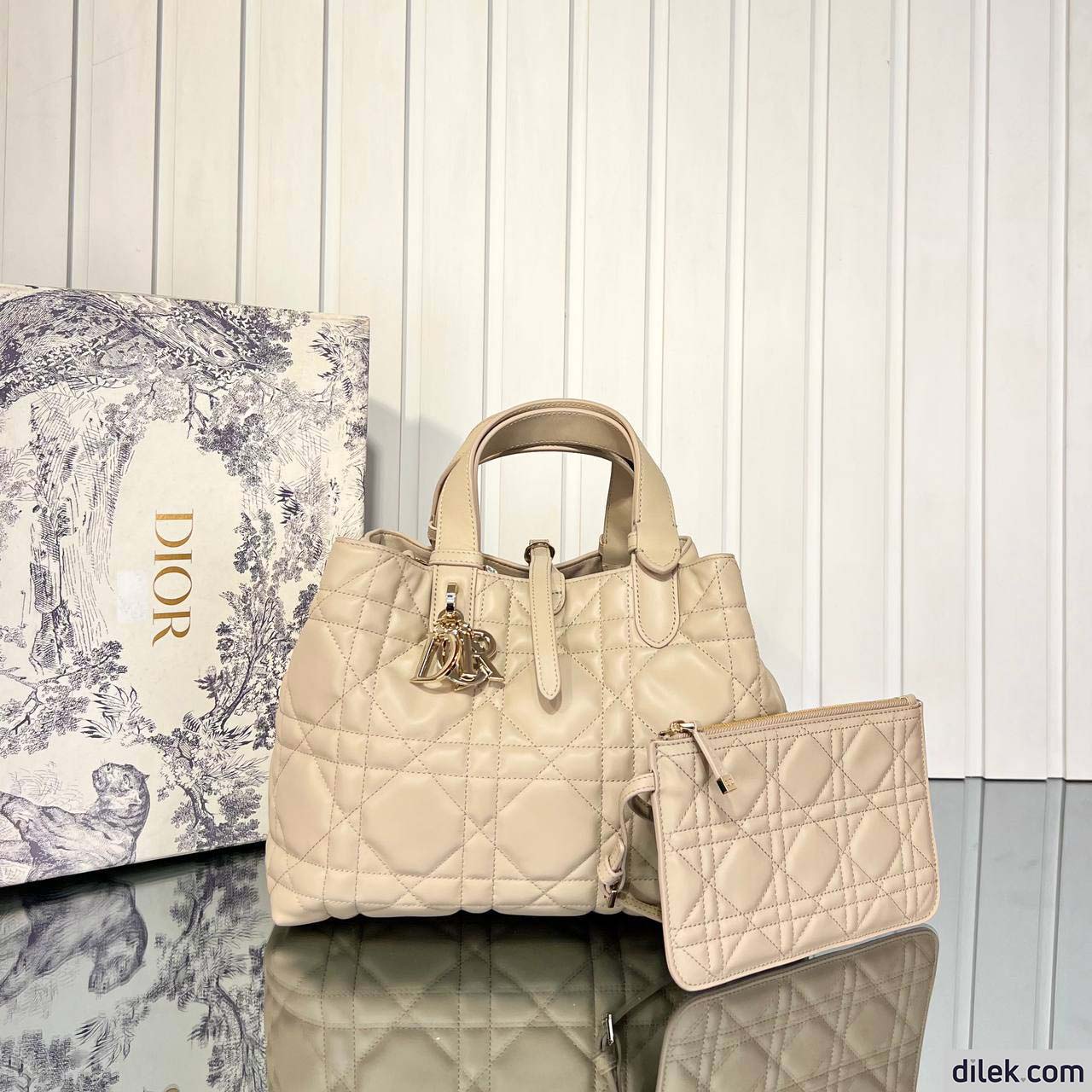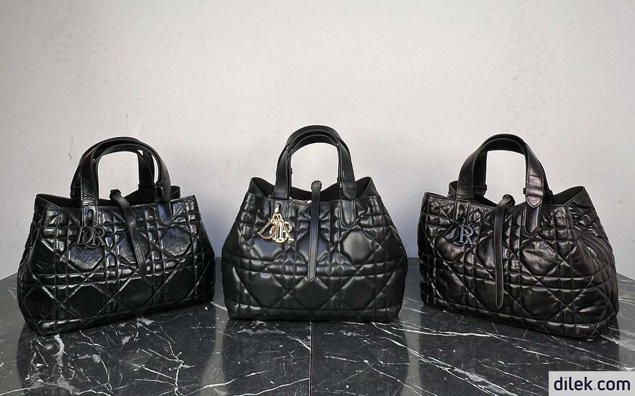 Unveiled at the Spring-Summer 2023 Fashion Show, the Dior Toujours bag is distinguished by a casual and practical design. Crafted in black calfskin with Macrocannage topstitching, it showcases a spacious interior compartment with a matching pouch to organize the essentials. Its thin leather strap closure keeps items secure while the D of the CD Lock clasp twists to adjust the sides and enhance the bag's silhouette. The leather handles can be adjusted using the small notches in order to be able to carry the medium bag by hand or wear it over the shoulder.
