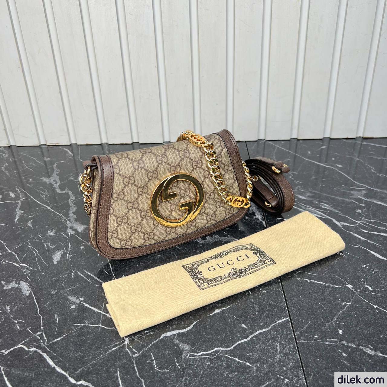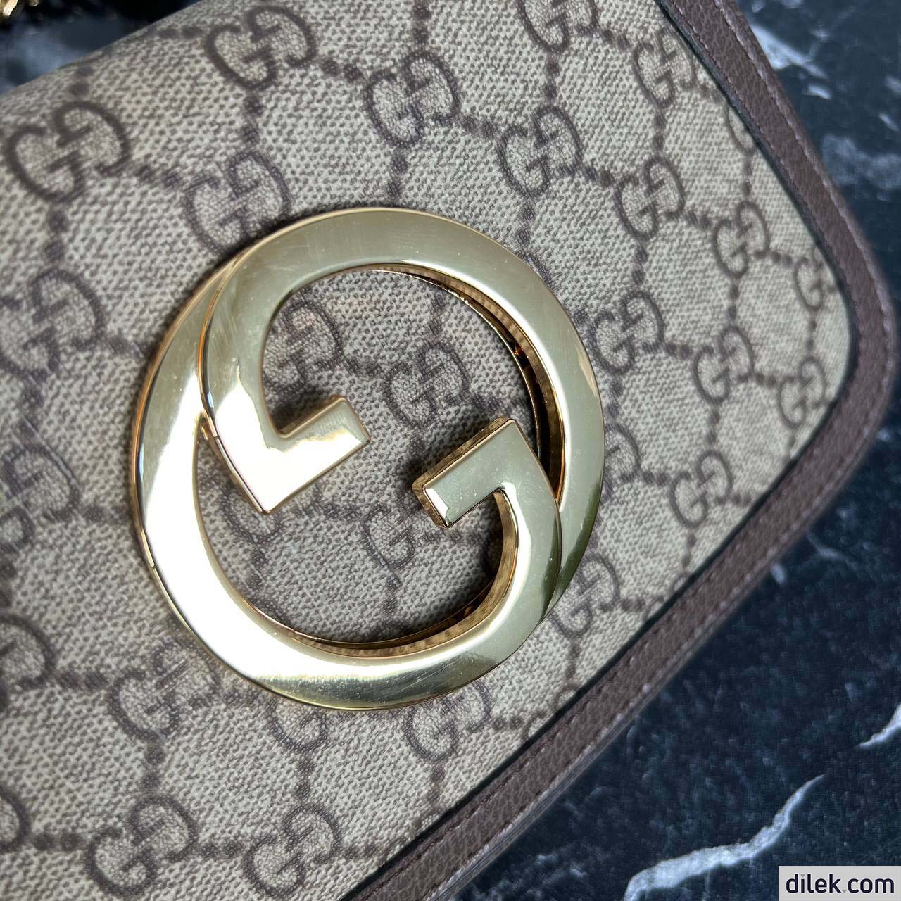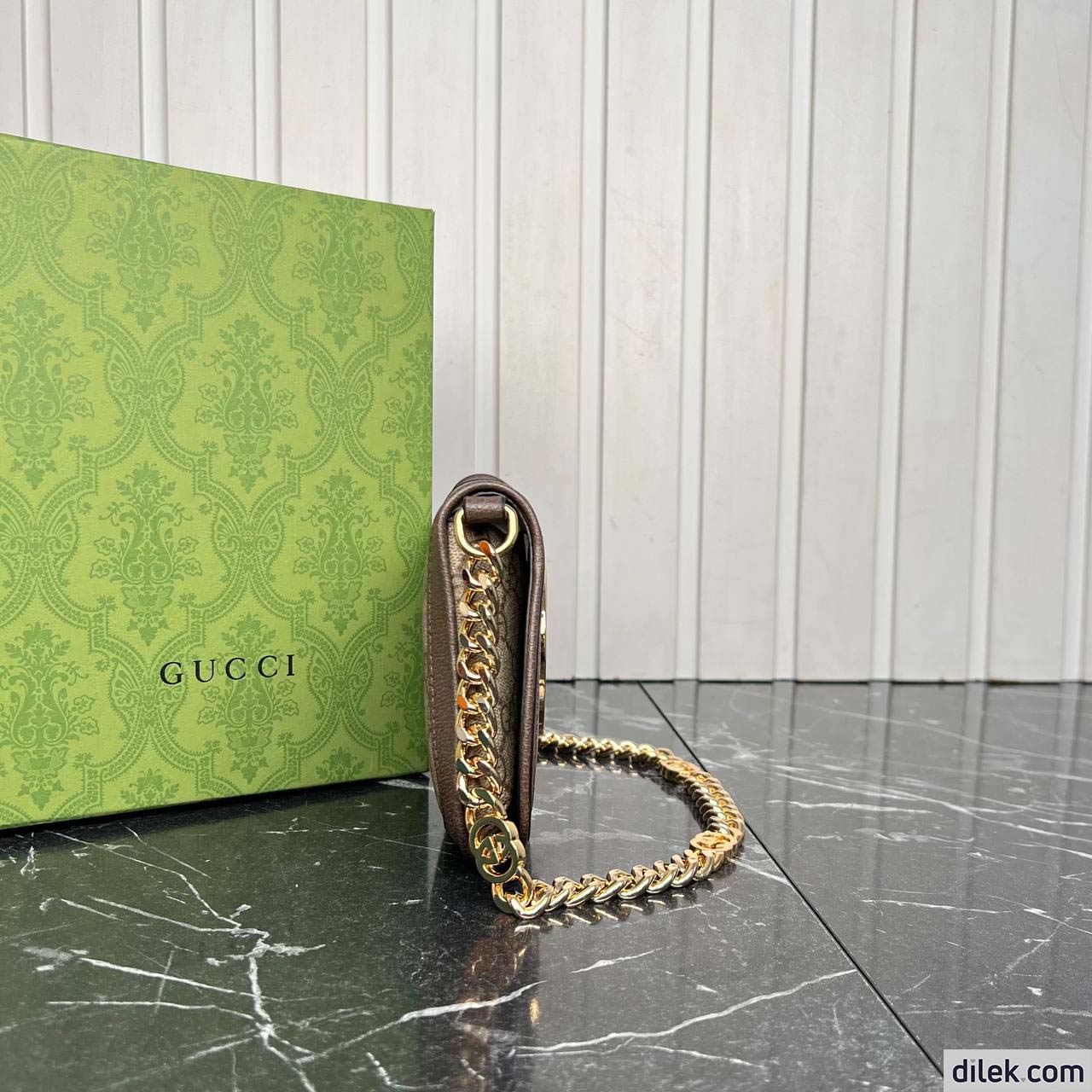 Coming from the House's archives, a geometrically shaped version of the Interlocking G appears atop a series of belts, handbags and shoes. The gold-toned hardware adds a defined vintage feel to the style, enriching the design with a timeless feel mirroring the Hollywood glamour that shaped the fashion show. The GG Supreme bag is completed by two interchangeable shoulder straps, in tonal leather or a gold-toned chain.