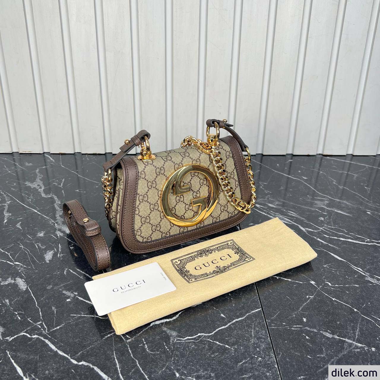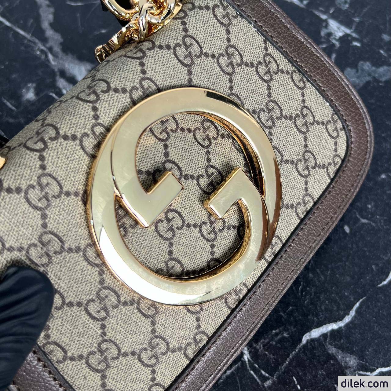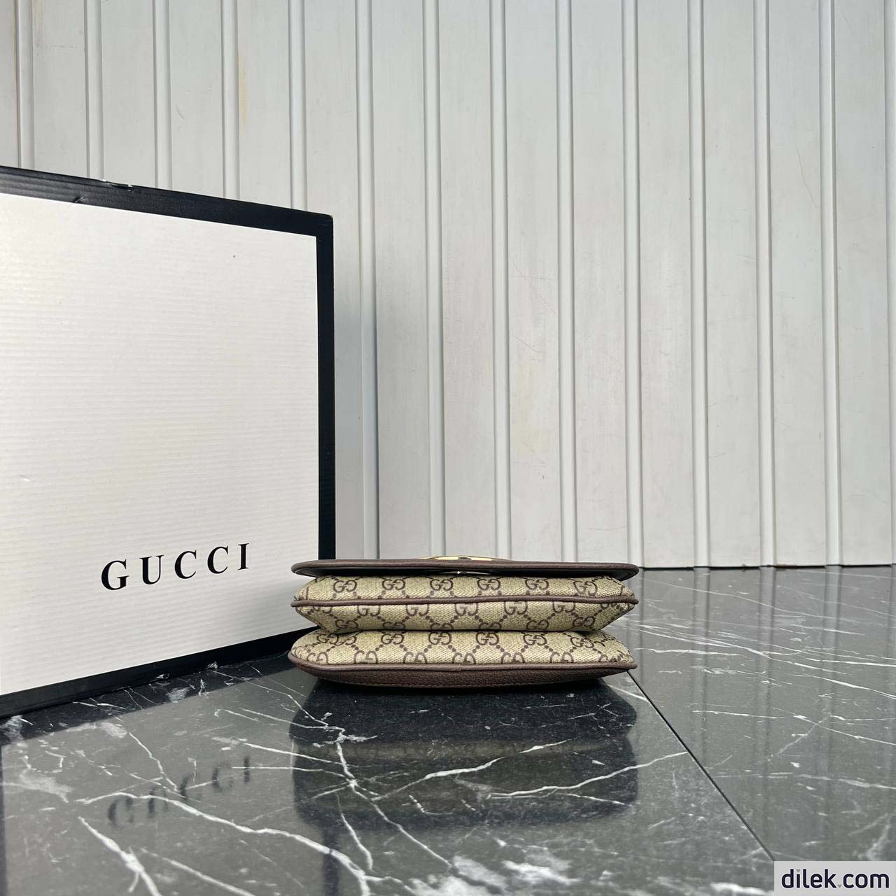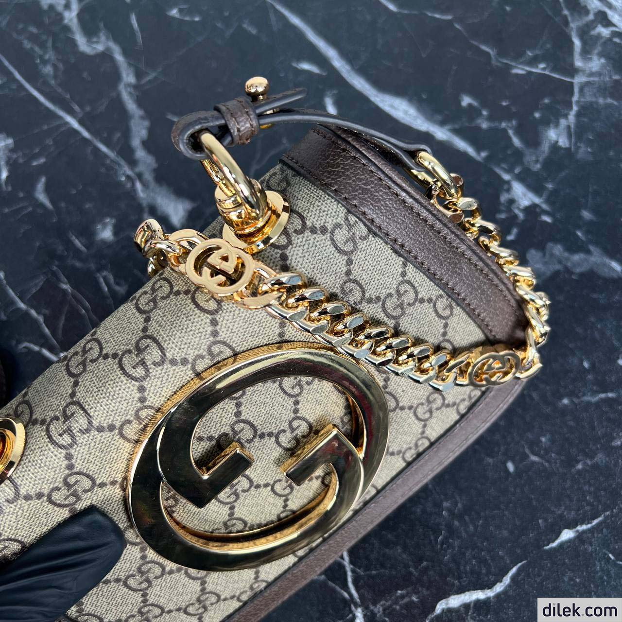 Coming from the House's archives, a geometrically shaped version of the Interlocking G appears atop a series of belts, handbags and shoes. The gold-toned hardware adds a defined vintage feel to the style, enriching the design with a timeless feel mirroring the Hollywood glamour that shaped the fashion show. The GG Supreme bag is completed by two interchangeable shoulder straps, in tonal leather or a gold-toned chain.
