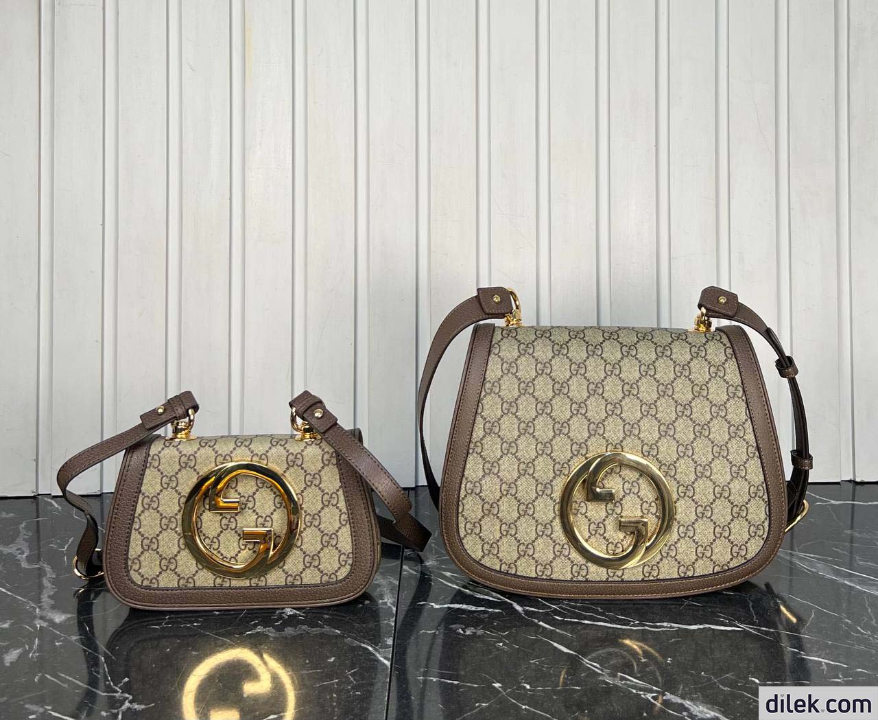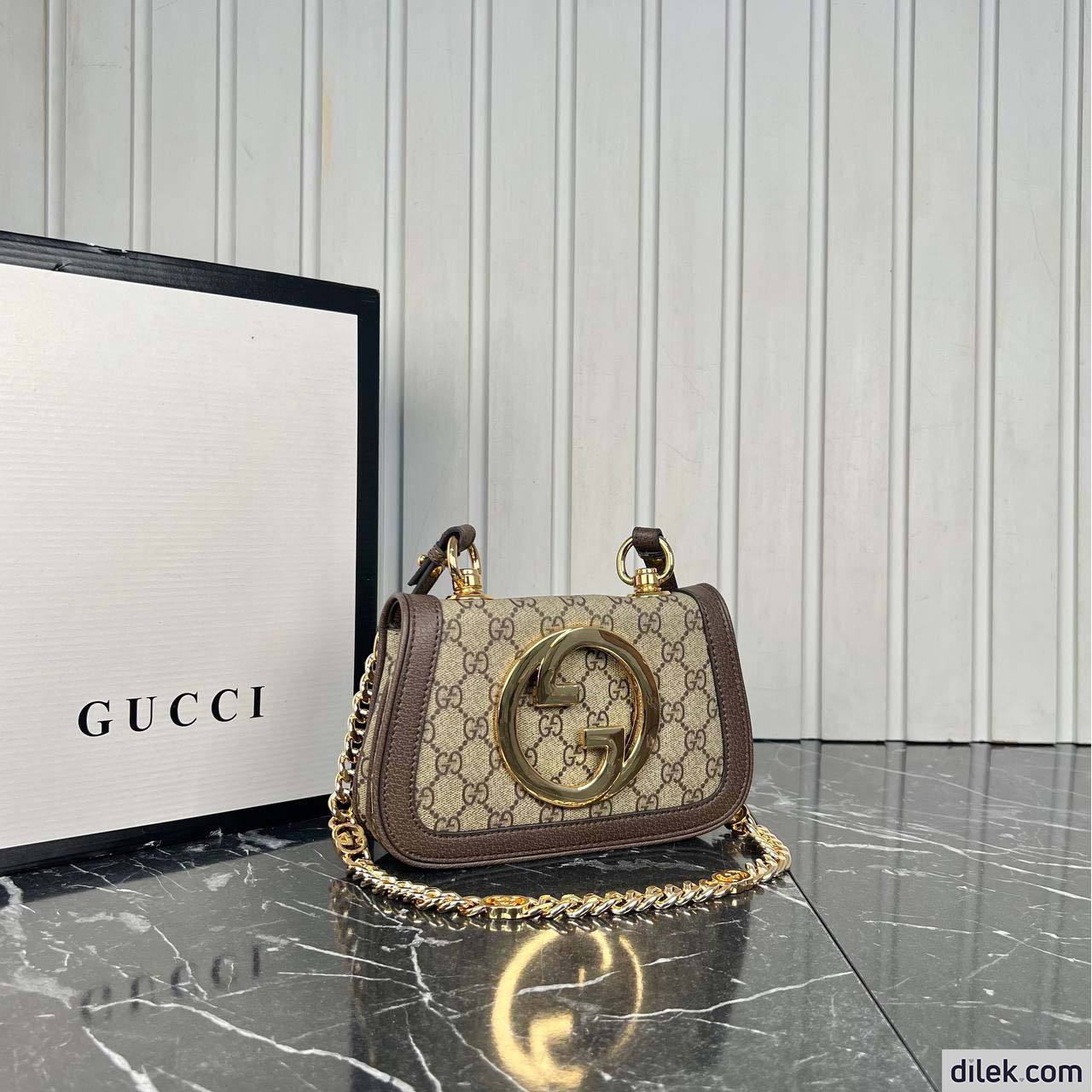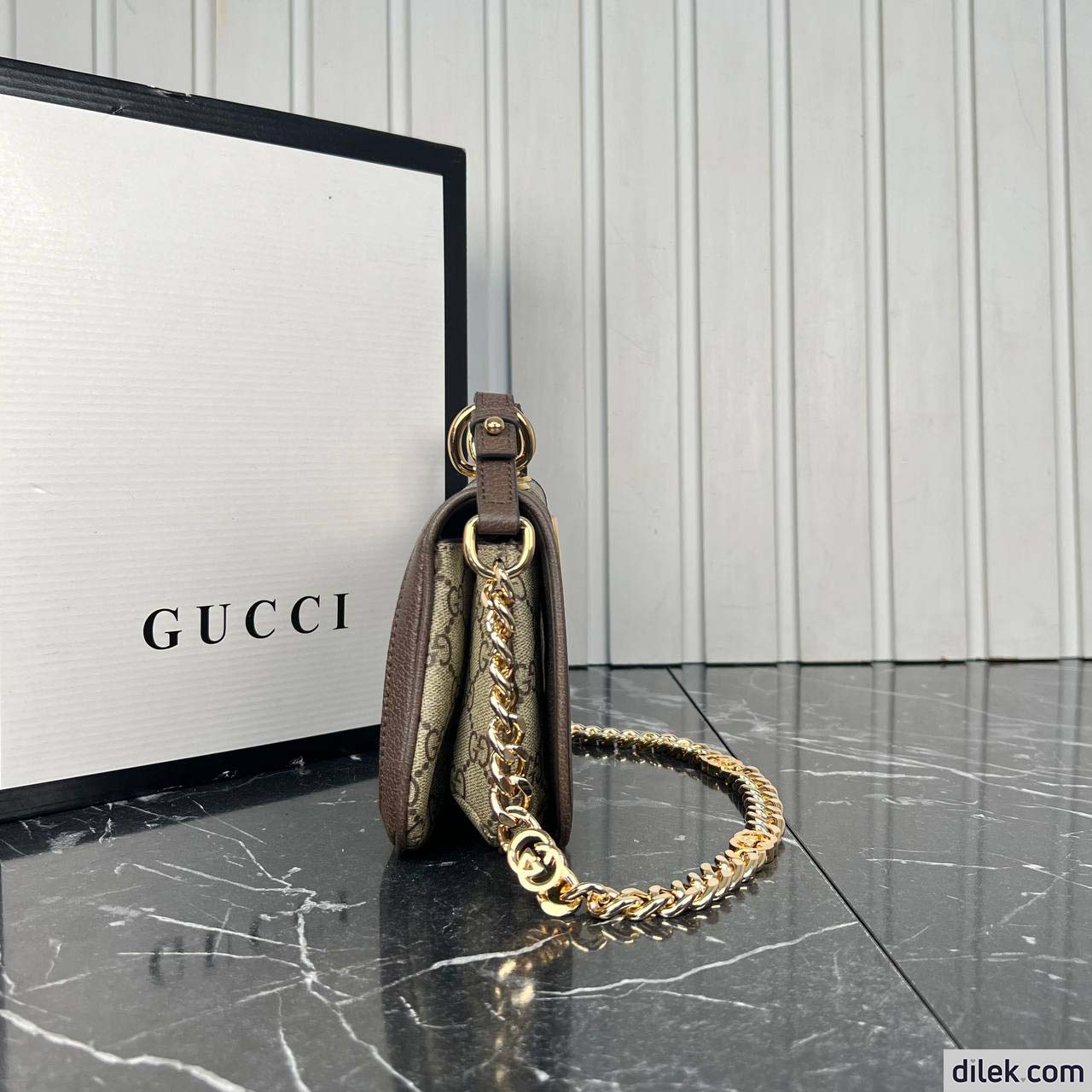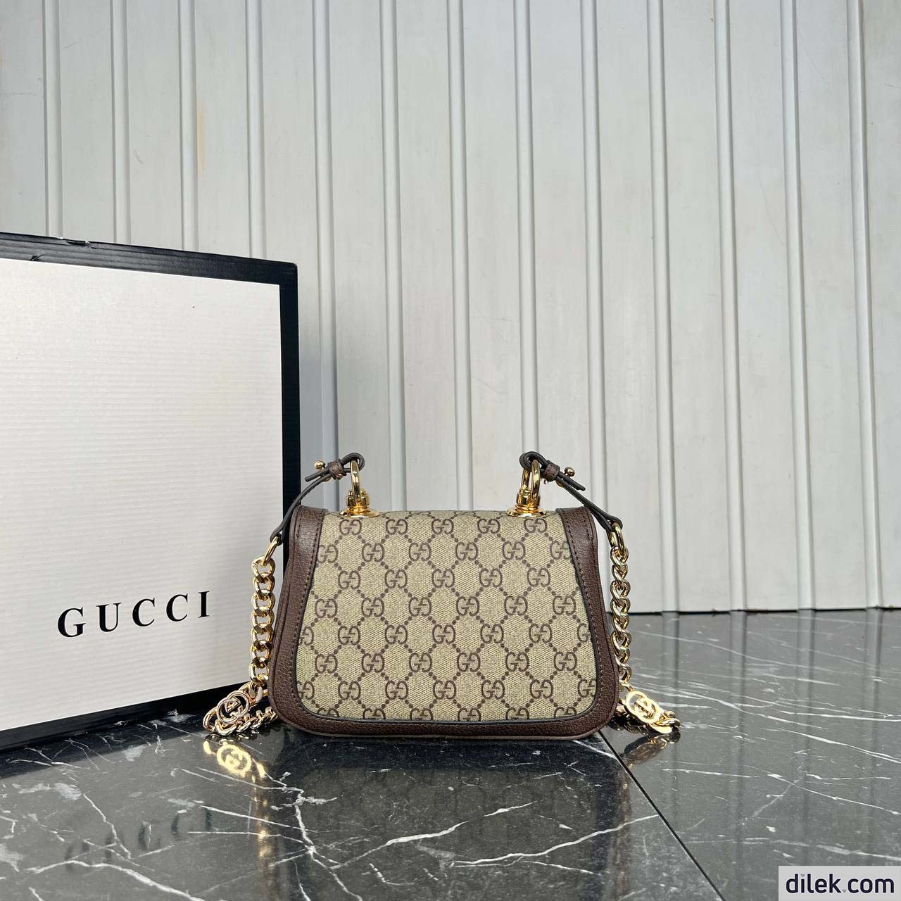 Coming from the House's archives, a geometrically shaped version of the Interlocking G appears atop a series of belts, handbags and shoes. The gold-toned hardware adds a defined vintage feel to the style, enriching the design with a timeless feel mirroring the Hollywood glamour that shaped the fashion show. The GG Supreme bag is completed by two interchangeable shoulder straps, in tonal leather or a gold-toned chain.