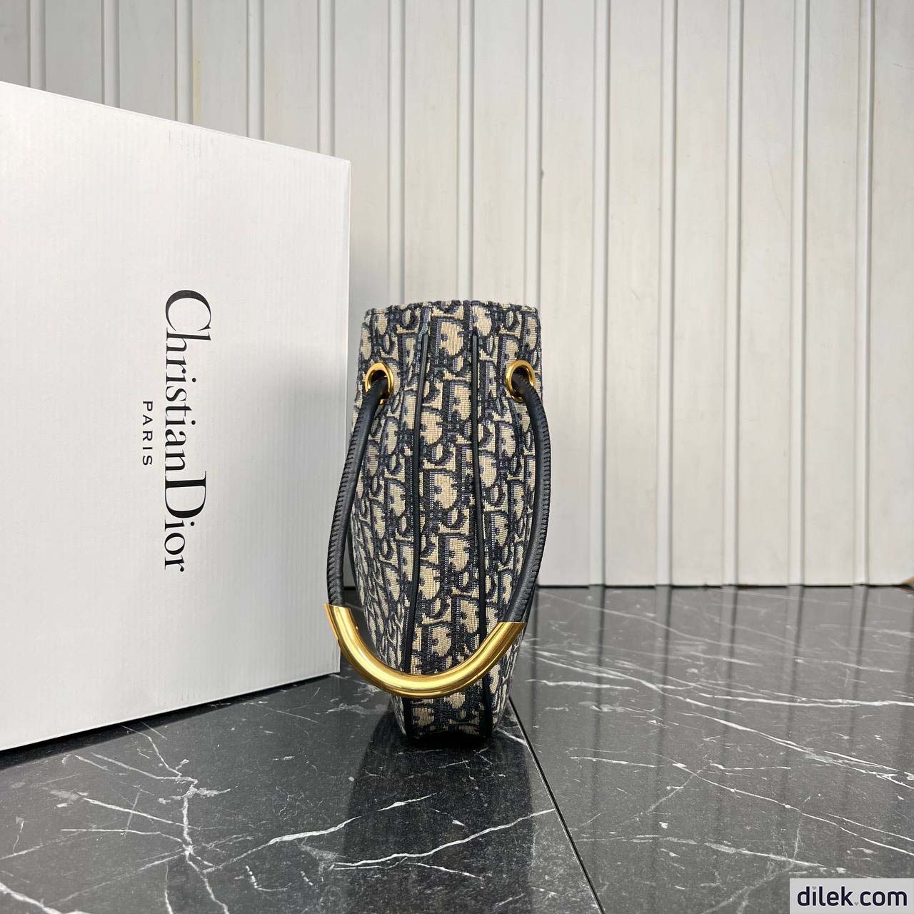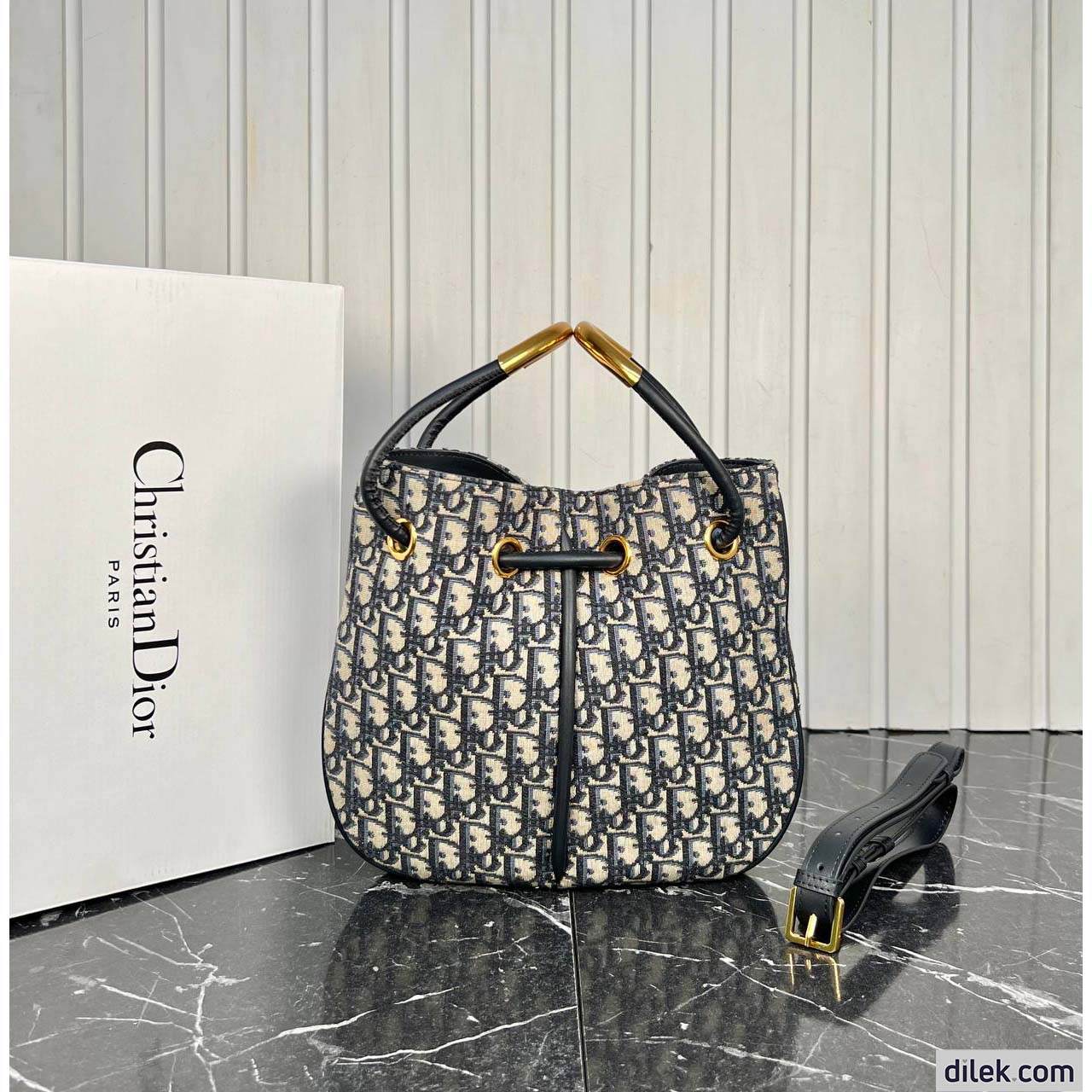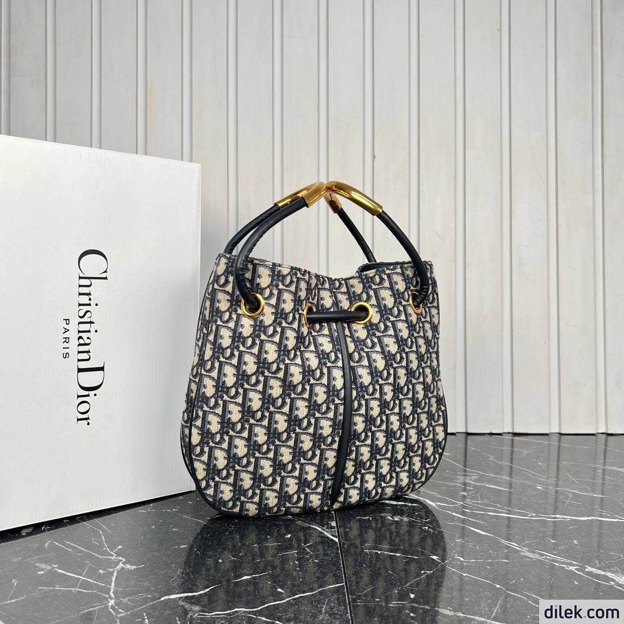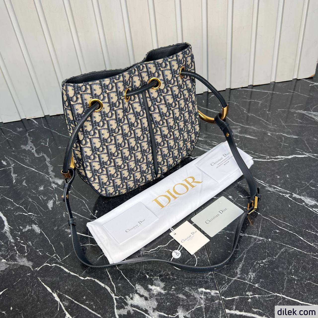 New for Fall 2024, the Dior Nolita bag redefines House codes of modern elegance with a refined and contemporary silhouette. The blue Dior Oblique jacquard is complemented by structured top handles embellished with antique gold-finish metal, as well as sliding D.I.O.R. charms which lend a touch of movement. The drawstring closure reveals a practical interior with a slip pocket, while the adjustable and removable leather strap allows the medium bag to be carried by hand, worn over the shoulder or crossbody.