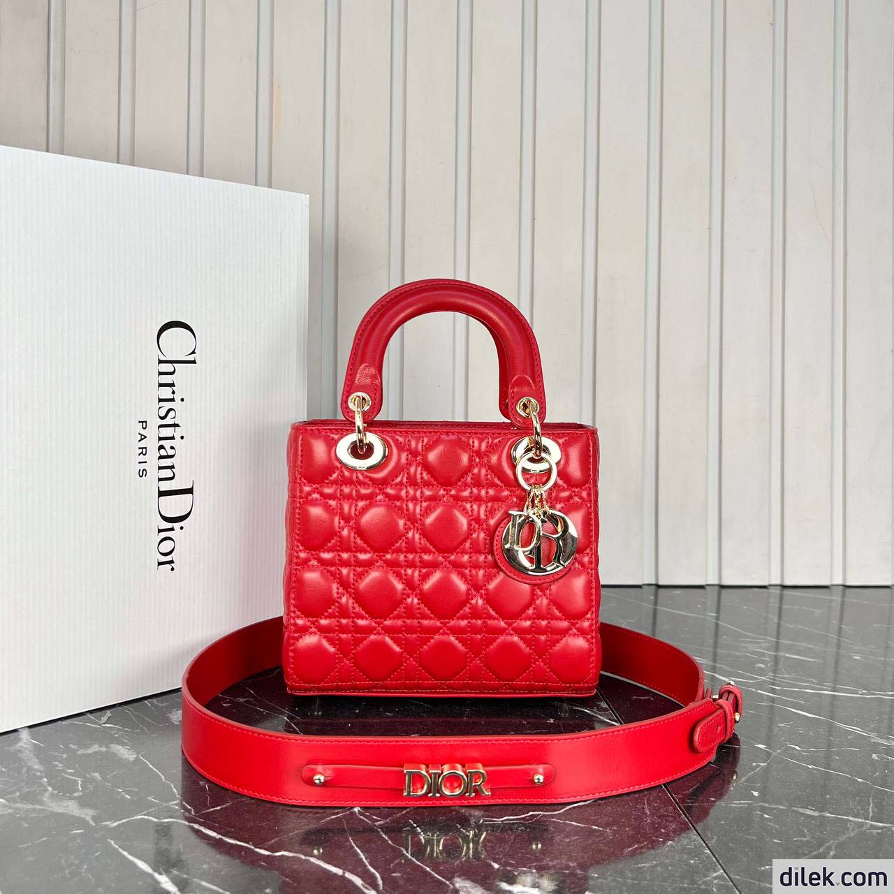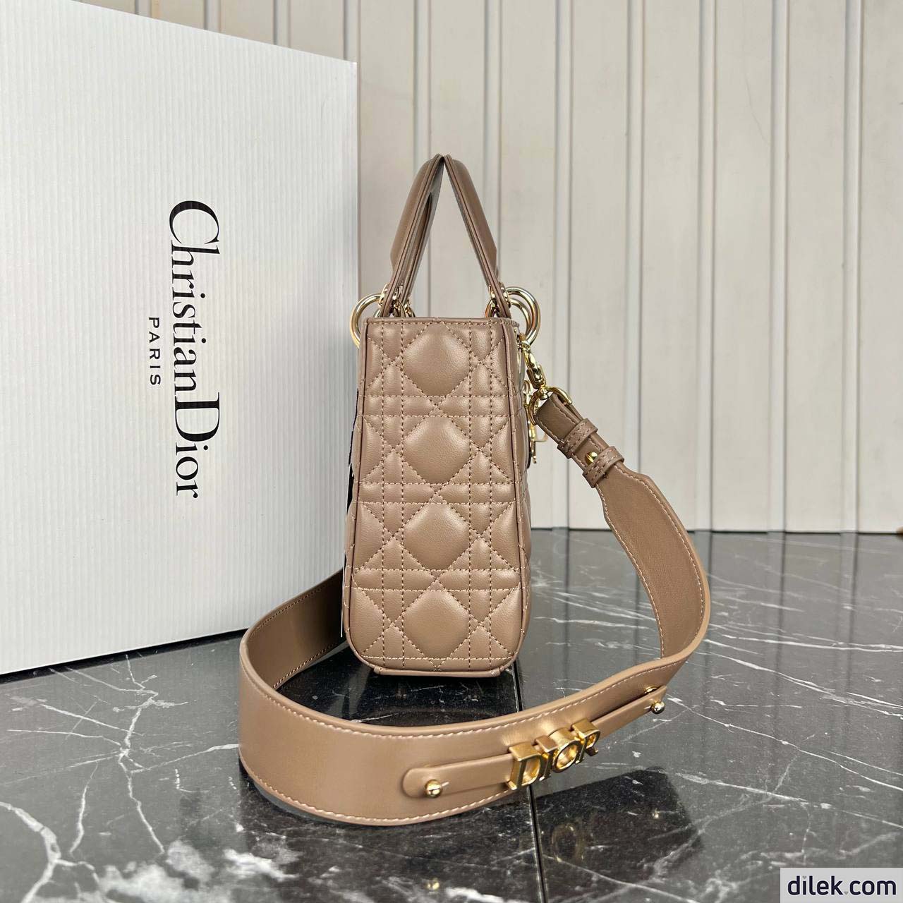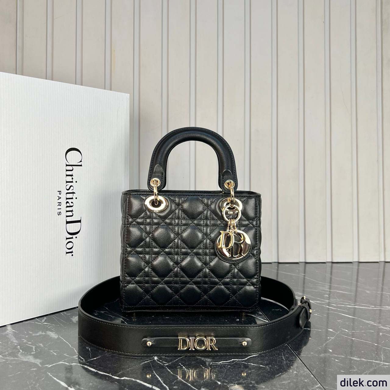 The Lady Dior bag epitomizes the House's vision of elegance and beauty. Sleek and refined, the timeless yet relevant style is crafted in black patent calfskin with Cannage stitching, creating the instantly recognizable quilted texture. The pale gold-finish metal D.I.O.R. charms complete and illuminate its silhouette. Featuring a thin, removable leather shoulder strap, the medium Lady Dior bag can be carried by hand, worn over the shoulder or crossbody.