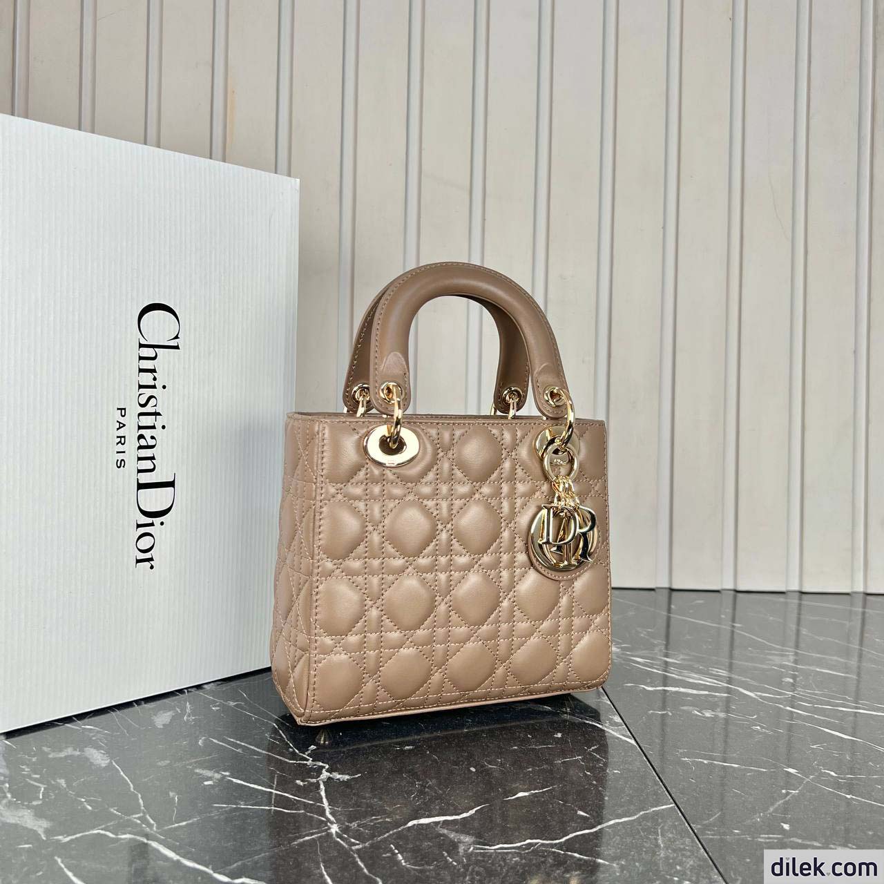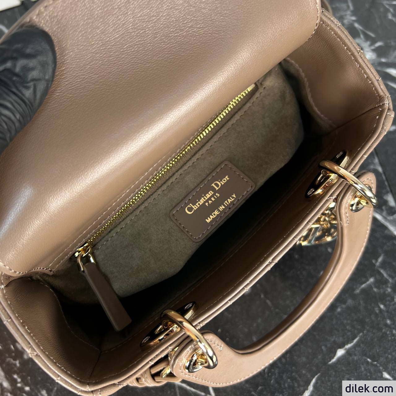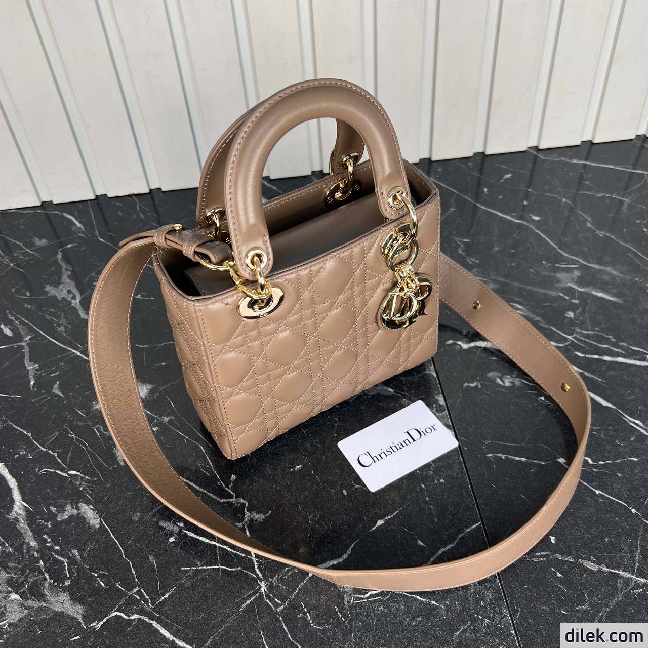 The Lady Dior bag epitomizes the House's vision of elegance and beauty. Sleek and refined, the timeless yet relevant style is crafted in black patent calfskin with Cannage stitching, creating the instantly recognizable quilted texture. The pale gold-finish metal D.I.O.R. charms complete and illuminate its silhouette. Featuring a thin, removable leather shoulder strap, the medium Lady Dior bag can be carried by hand, worn over the shoulder or crossbody.
