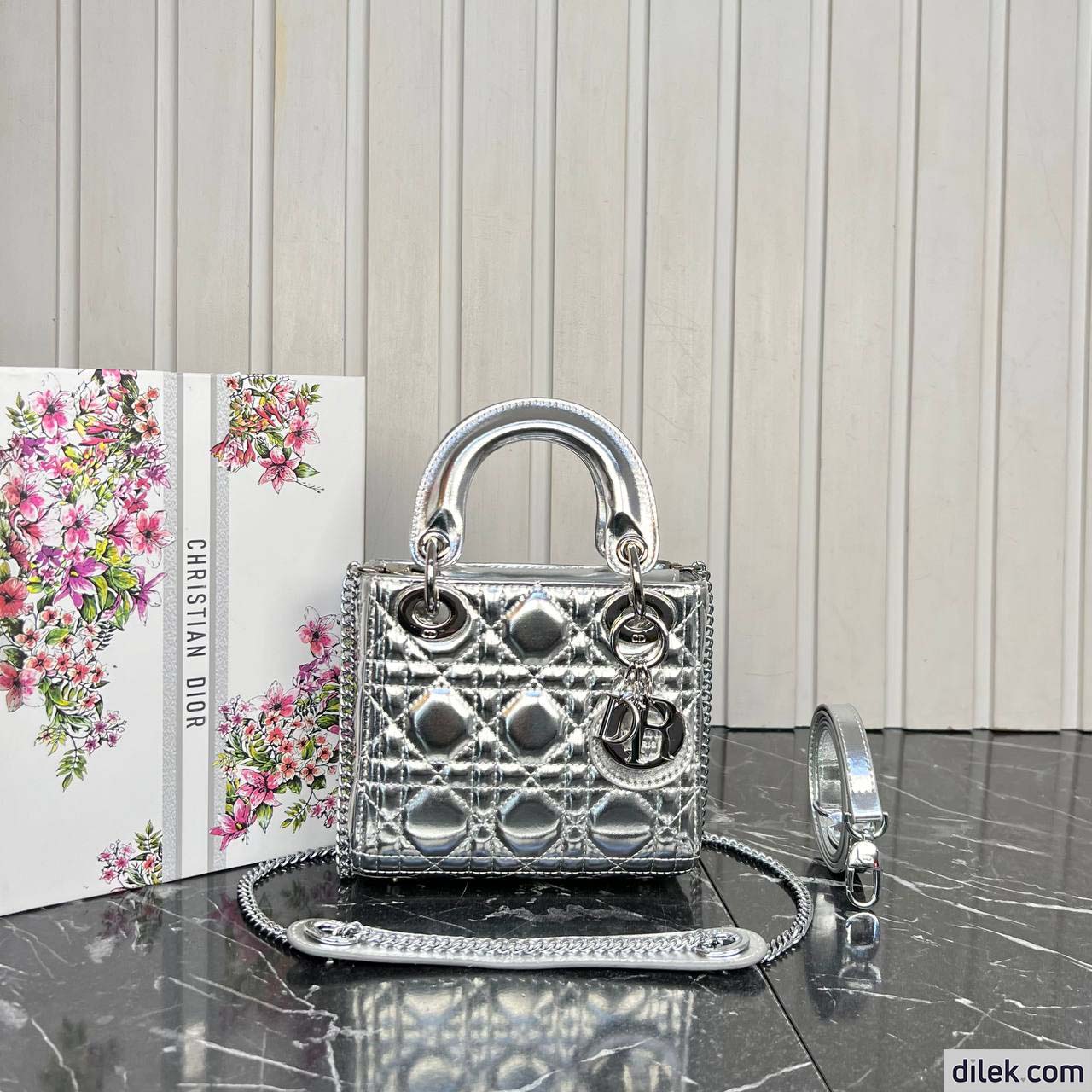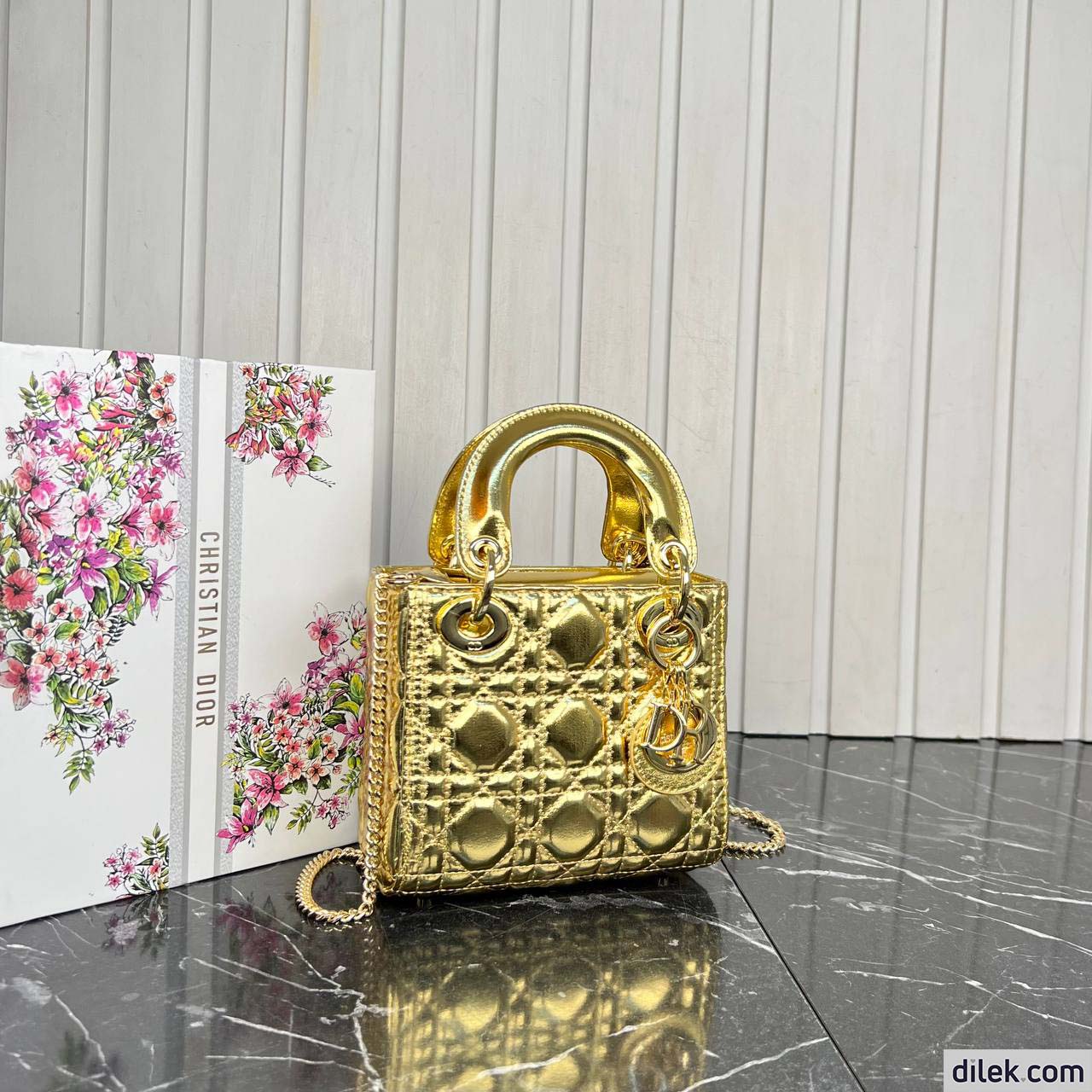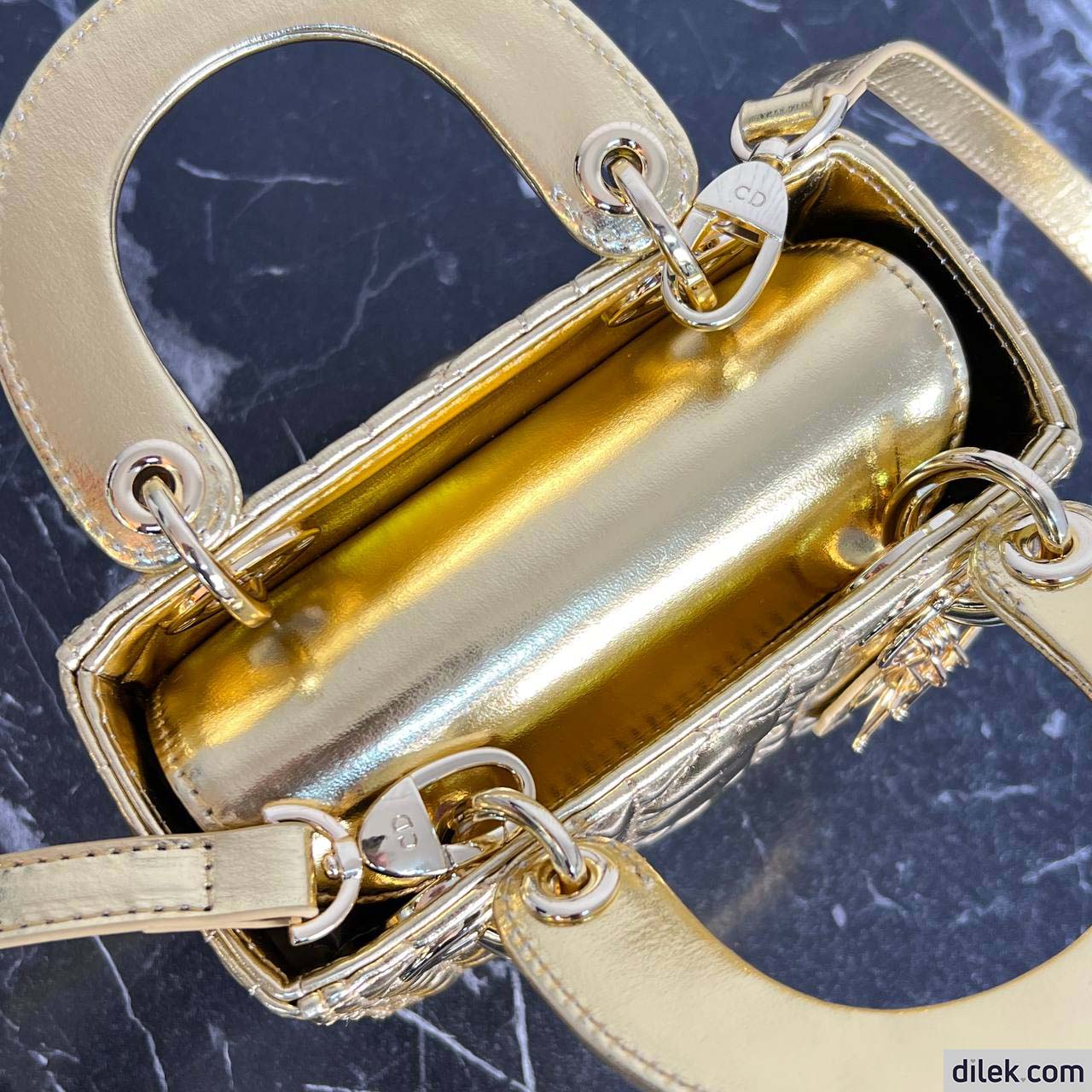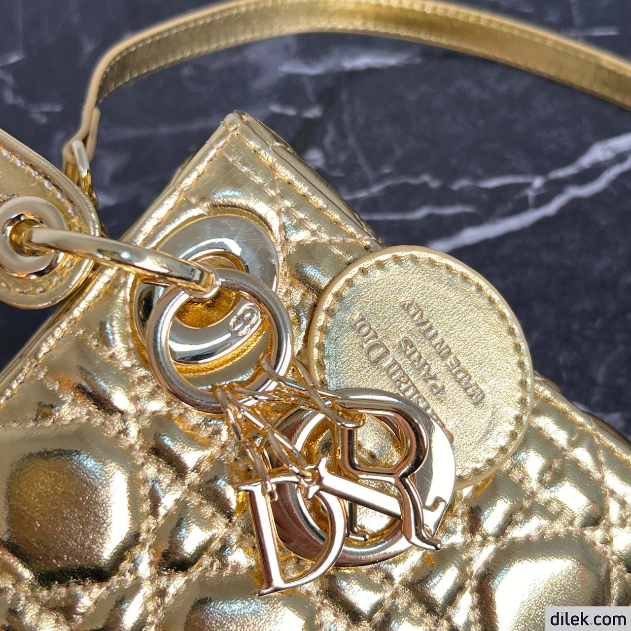 The Lady Dior bag epitomizes the House's vision of elegance and beauty. Refined and sleek, the timeless creation is crafted in black patent calfskin and covered with Cannage stitching, creating an instantly recognizable quilted texture. The pale gold-finish metal D.I.O.R. charms embellish and illuminate its silhouette. Featuring a removable chain shoulder strap, the miniature Lady Dior bag can be carried by hand or worn crossbody as an ideal evening wear companion.