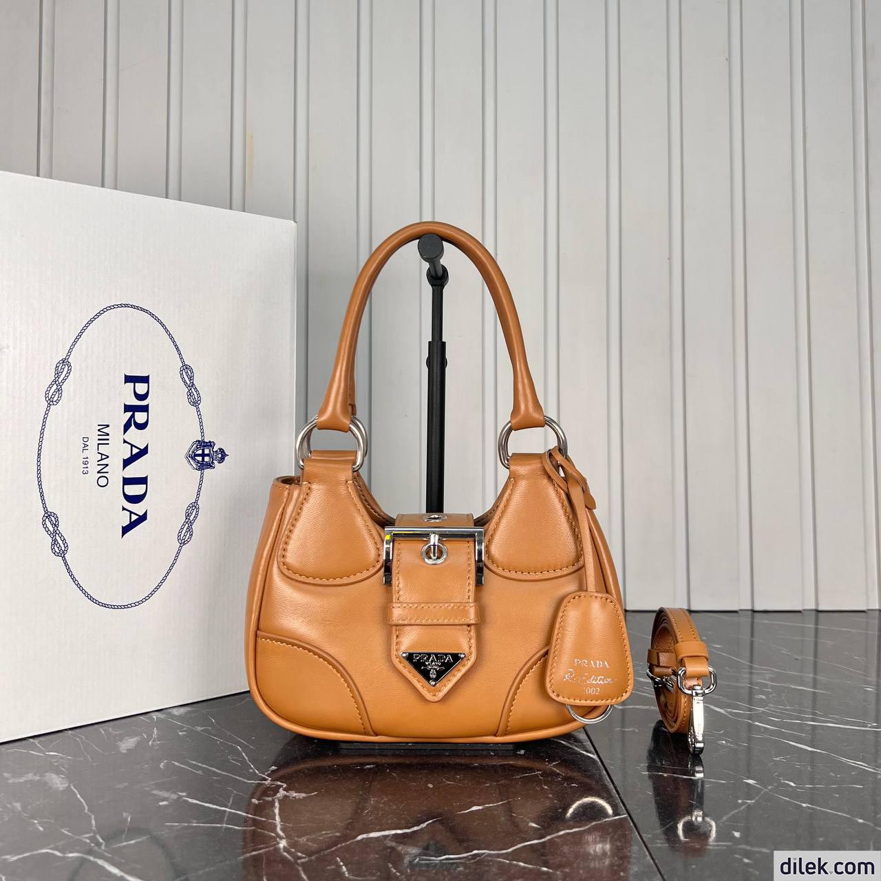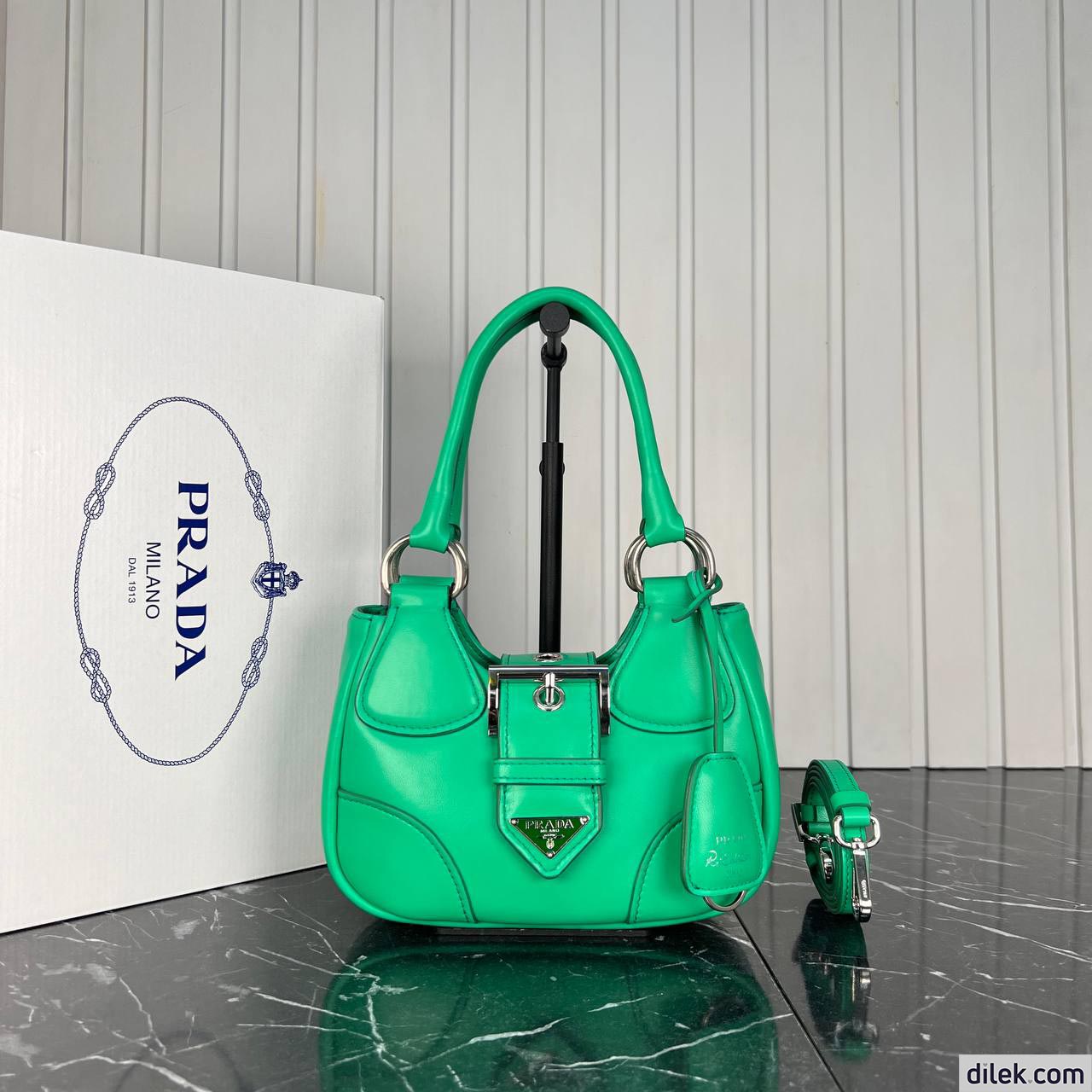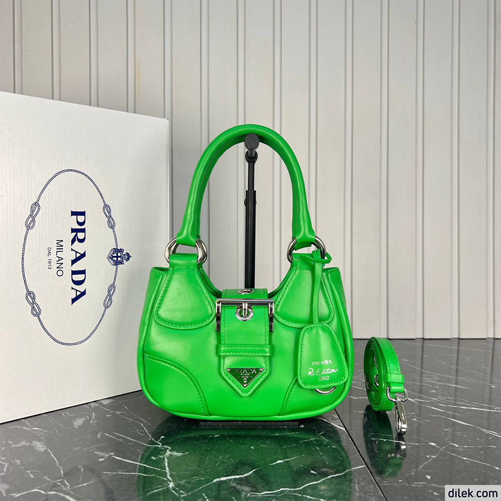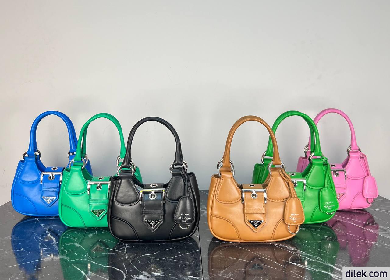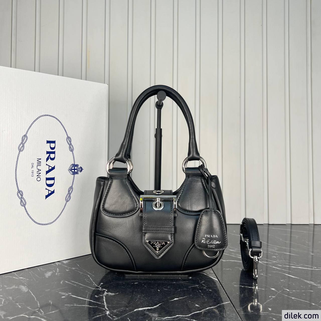 The conceptual expressive form of Prada becomes the emblem of the design of the Prada Moon bag, which revisits the lines of an iconic style of the 2000s. The observation of apparently distant areas leads to innovative combinations and a reinterpretation of conventional aesthetic rules. Characterized by a harmonious and compact silhouette, this bag stands out for details that recall different worlds: the iconic Prada grommet that comes from the sailing world becomes a functional element, accompanying the large buckle with sporty allure. The enameled metal triangle logo, which first appeared in 1913 on trunks designed by Mario Prada, turns into a structural detail of the front strap closure.