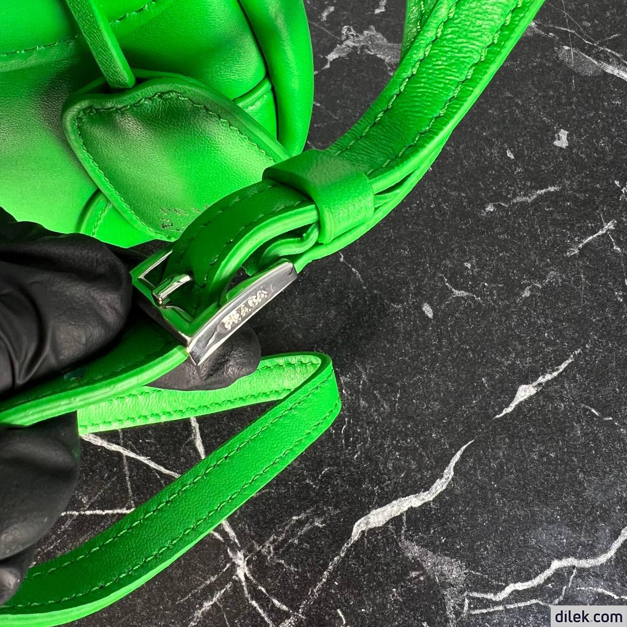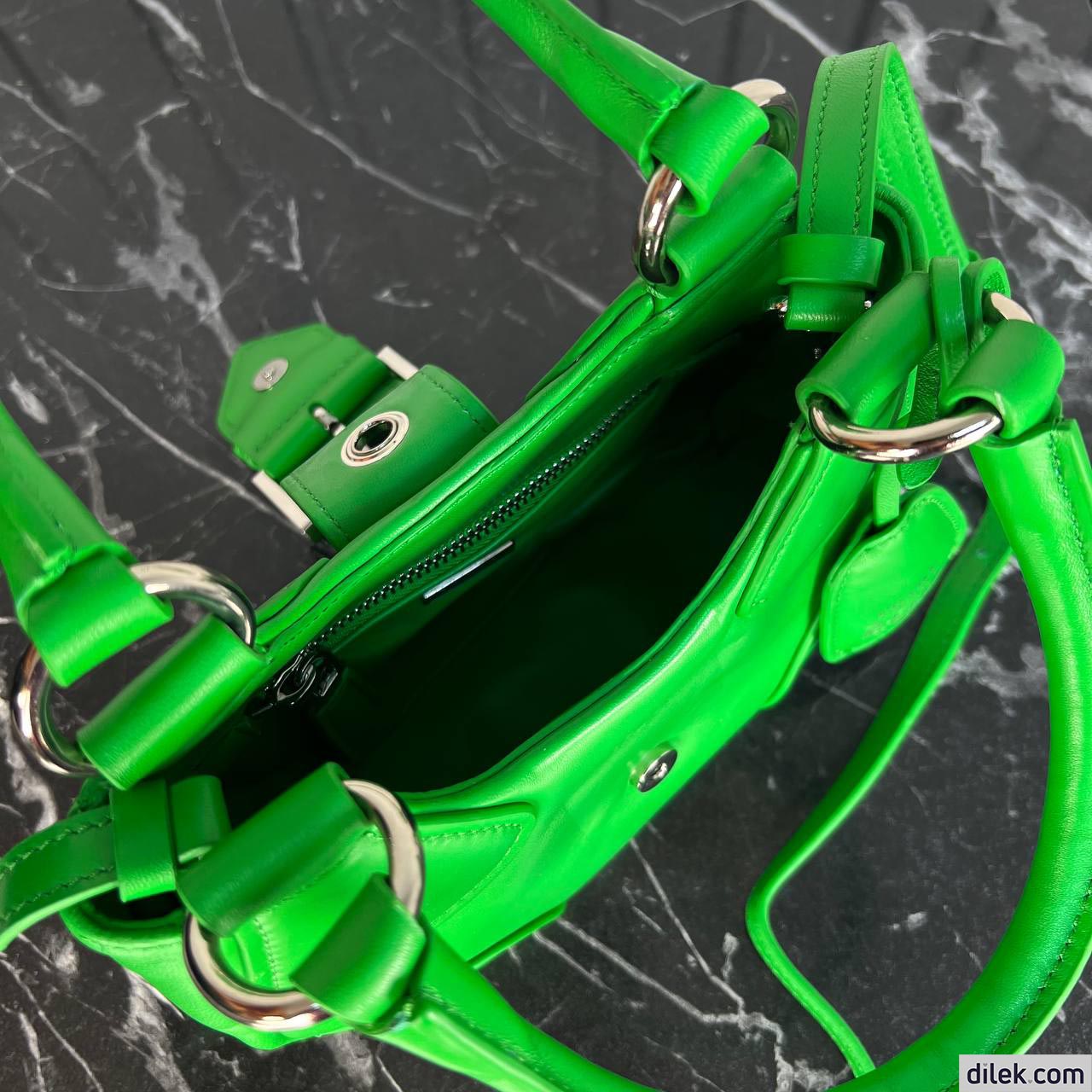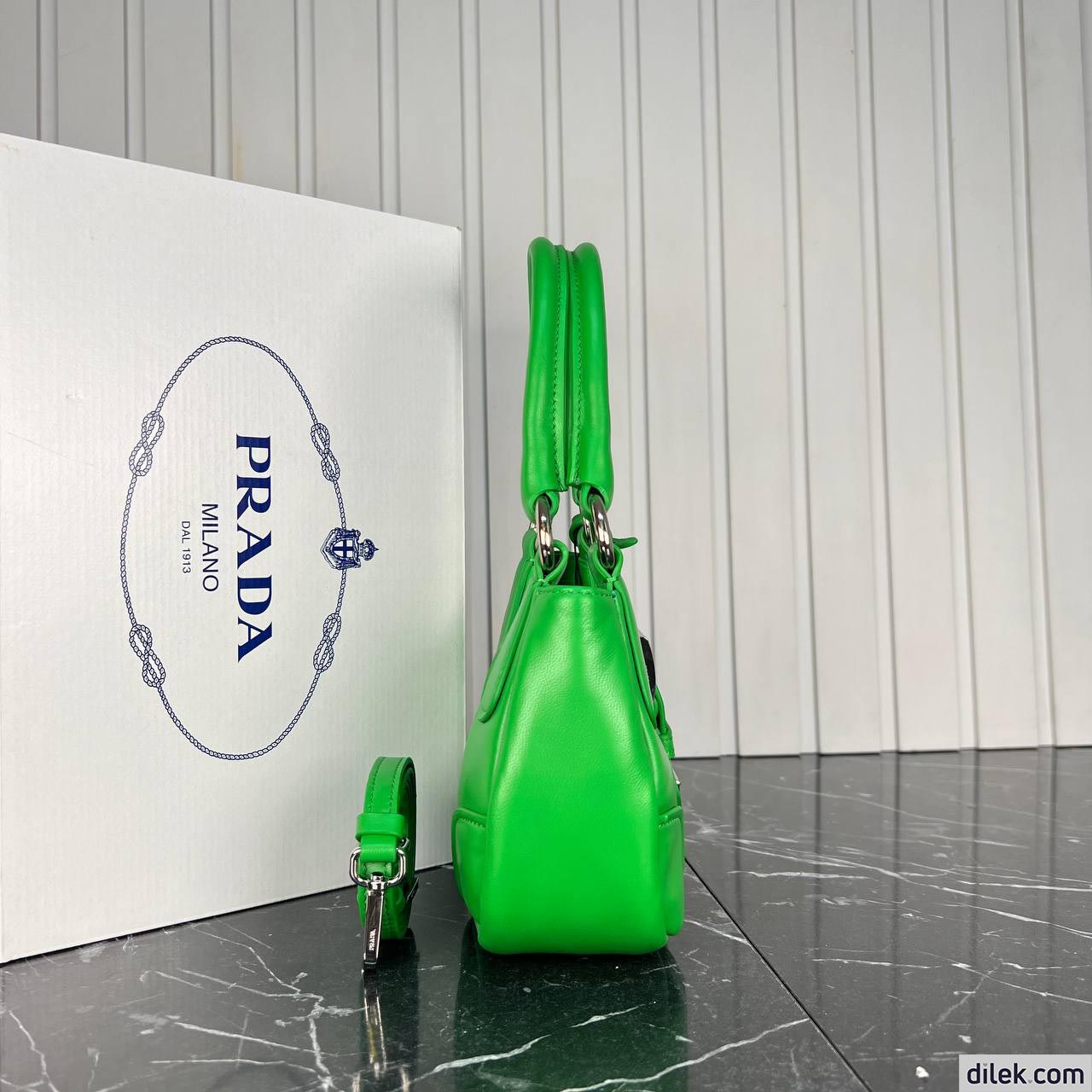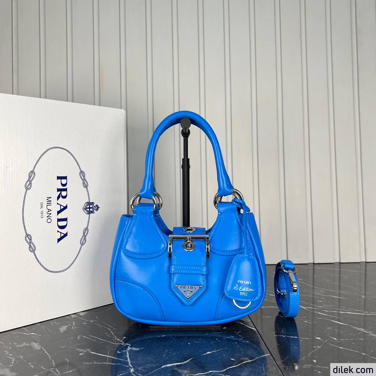 The conceptual expressive form of Prada becomes the emblem of the design of the Prada Moon bag, which revisits the lines of an iconic style of the 2000s. The observation of apparently distant areas leads to innovative combinations and a reinterpretation of conventional aesthetic rules. Characterized by a harmonious and compact silhouette, this bag stands out for details that recall different worlds: the iconic Prada grommet that comes from the sailing world becomes a functional element, accompanying the large buckle with sporty allure. The enameled metal triangle logo, which first appeared in 1913 on trunks designed by Mario Prada, turns into a structural detail of the front strap closure.