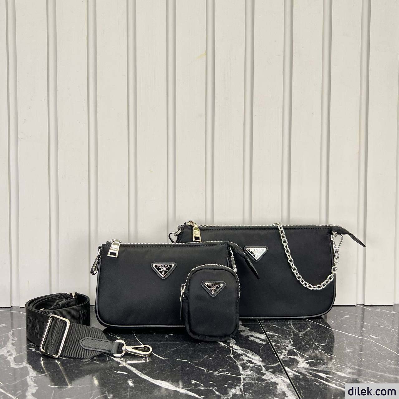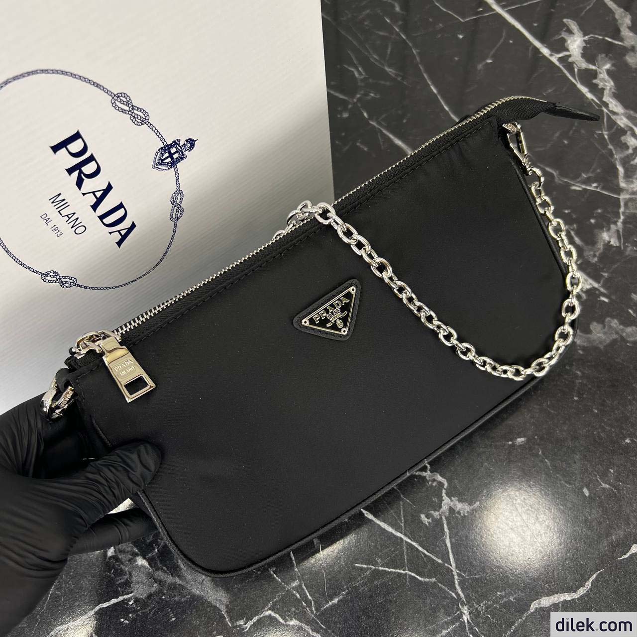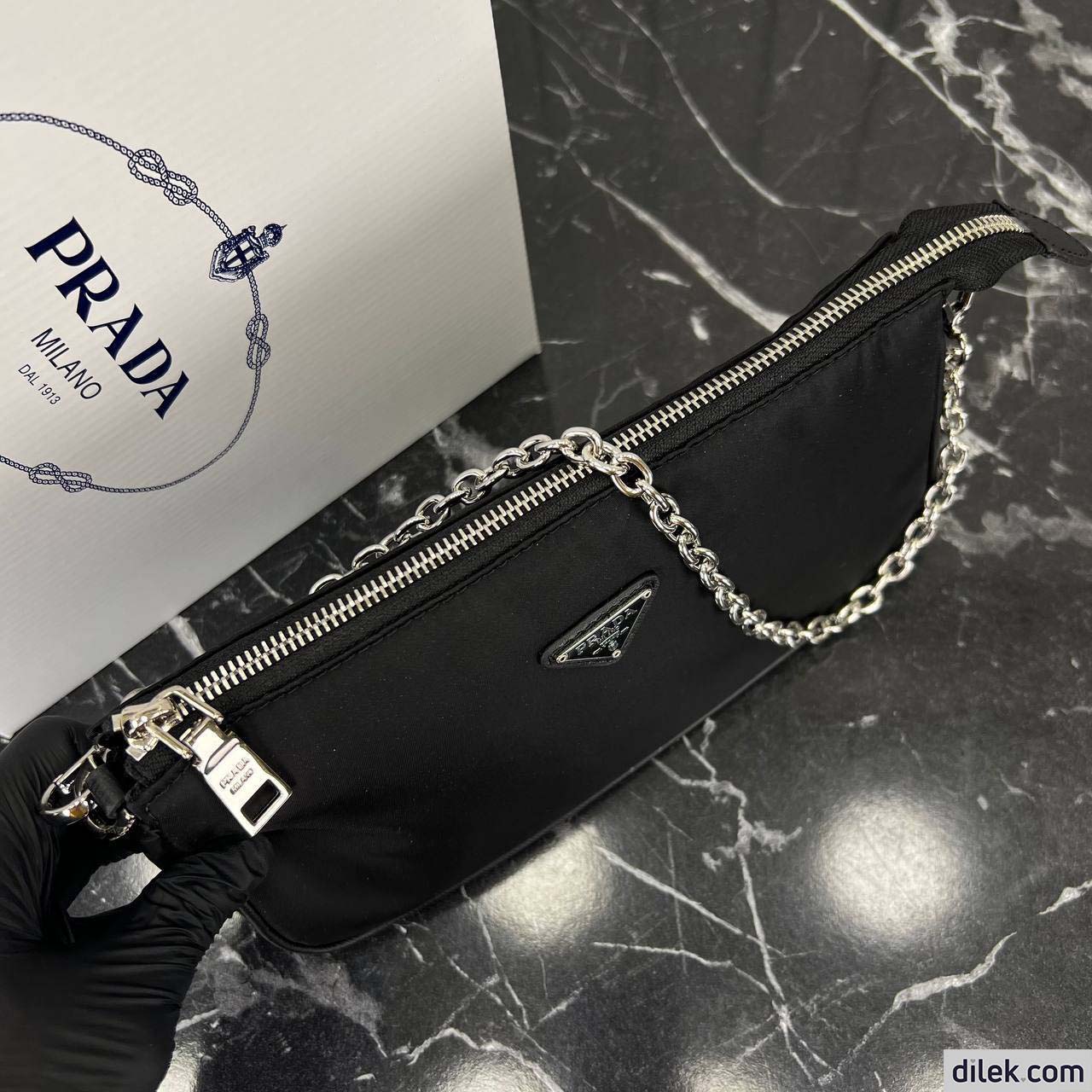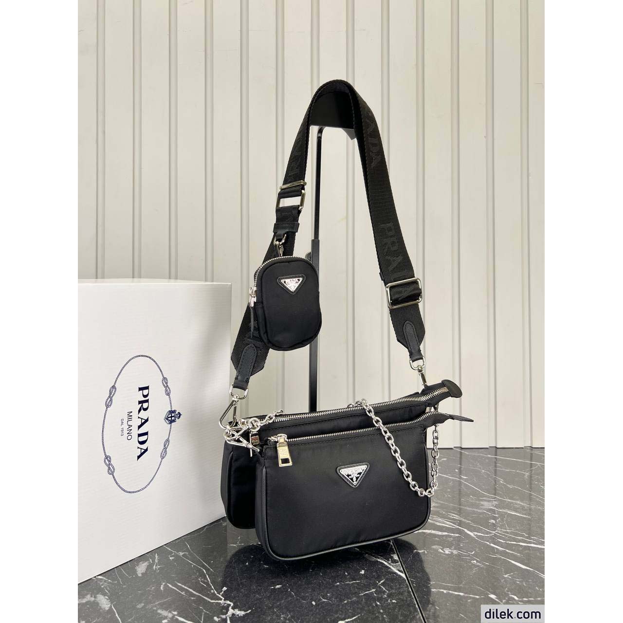 Sleek, harmonious lines define the silhouette of this mini-bag with a casual attitude. The design combines pragmatic Re-Nylon, the innovative regenerated nylon material, with refined brushed leather details and metal hardware. The accessory, decorated with the enameled metal triangle logo, is completed by an external pocket for a versatile, contemporary touch.