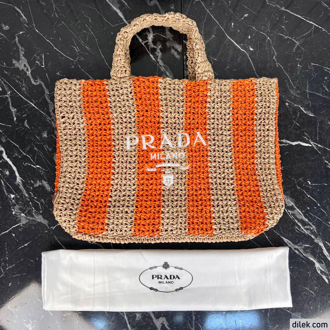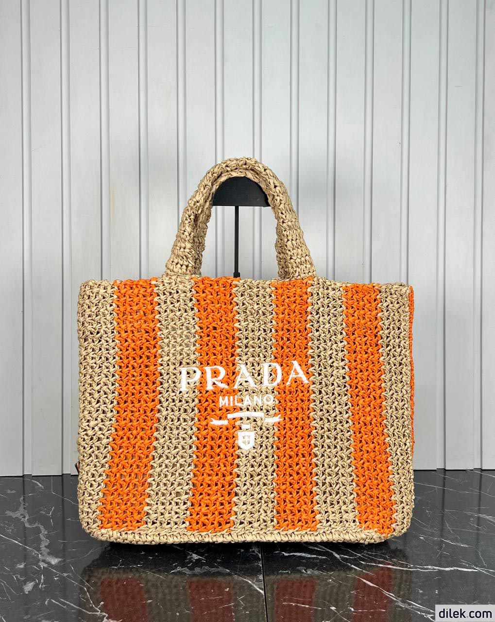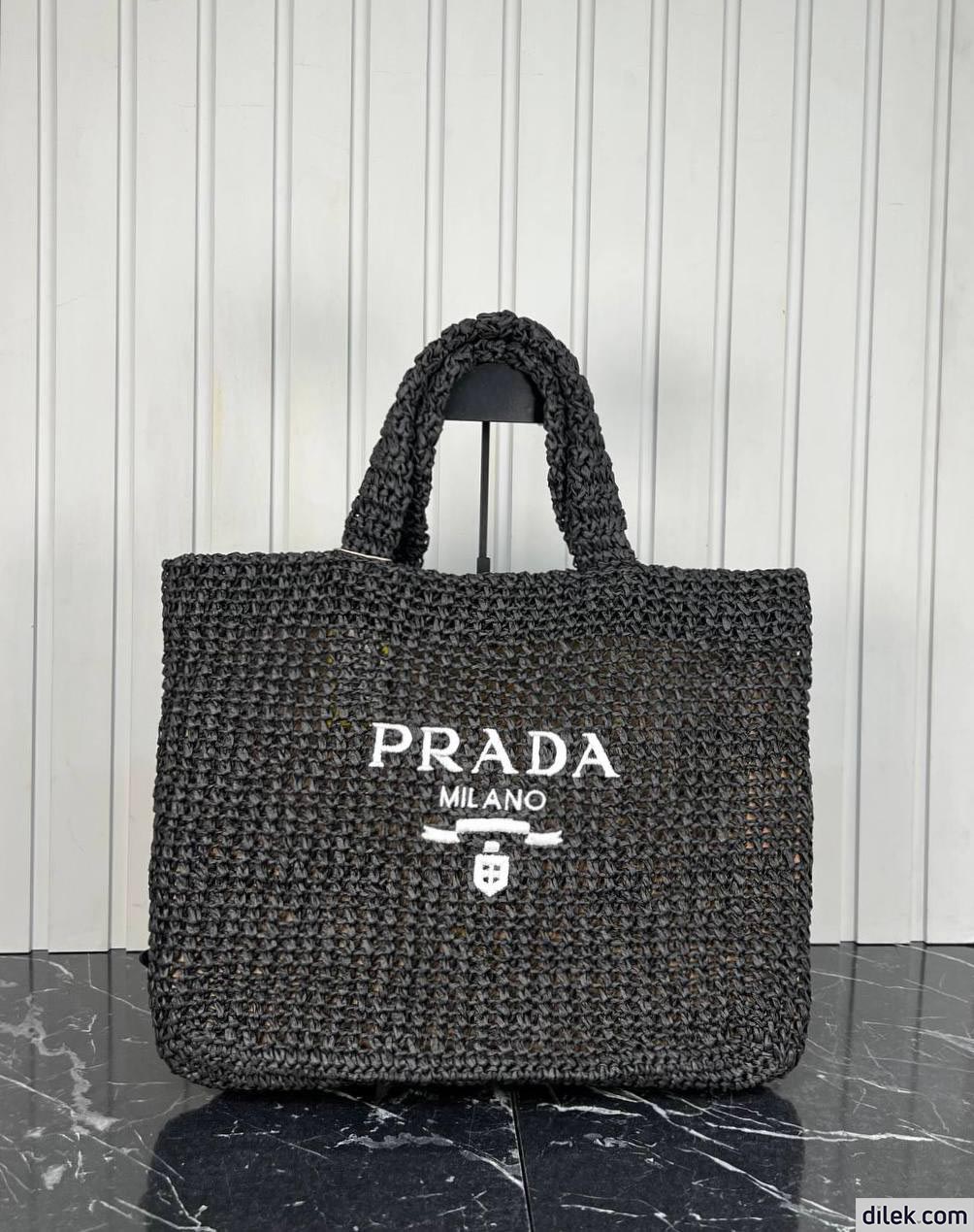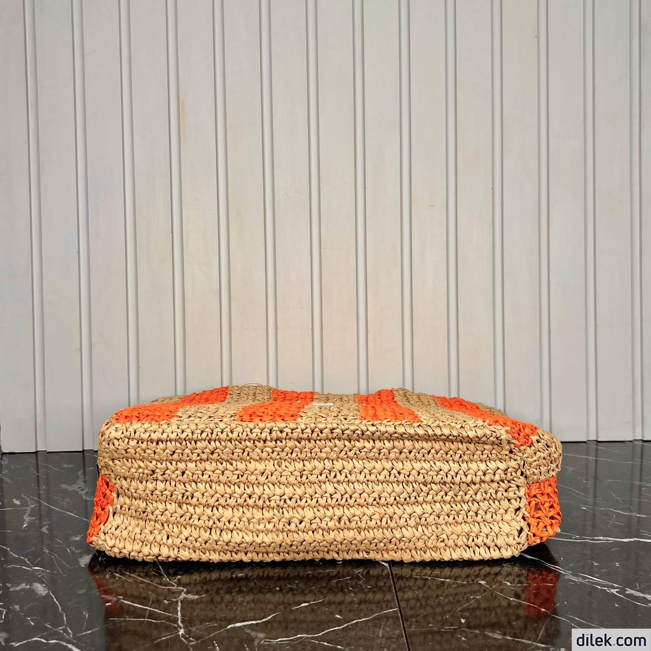 This tote bag with a soft, deconstructed design is made of raffia, a light material of natural origin with a summery mood. The embroidered lettering logo adorns the front, while the emblematic enameled metal triangle logo decorates the side.